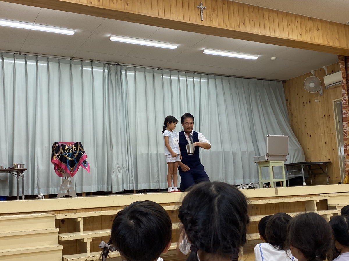 おにぎりを食べ、幼稚園に帰ってきました。おやつに、冷たいアイスを食べました!そしてお待ちかねのお楽しみ!!なんと、ジャック先生のマジックショーでした☆マジックには、子どもたちも先生たちもたくさん驚かされました!ジャック先生、楽しいマジックショーをありがとうございました♪