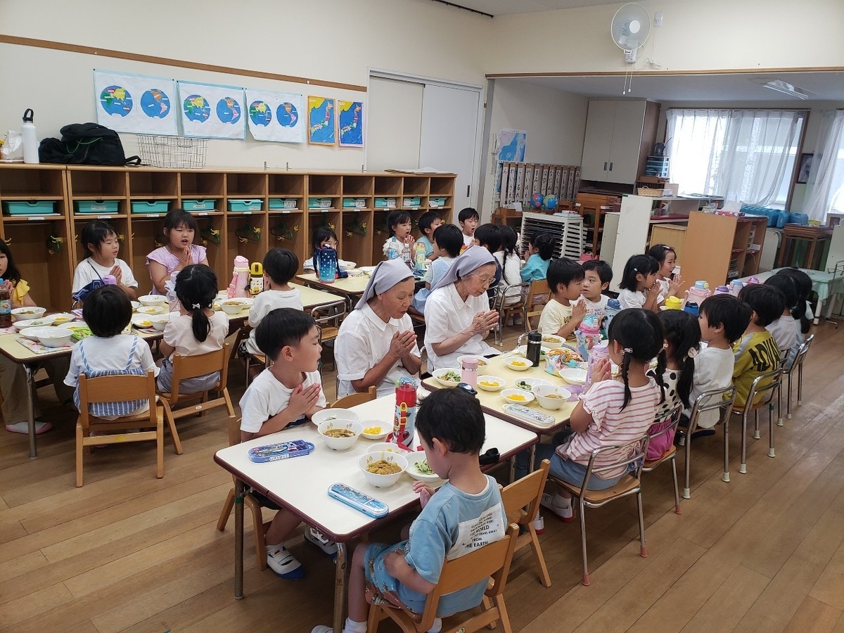 Aグループ(5歳児)のデイキャンプがありました。まずは、1日安全に楽しく過ごせるように朝のお祈りをします。そして、バスに乗って出発!