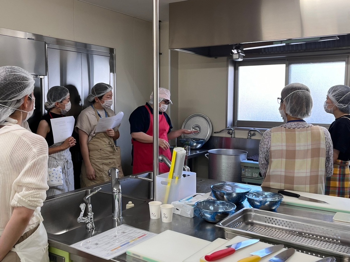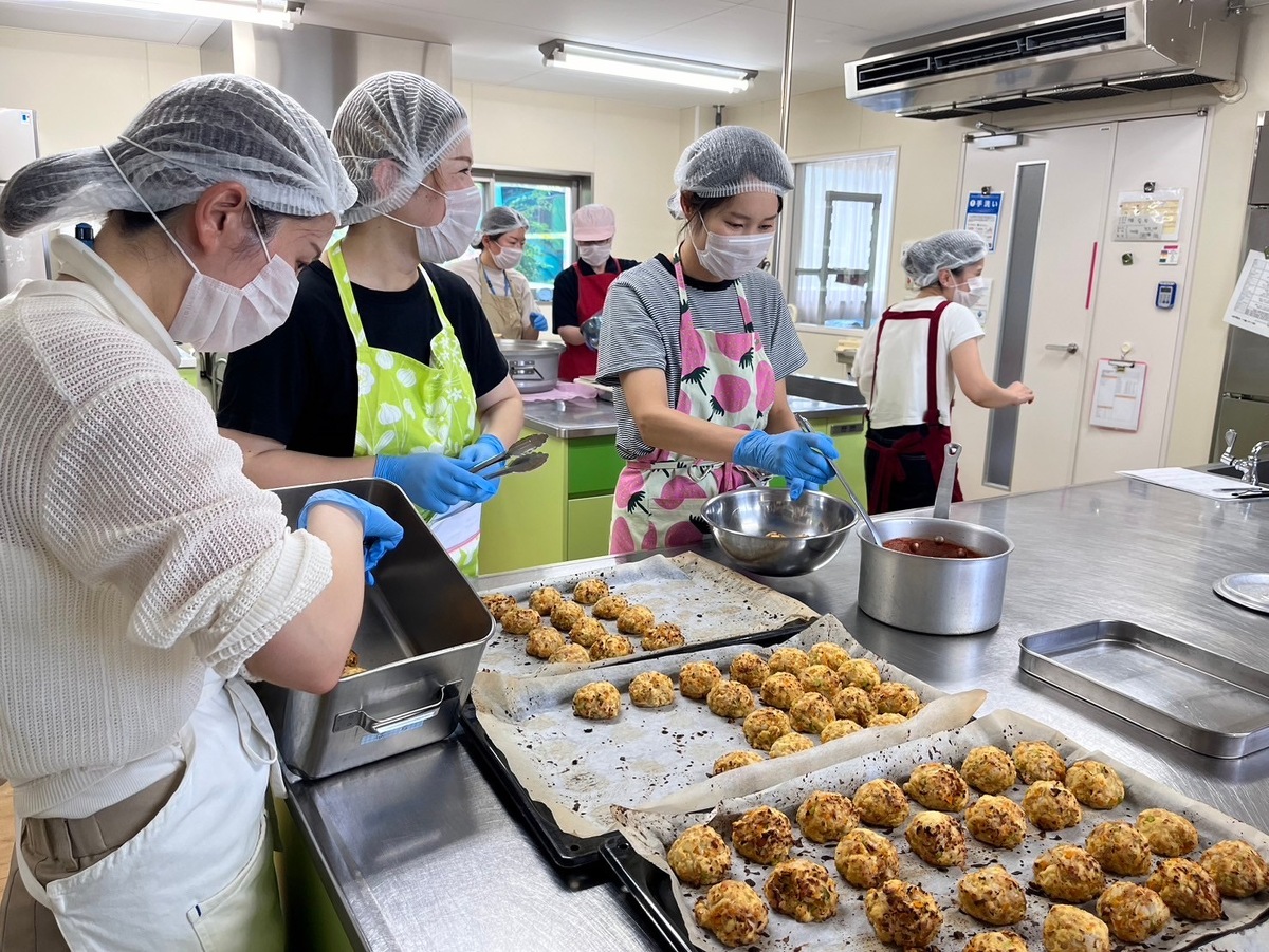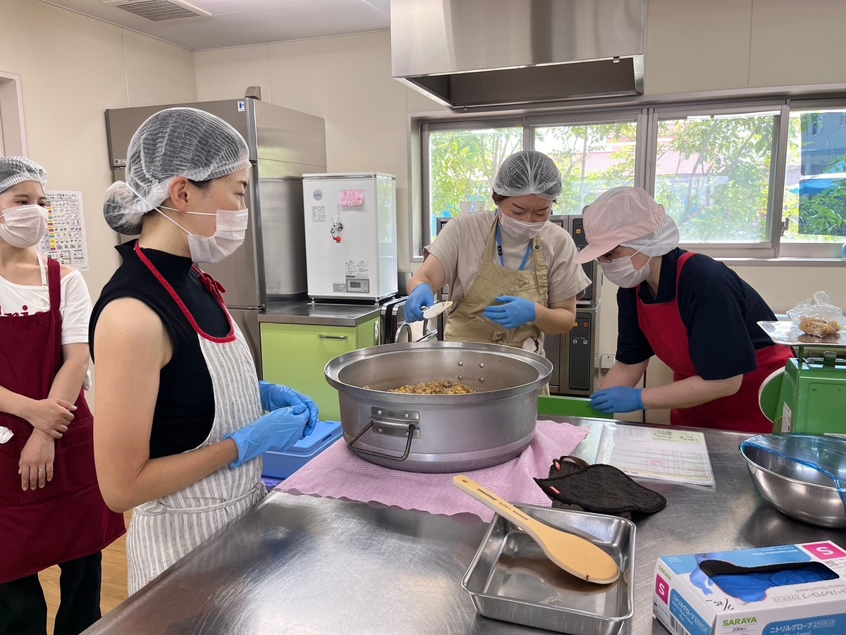 給食室の料理教室がありました。この日の献立は「コーンご飯」「ゆかり納豆」「豆腐ハンバーグ」「味噌汁」でした!各献立に分かれ、作り方を教わりました。