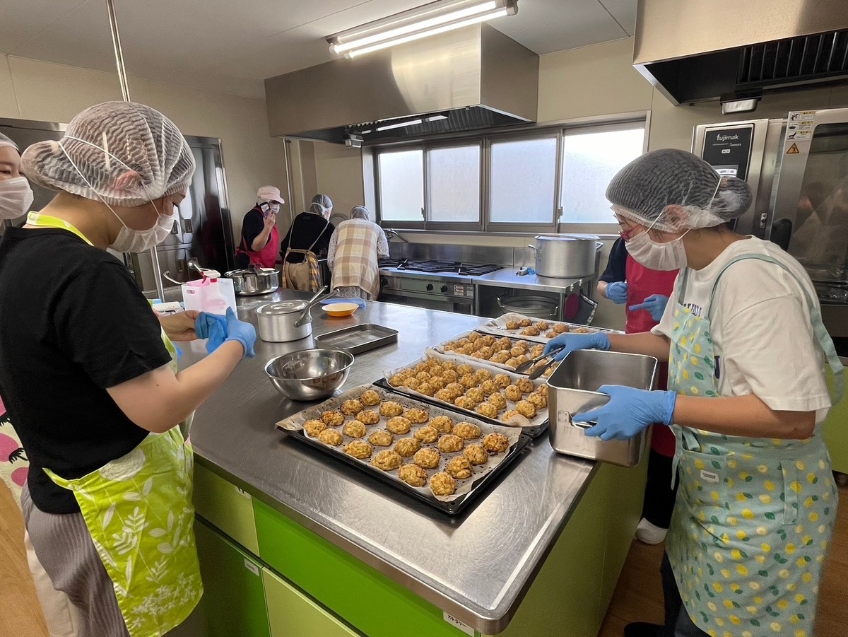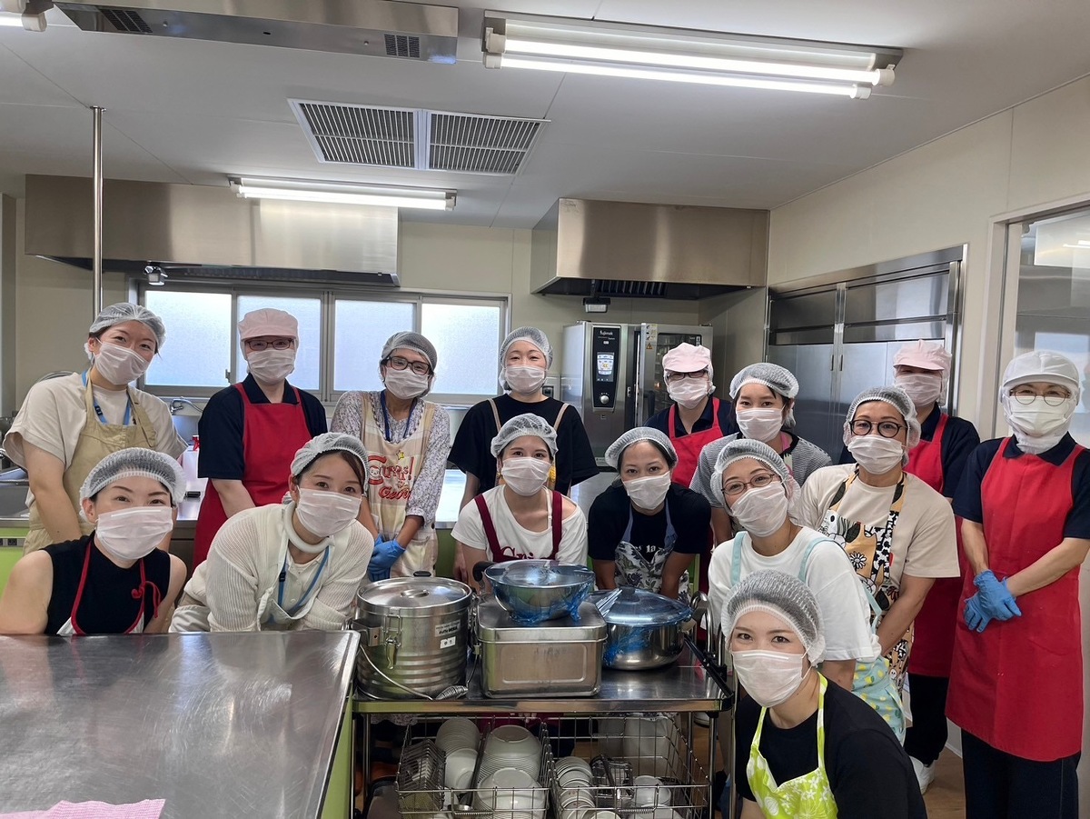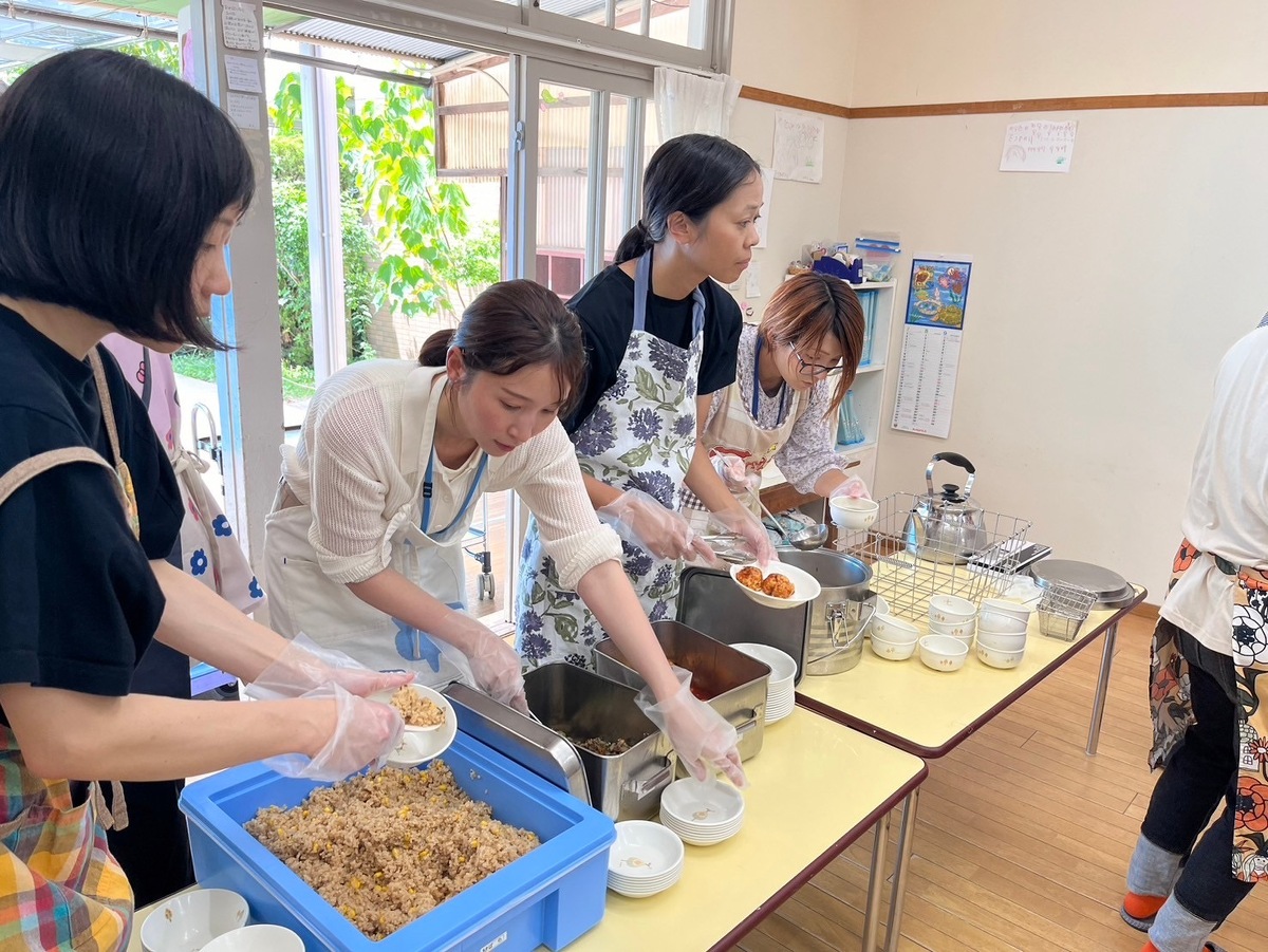 給食室の料理教室がありました。この日の献立は「コーンご飯」「ゆかり納豆」「豆腐ハンバーグ」「味噌汁」でした!各献立に分かれ、作り方を教わりました。
