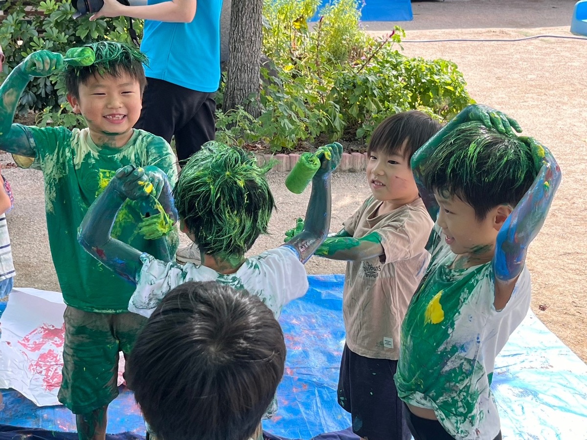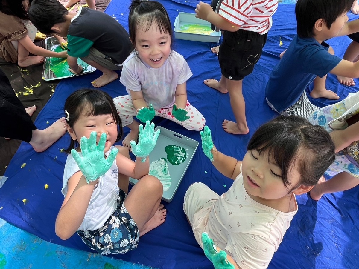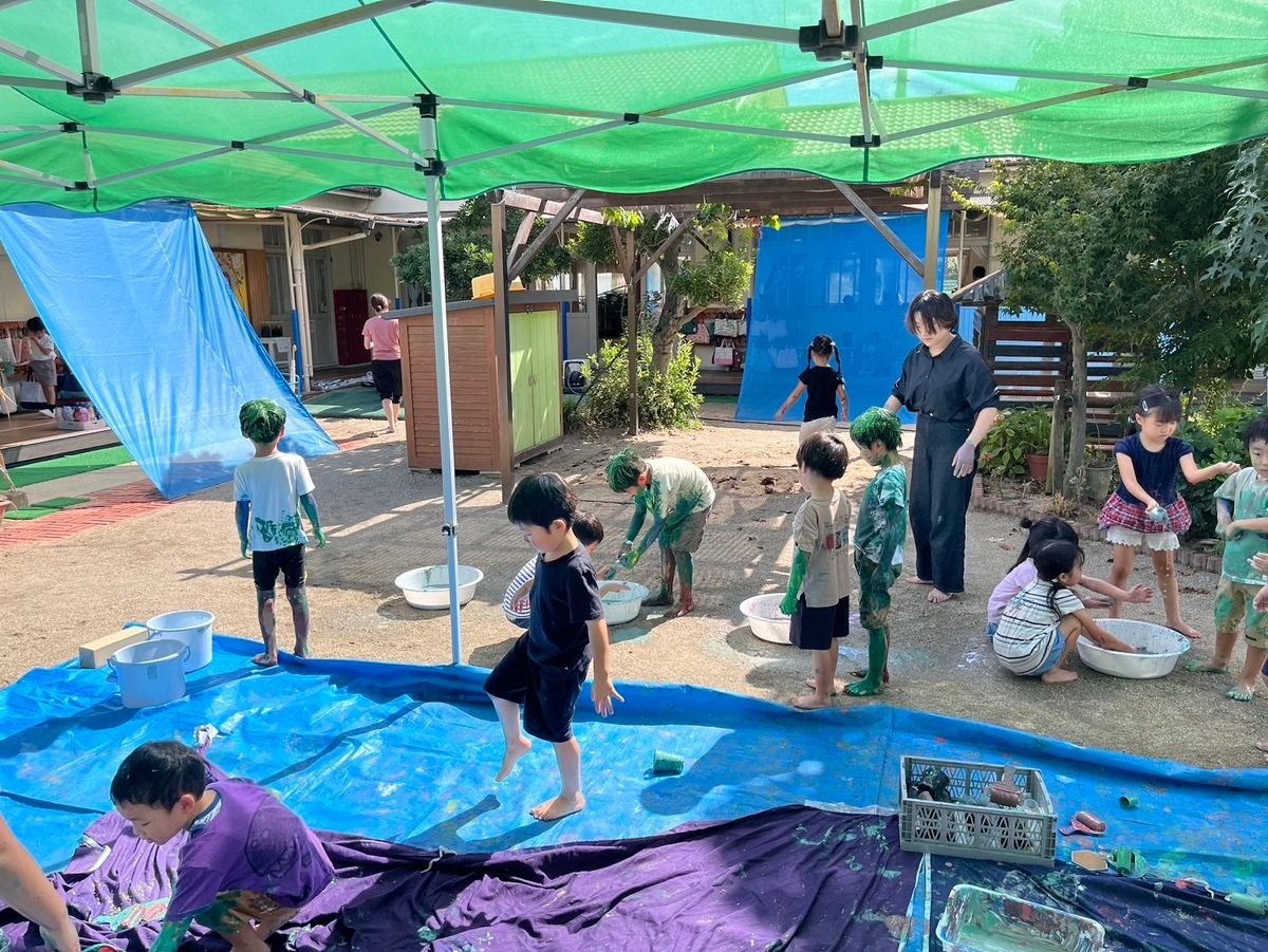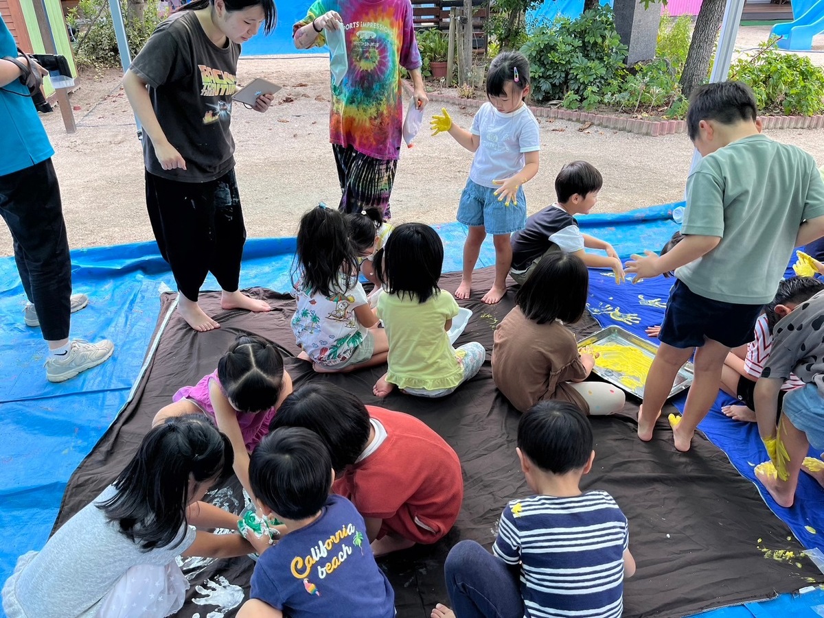 Aグループ(5歳児)のアートの日がありました。 2024年09月10日(火) 夏季保育1日目。久しぶりにAグループさんが集まりました。みんなが楽しみにしていた、ボディペイントの日です! 初めは触るのを躊躇っていた子どもたちも、触っていくうちにどんどん楽しくなり、全身絵の具だらけのお友だちもいました! 普段はなかなかできない活動で、子どもたちは様々な感触や感覚を学ぶことができました。みきゆき先生、香川大学の学生さん、素敵な時間をありがとうございました♪