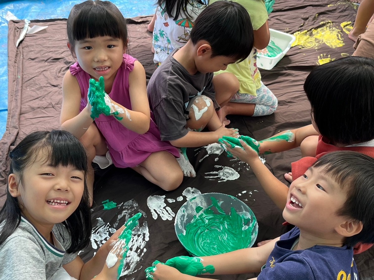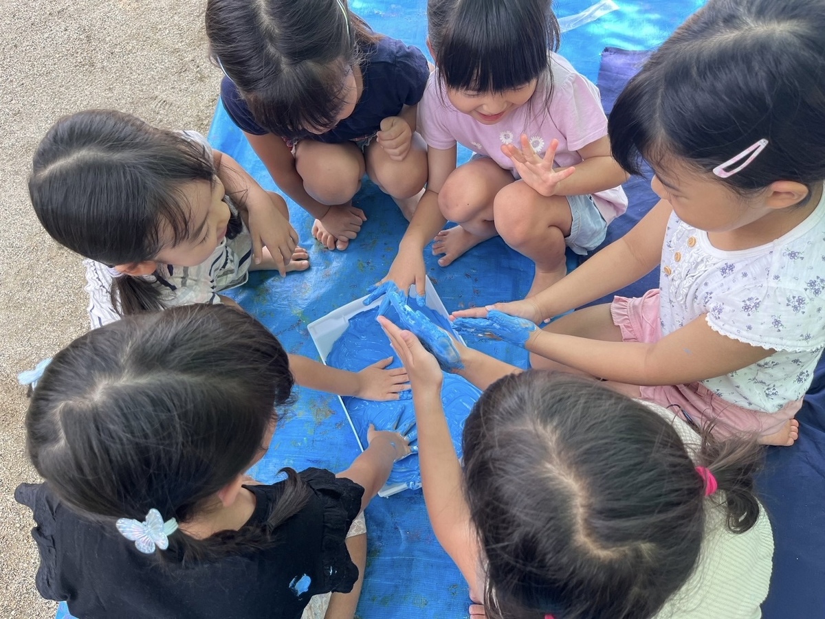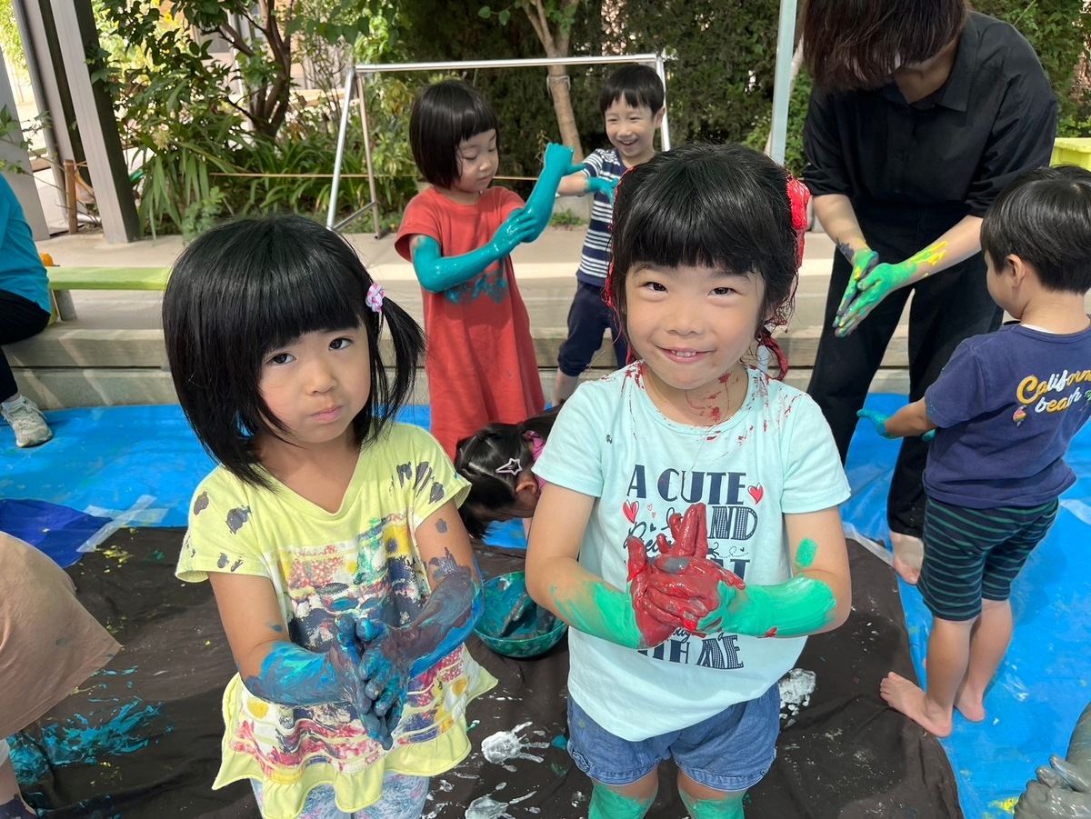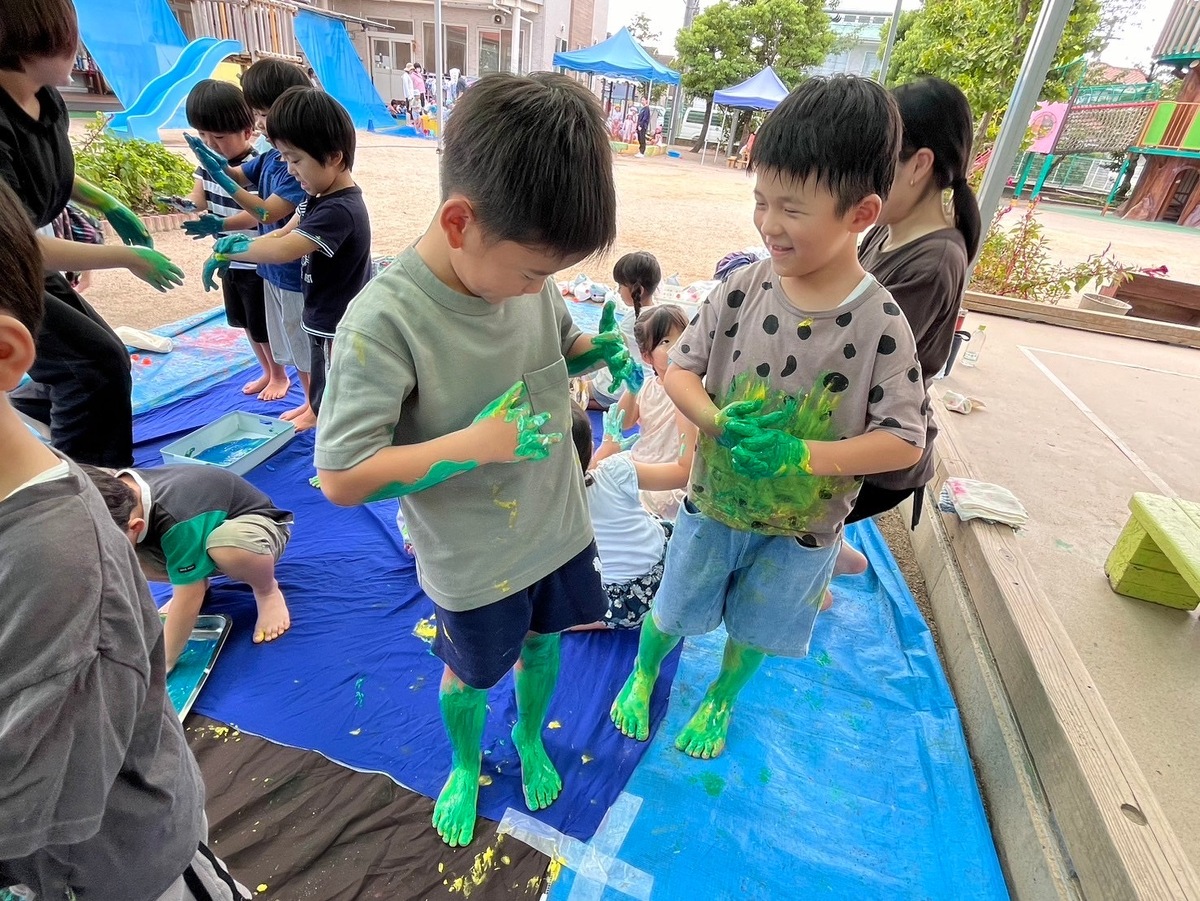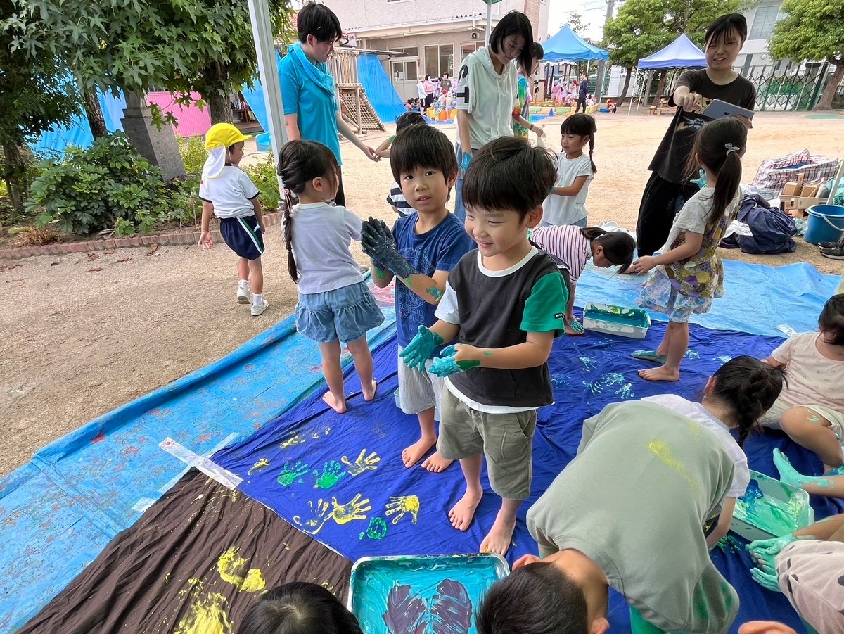 Aグループ(5歳児)のアートの日がありました。 2024年09月10日(火) 夏季保育1日目。久しぶりにAグループさんが集まりました。みんなが楽しみにしていた、ボディペイントの日です! 初めは触るのを躊躇っていた子どもたちも、触っていくうちにどんどん楽しくなり、全身絵の具だらけのお友だちもいました! 普段はなかなかできない活動で、子どもたちは様々な感触や感覚を学ぶことができました。みきゆき先生、香川大学の学生さん、素敵な時間をありがとうございました♪