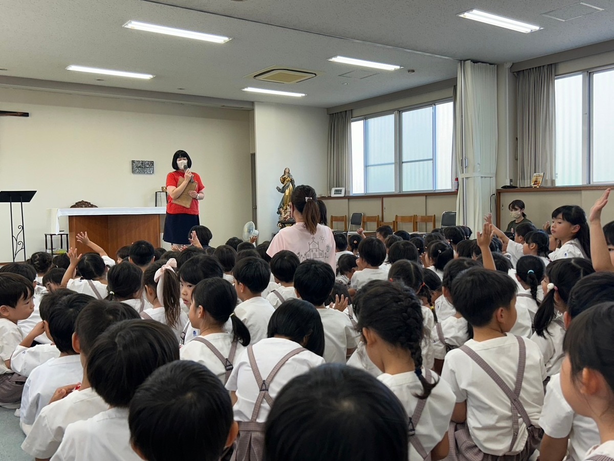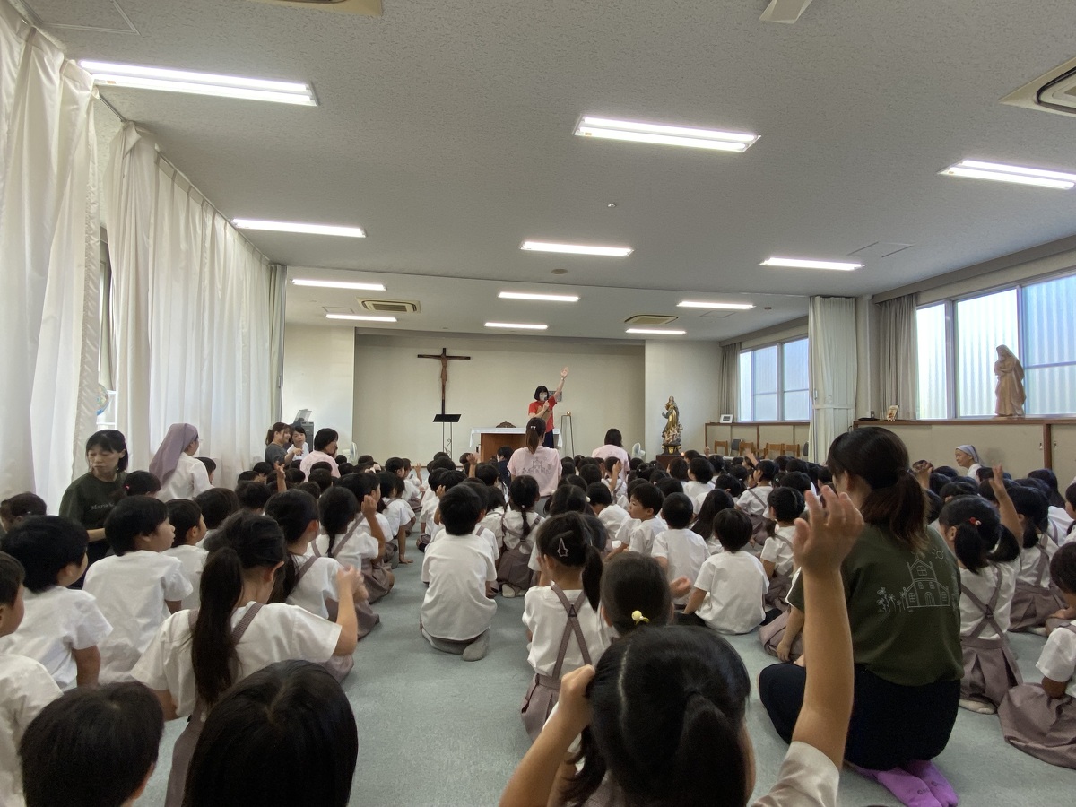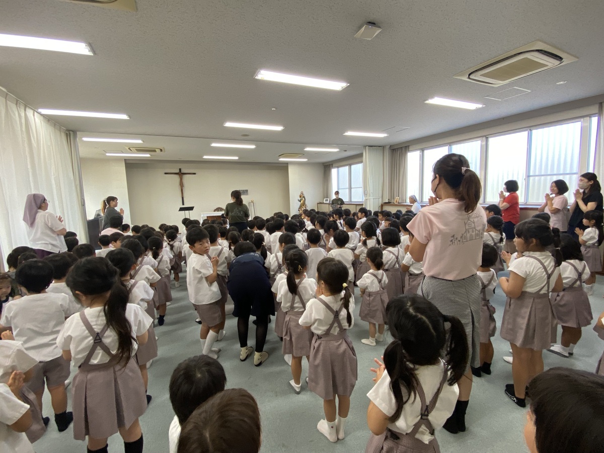 2学期の始業式を行いました。 2024年09月10日(火) 2学期の始業式を行いました。久しぶりに集まった子どもたちのキラキラした目と、少し日焼けした肌から、みんな楽しい夏休みを過ごしたことが伝わってきました。 園長先生のお話を聞いたり、園歌や聖歌を歌ったりしました。そして、新しくマリア幼稚園に入ったお友だちの紹介がありました。お友だちは、みんなの前でドキドキしながら、上手に自己紹介をしてくれました!これから仲良く遊びましょうね♪ 2学期は、キラキラえがおデーやクリスマス会など行事が盛りだくさん!素敵な思い出をたくさん作りましょうね。