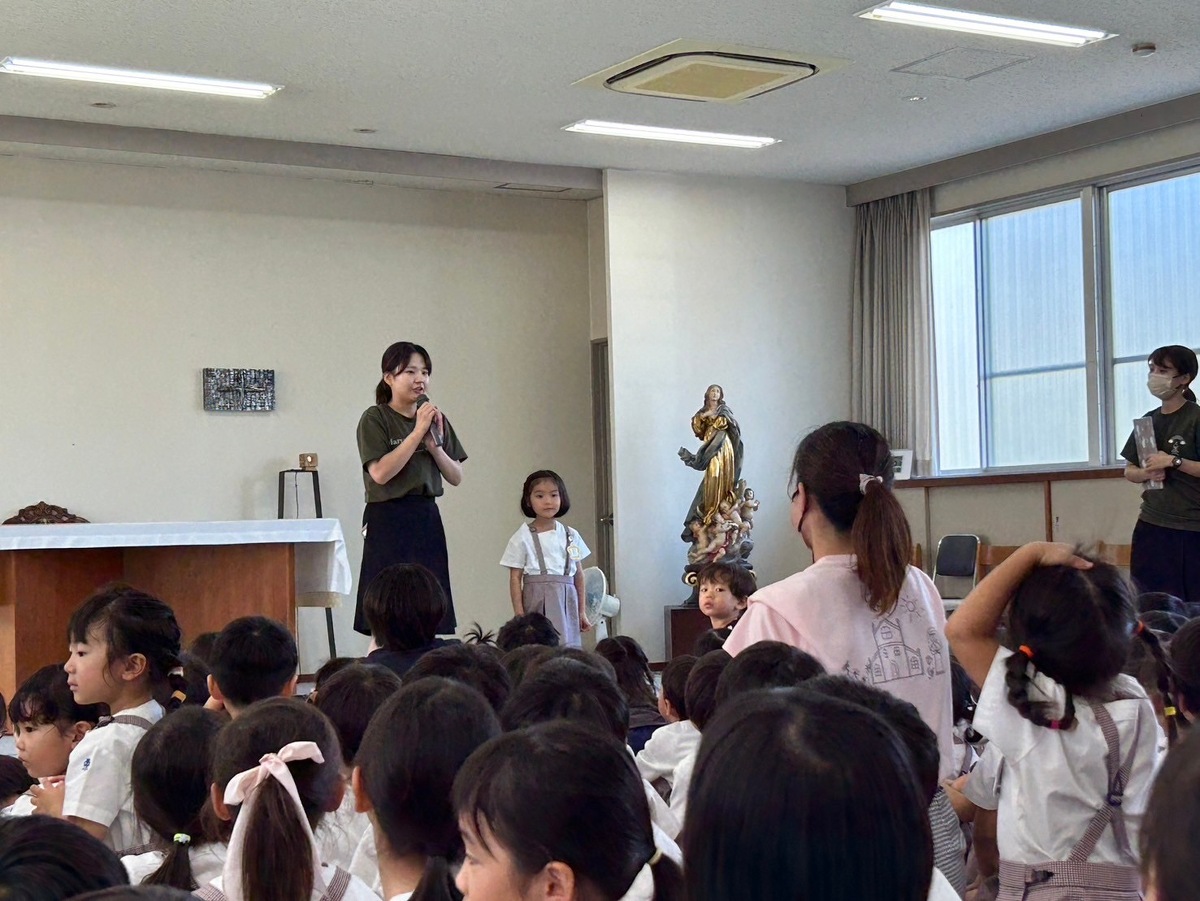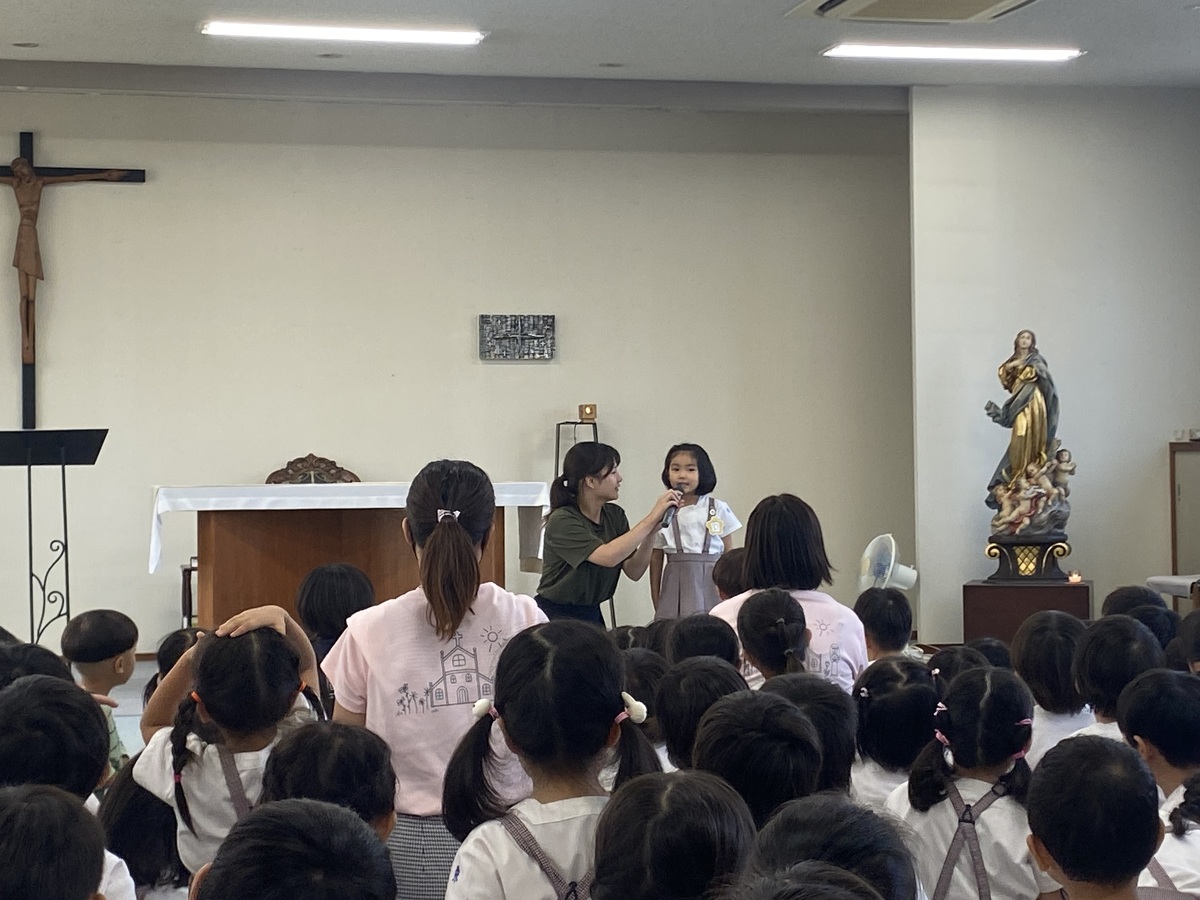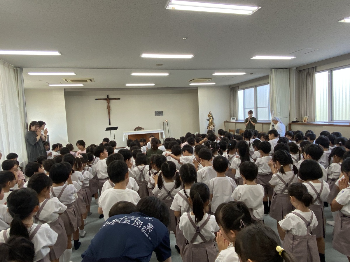 2学期の始業式を行いました。 2024年09月10日(火) 2学期の始業式を行いました。久しぶりに集まった子どもたちのキラキラした目と、少し日焼けした肌から、みんな楽しい夏休みを過ごしたことが伝わってきました。 園長先生のお話を聞いたり、園歌や聖歌を歌ったりしました。そして、新しくマリア幼稚園に入ったお友だちの紹介がありました。お友だちは、みんなの前でドキドキしながら、上手に自己紹介をしてくれました!これから仲良く遊びましょうね♪ 2学期は、キラキラえがおデーやクリスマス会など行事が盛りだくさん!素敵な思い出をたくさん作りましょうね。