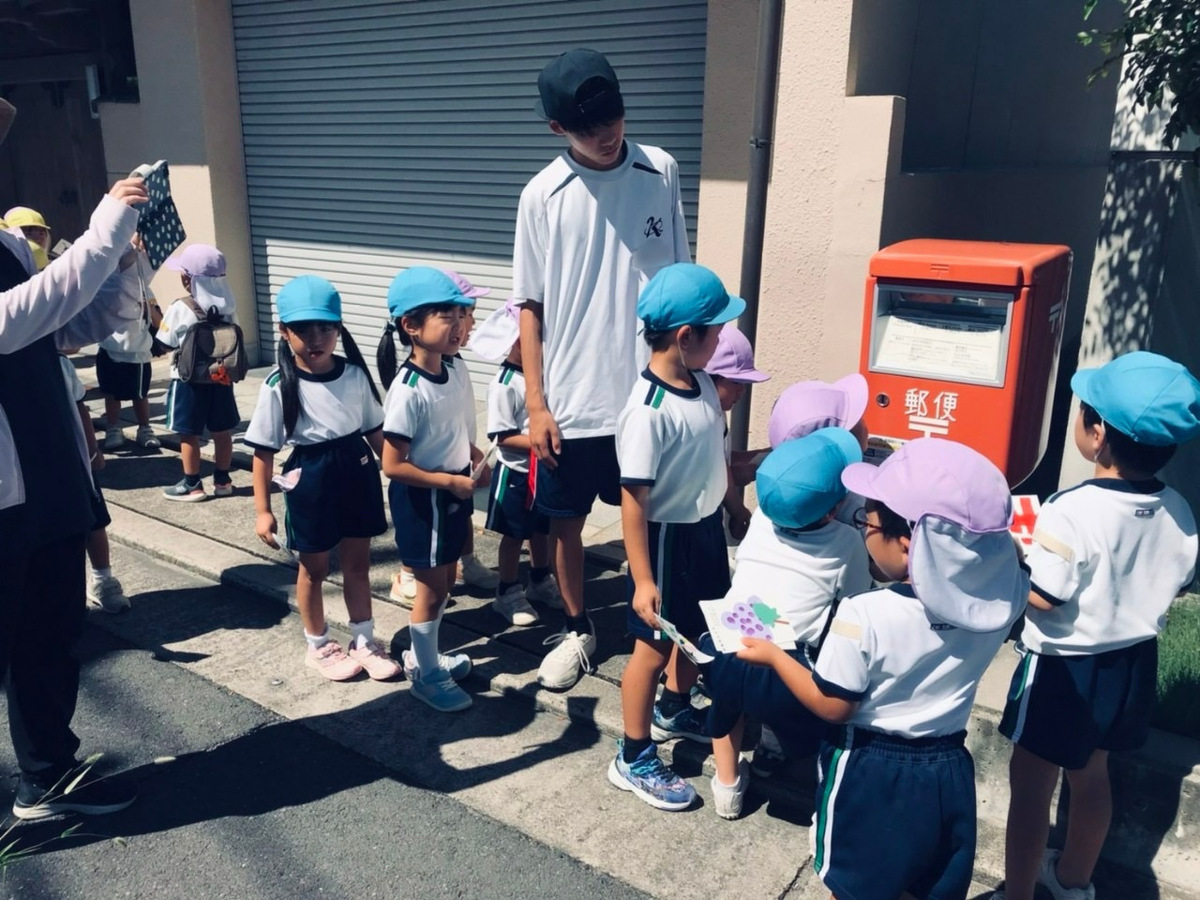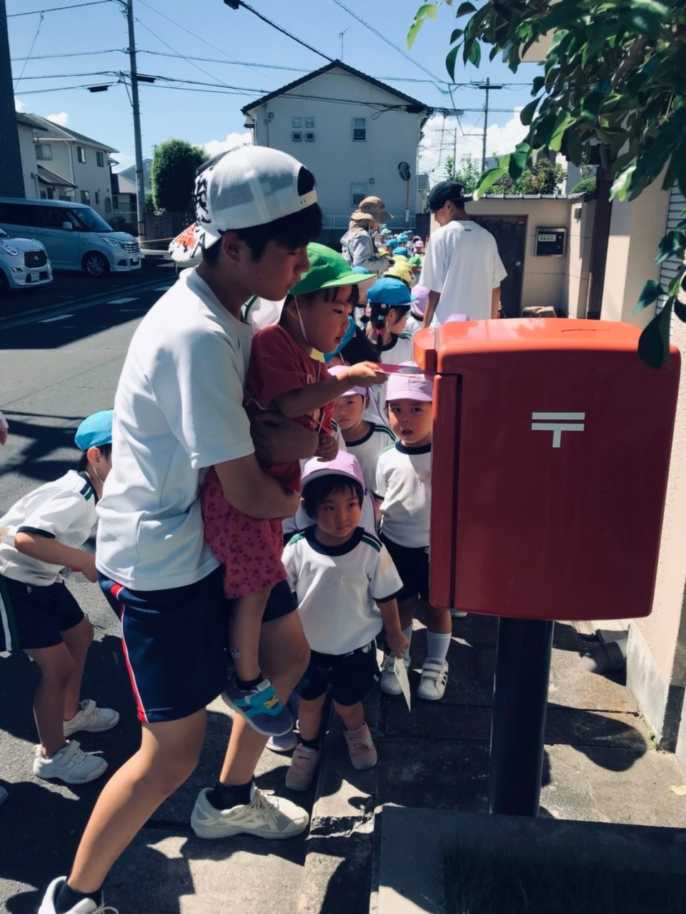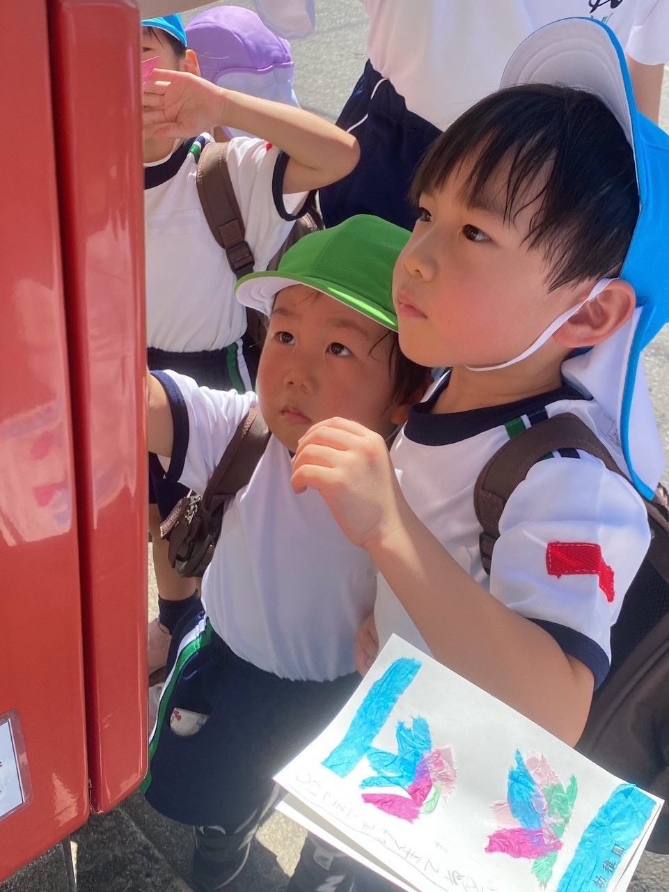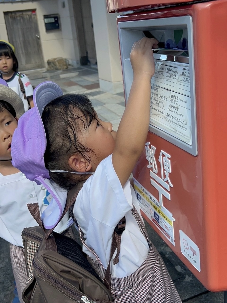敬老の日のハガキの投函に行きました。 2024年09月13日(金) 9月16日の敬老の日に向け、グループごとに違うデザインのハガキを持って、みんなでポストまで歩いて行きました。 大好きなおじいちゃんおばあちゃんのために作ったハガキ。大切にポストに投函しました! おじいちゃんおばあちゃん、いつまでも元気でいてね。
