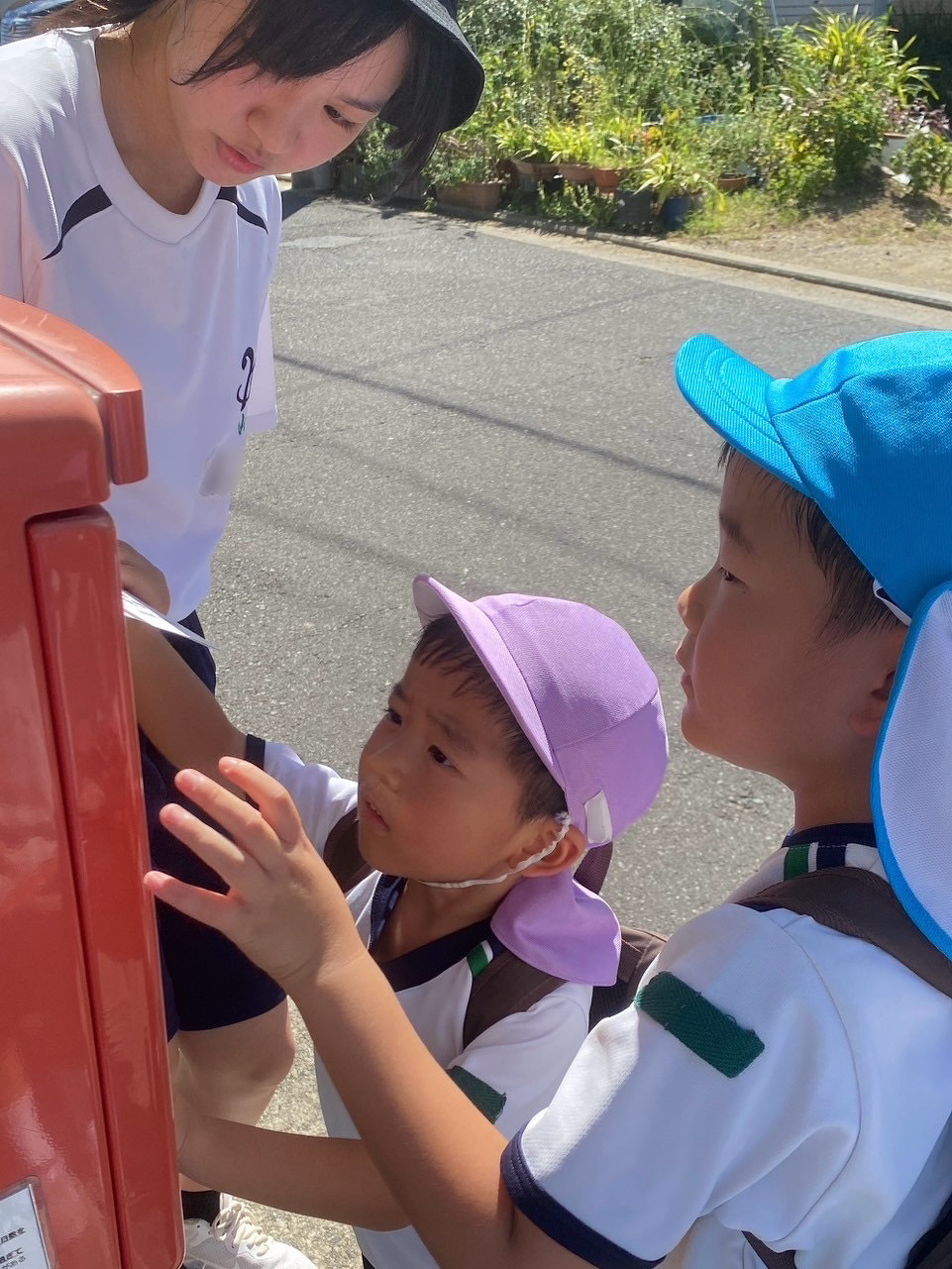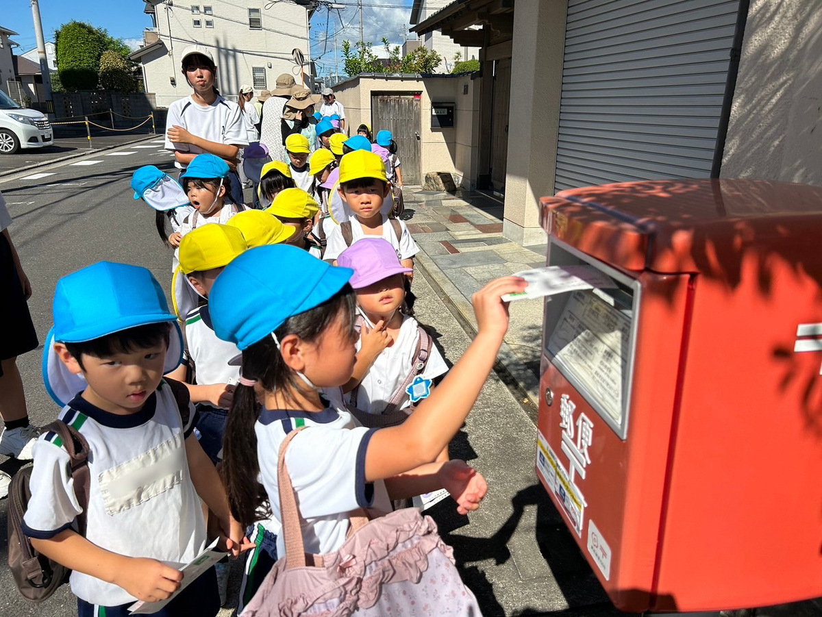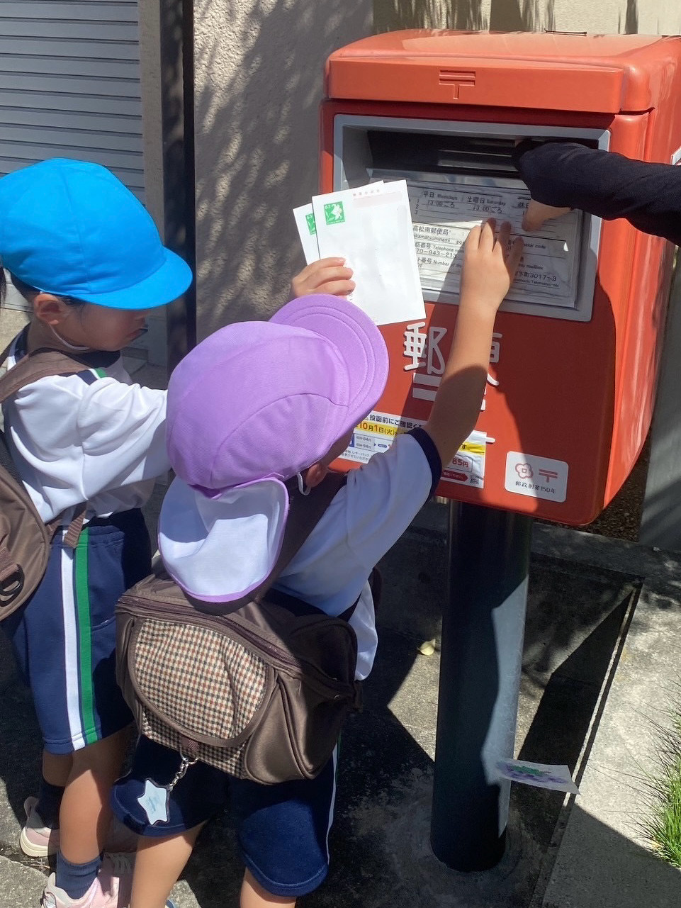 敬老の日のハガキの投函に行きました。 2024年09月13日(金) 9月16日の敬老の日に向け、グループごとに違うデザインのハガキを持って、みんなでポストまで歩いて行きました。 大好きなおじいちゃんおばあちゃんのために作ったハガキ。大切にポストに投函しました! おじいちゃんおばあちゃん、いつまでも元気でいてね。