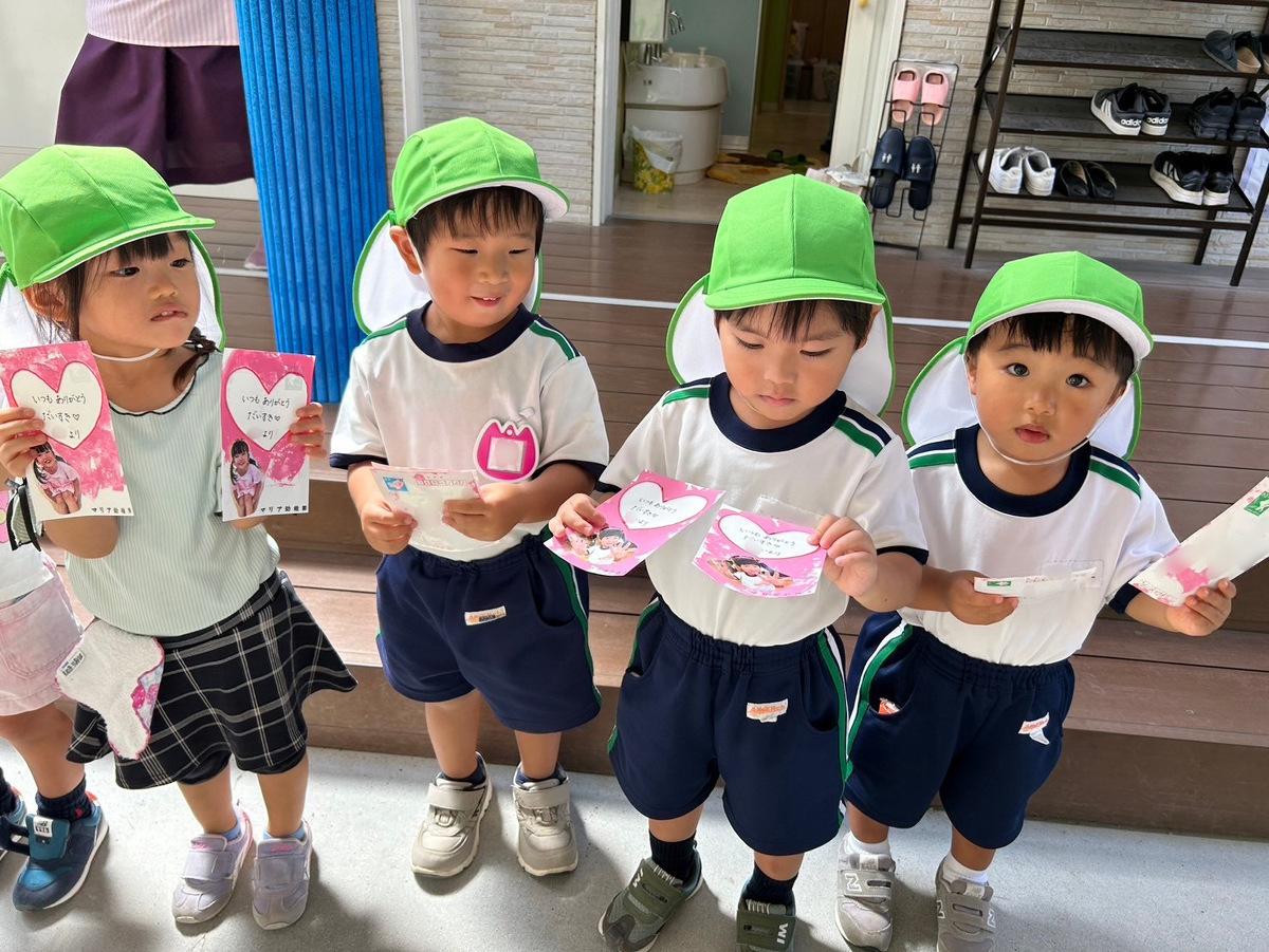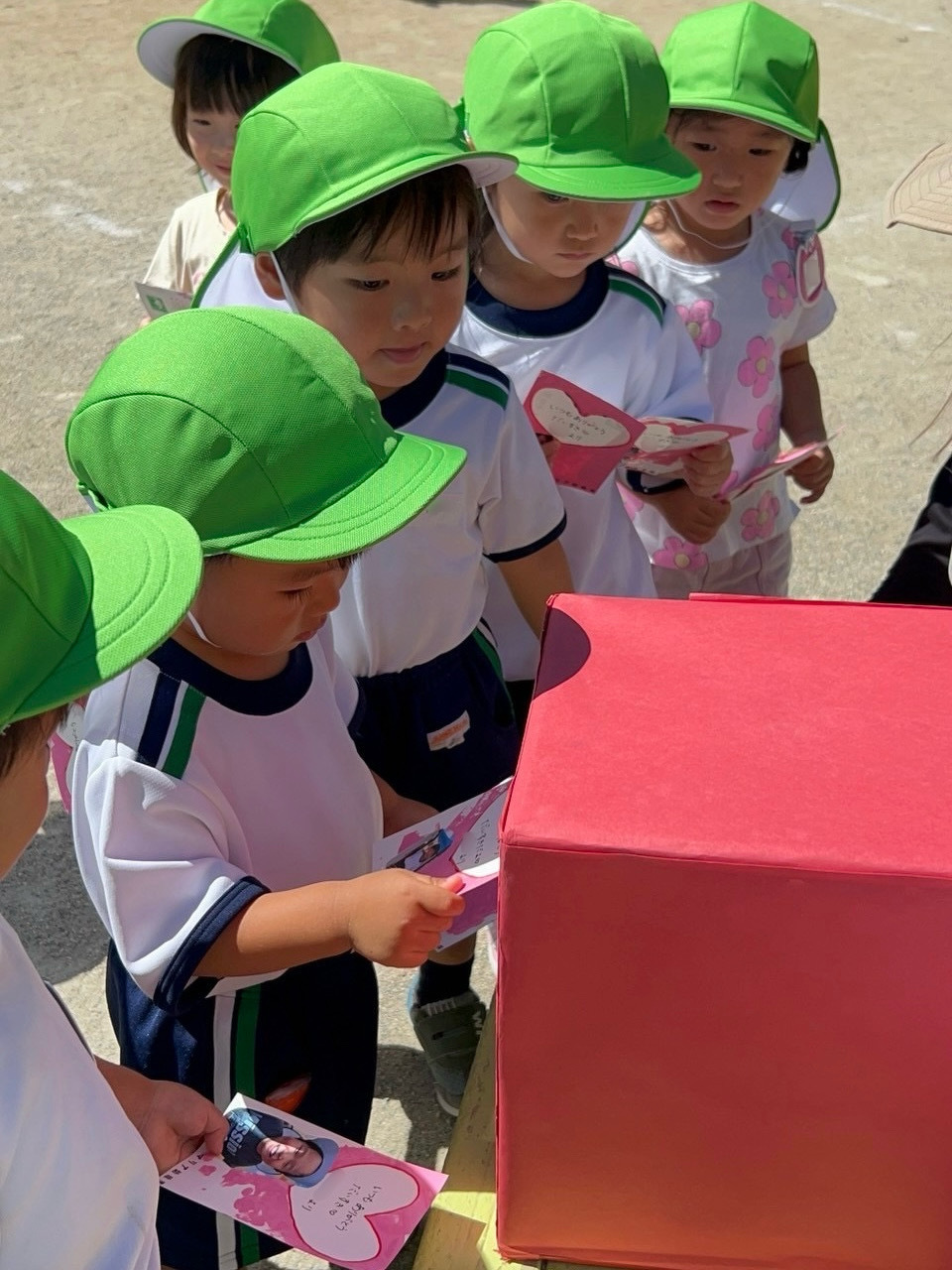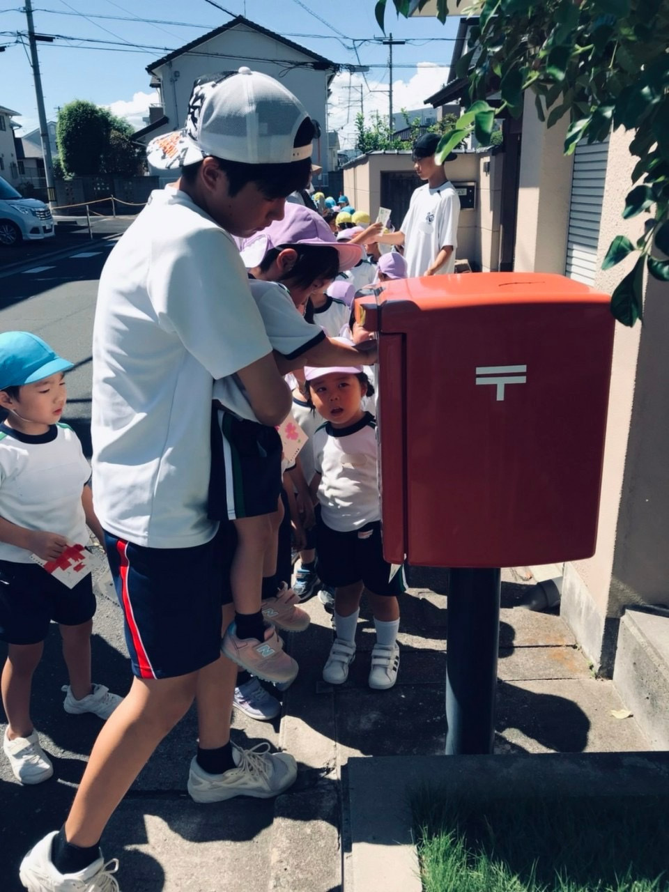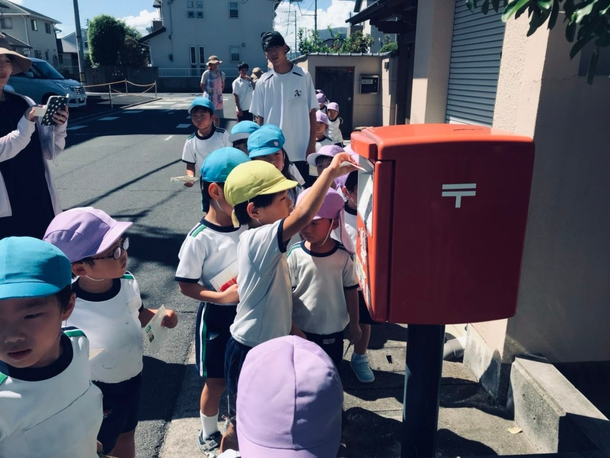 敬老の日のハガキの投函に行きました。 2024年09月13日(金) 9月16日の敬老の日に向け、グループごとに違うデザインのハガキを持って、みんなでポストまで歩いて行きました。 大好きなおじいちゃんおばあちゃんのために作ったハガキ。大切にポストに投函しました! おじいちゃんおばあちゃん、いつまでも元気でいてね。