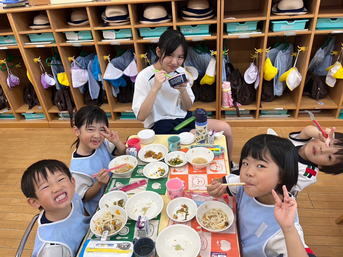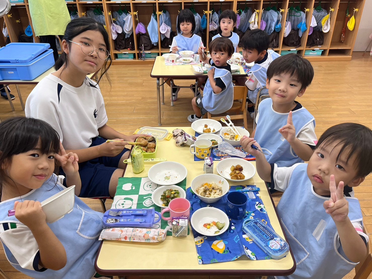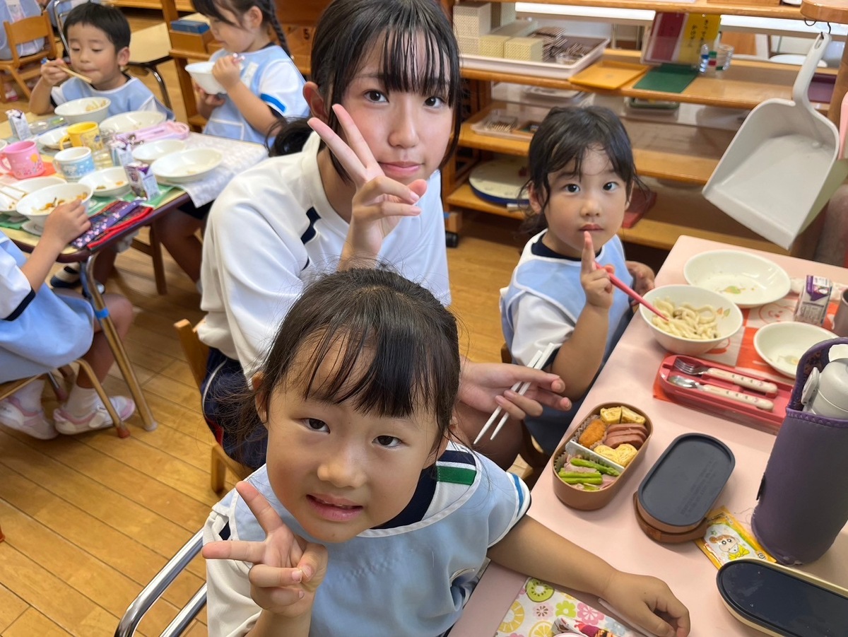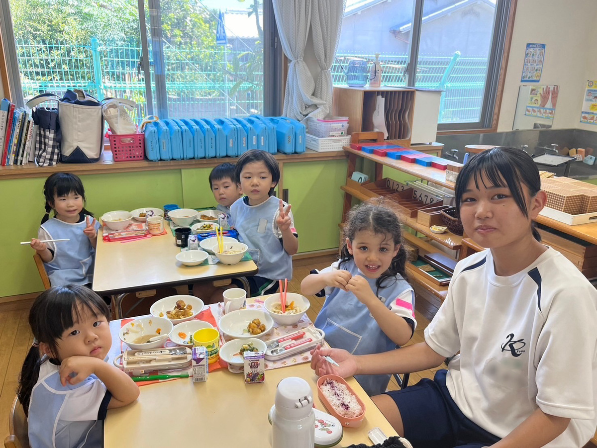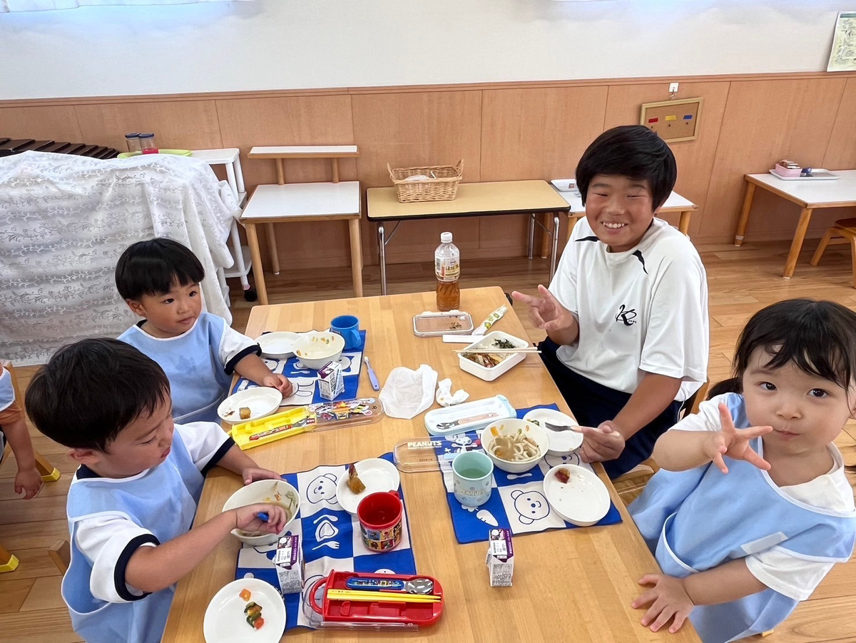 協和中学校から、15名のお兄さんお姉さんが職場体験に来てくれました。幼稚園のお友だちと一緒に、園庭で鬼ごっこをしたり、給食を食べたり、体操をしたりいろいろな活動をしました!また、敬老の日のハガキの投函も一緒に行き、子どもたちの安全を守ってくれました!