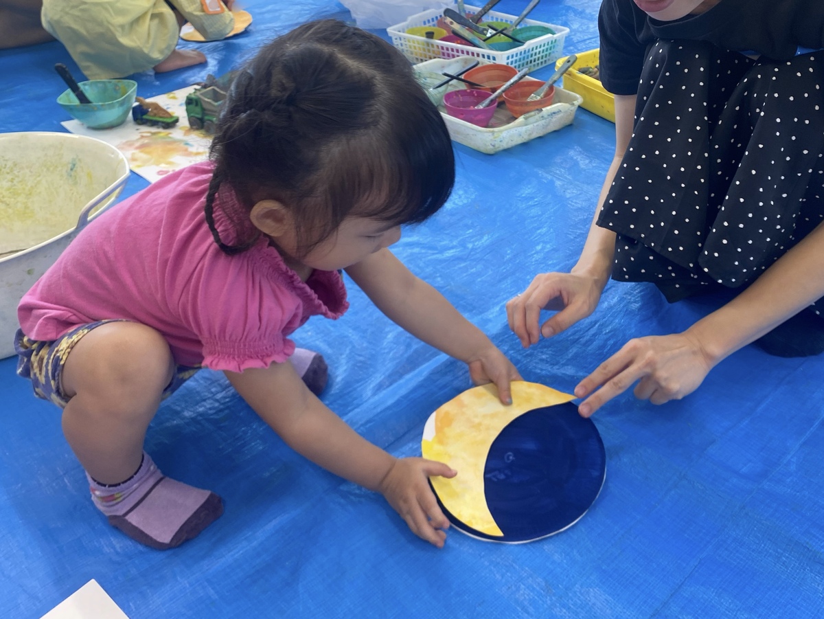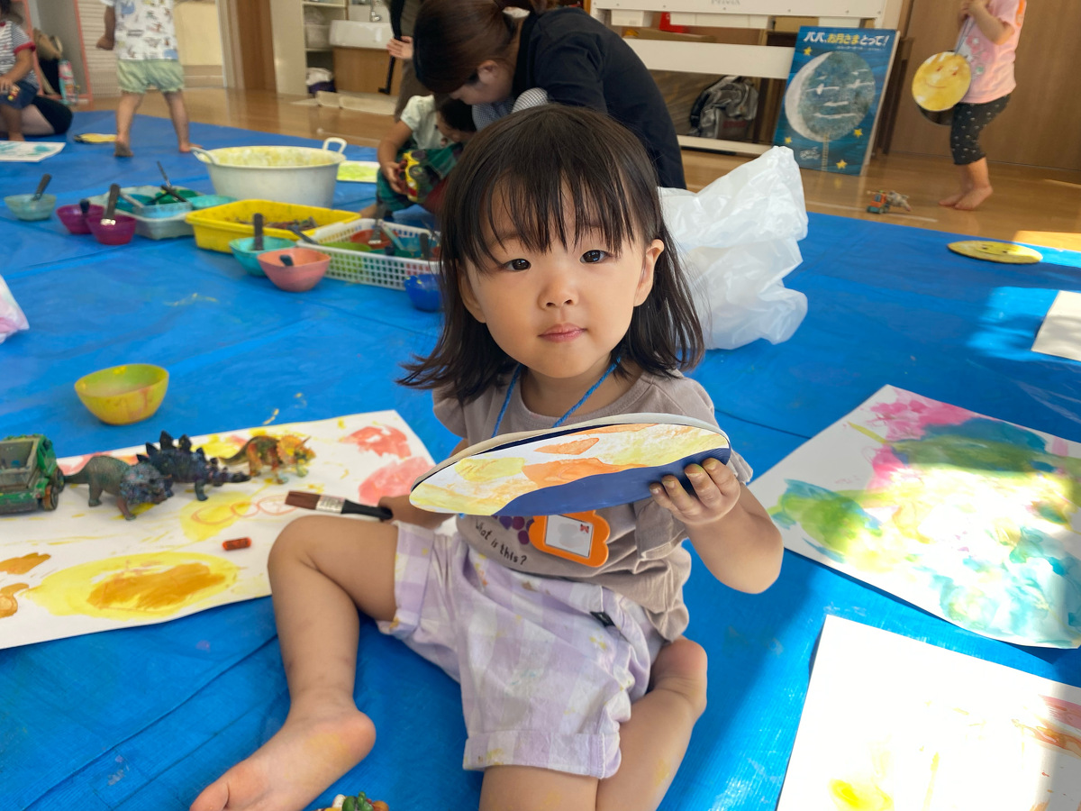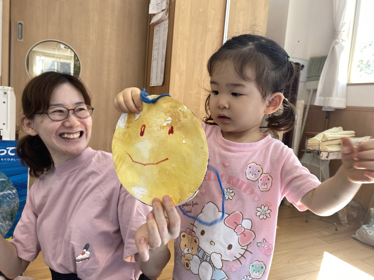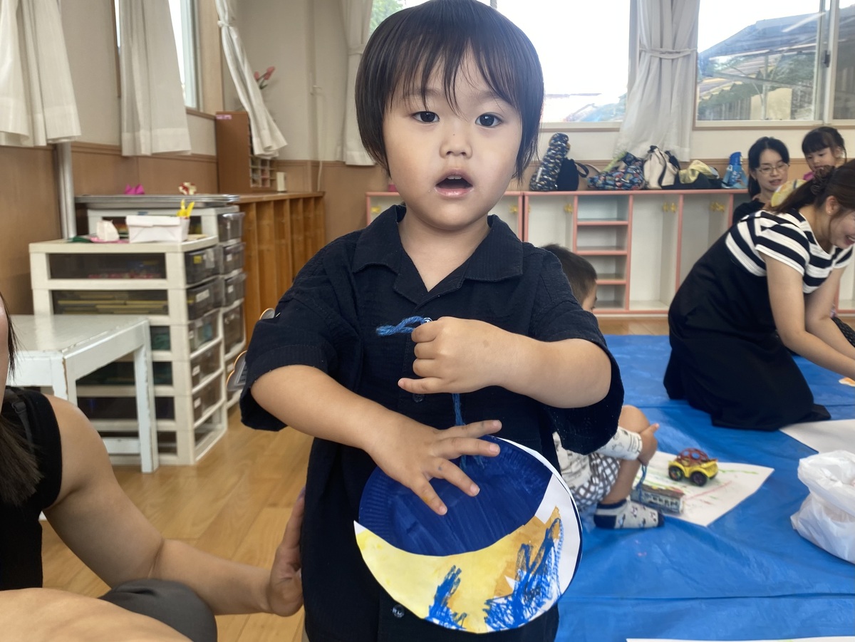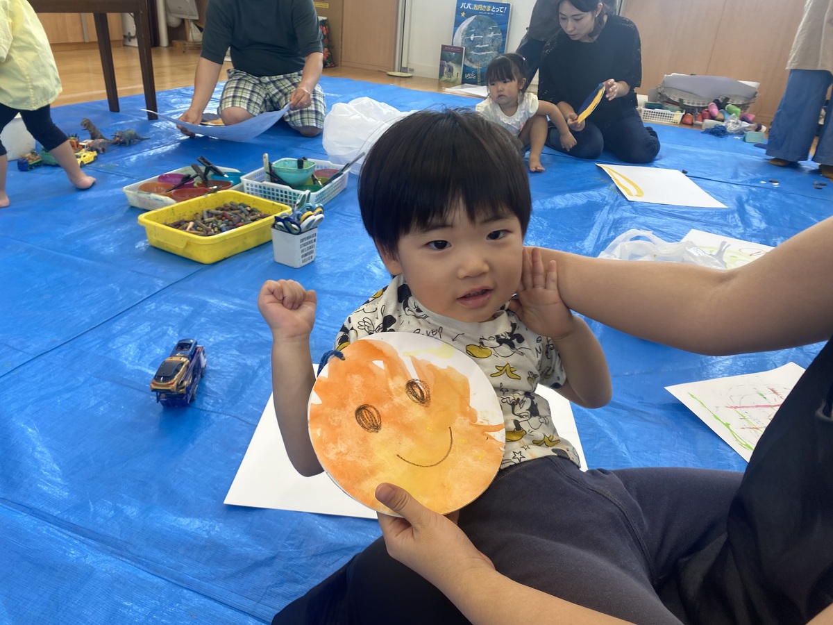 つぼみ・プチつぼみクラスのおえかきあそびがありました。 2024年10月07日(月) つぼみ・プチつぼみクラスのおえかきあそびがありました。まずはじめは、宮地先生の読み聞かせや手袋シアター。「パパ、お月さまとって!」の大きな絵本に、子どもたちは大喜び! 次は、後藤先生と一緒にお月さま作り。画用紙に、黄色やオレンジの絵の具を塗りました。乾かした後は、おうちの人にお月さまの形に切ってもらいます。 紙皿にお月さまを貼って、お顔を描いて、裏と表で満月と三日月のかわいいお月さまの完成!!おうちでもお月見ができますね♪ 宮地先生、後藤先生、素敵な時間をありがとうございました!