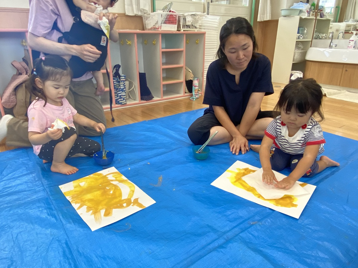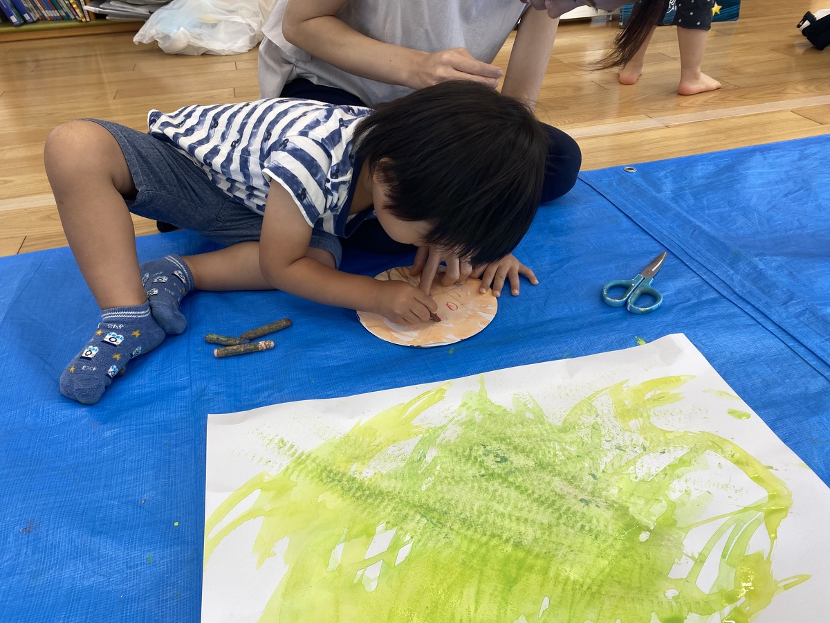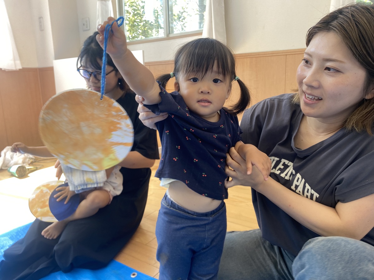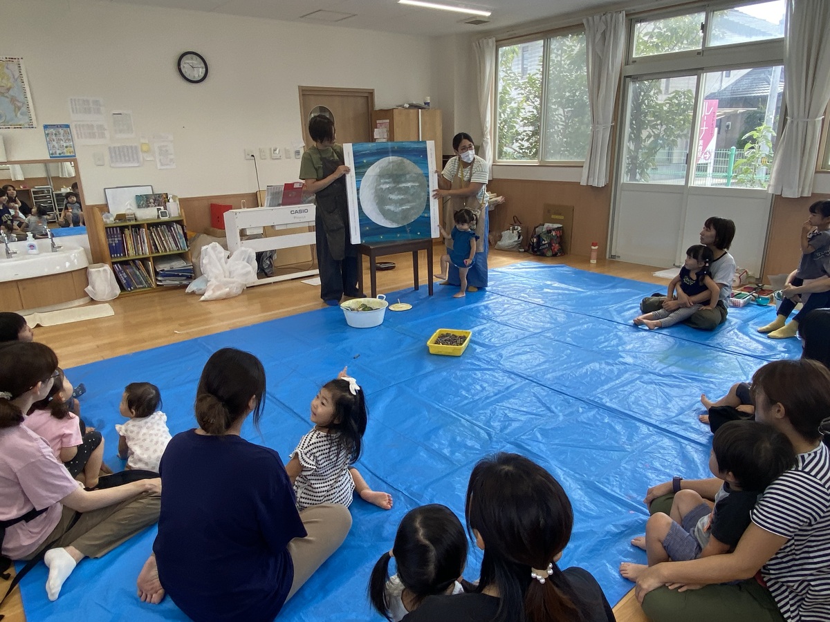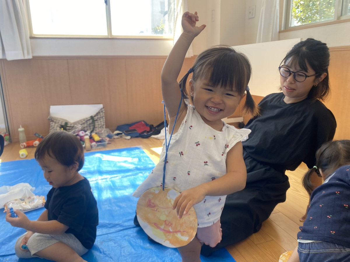 つぼみ・プチつぼみクラスのおえかきあそびがありました。 2024年10月07日(月) つぼみ・プチつぼみクラスのおえかきあそびがありました。まずはじめは、宮地先生の読み聞かせや手袋シアター。「パパ、お月さまとって!」の大きな絵本に、子どもたちは大喜び! 次は、後藤先生と一緒にお月さま作り。画用紙に、黄色やオレンジの絵の具を塗りました。乾かした後は、おうちの人にお月さまの形に切ってもらいます。 紙皿にお月さまを貼って、お顔を描いて、裏と表で満月と三日月のかわいいお月さまの完成!!おうちでもお月見ができますね♪ 宮地先生、後藤先生、素敵な時間をありがとうございました!