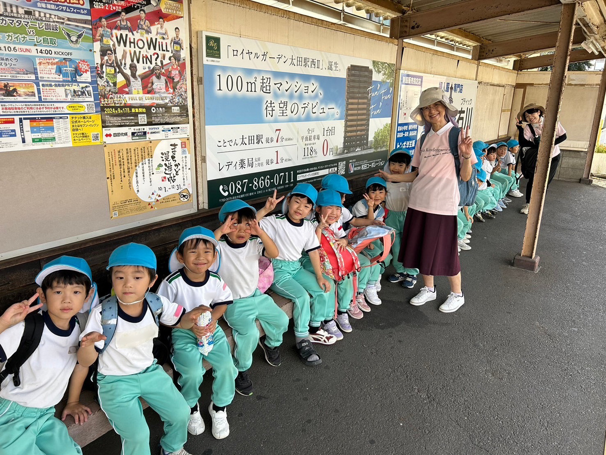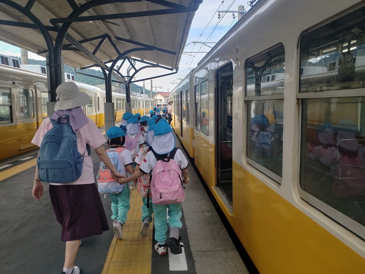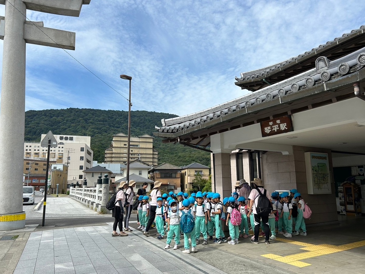 Aグループ(5歳児)が、電車に乗って出掛けました。しばらく電車に揺られて着いたのは、琴平駅。こんぴらさんまで歩きます。
