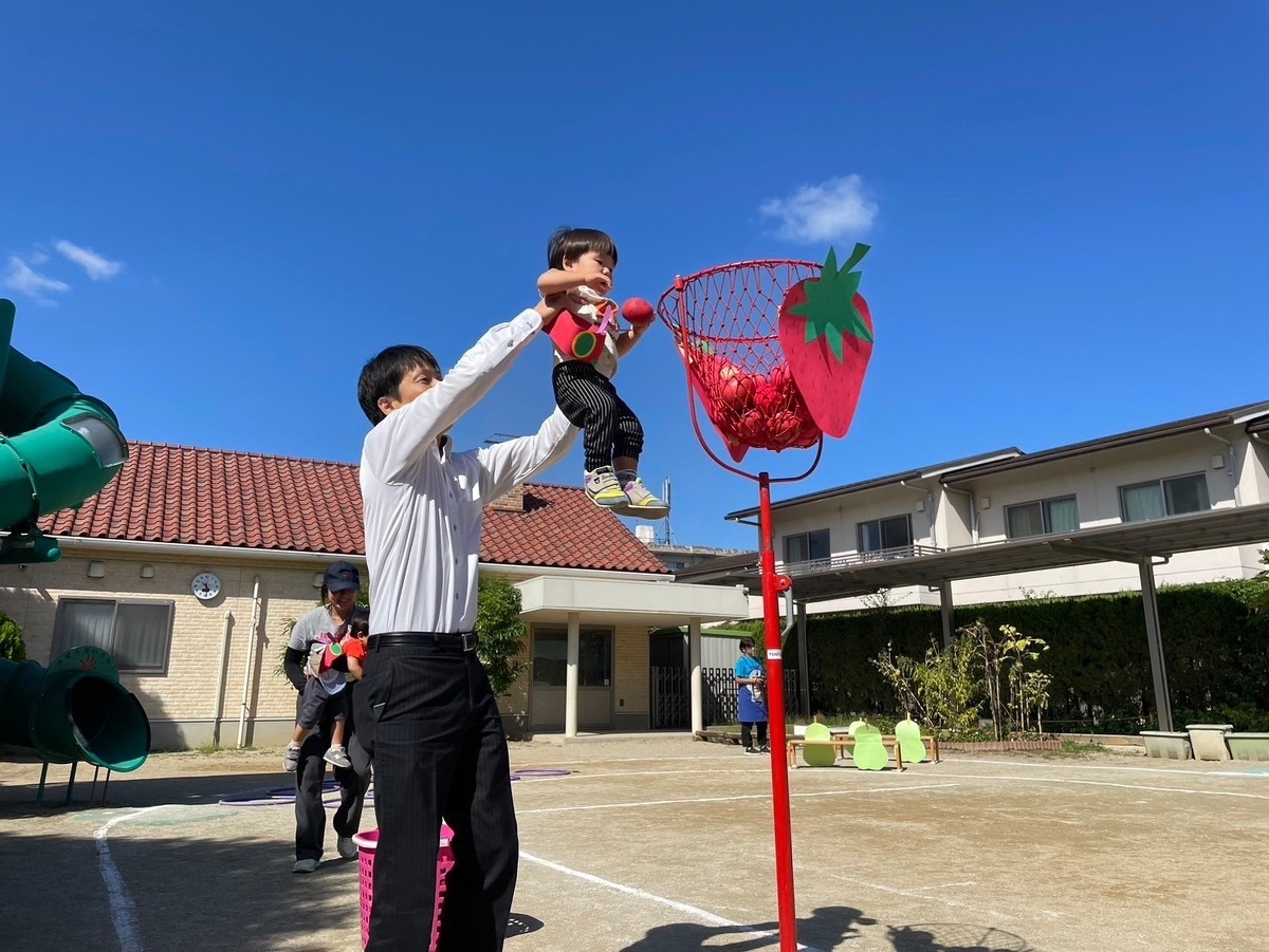 最後は、はらぺこあおむしになって、サーキット。りんごのフープをくぐって、ナシの橋を渡って、すもものフープをジャンプして、いちごの玉入れをして、オレンジのトンネルを通って、ちょうちょさんに変身!タンバリンをタッチしてゴール!! みんな可愛いちょうちょさんになることができました♪