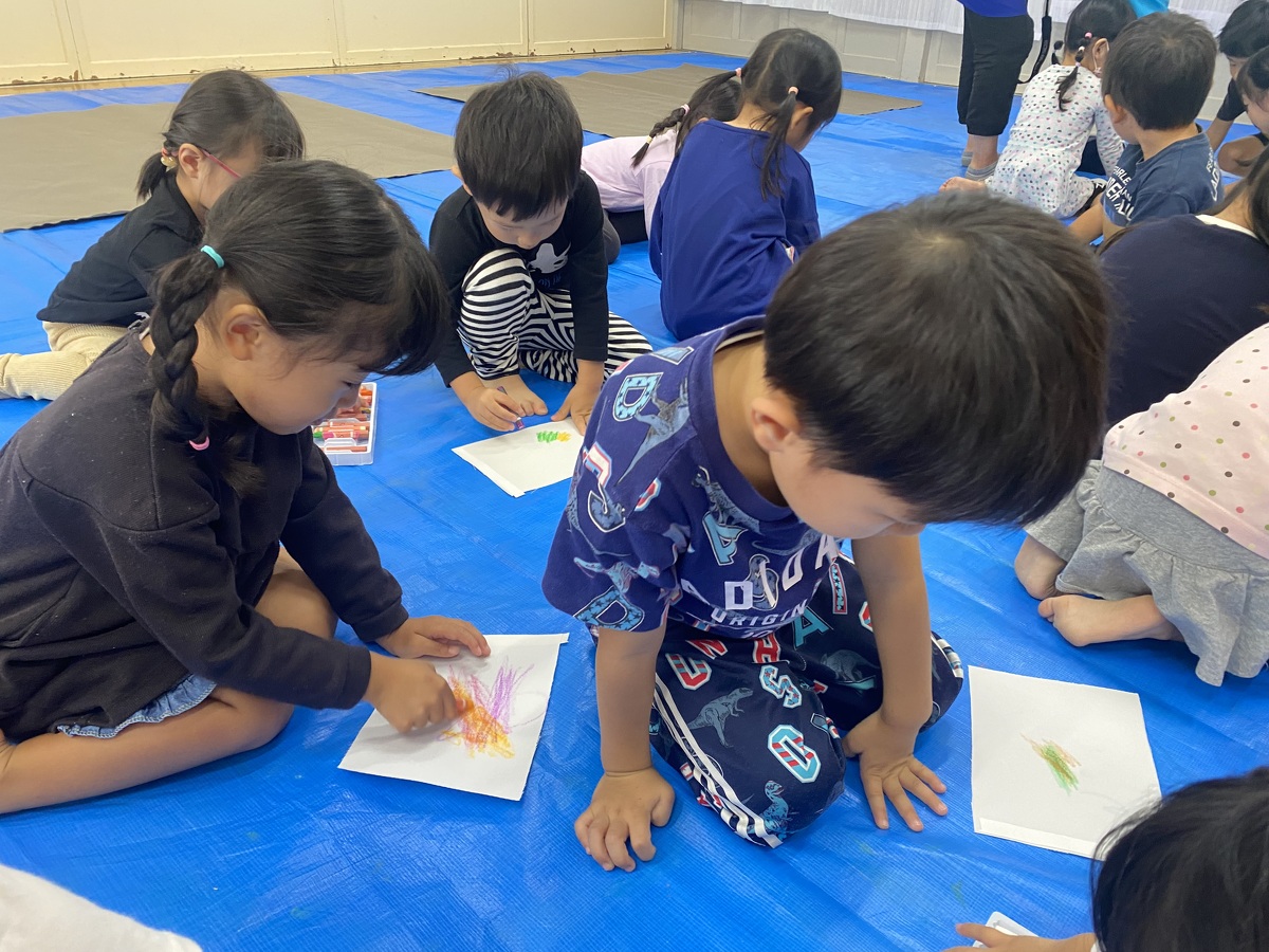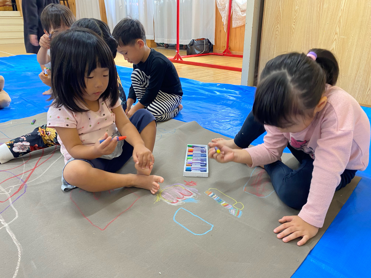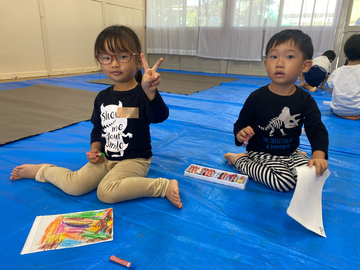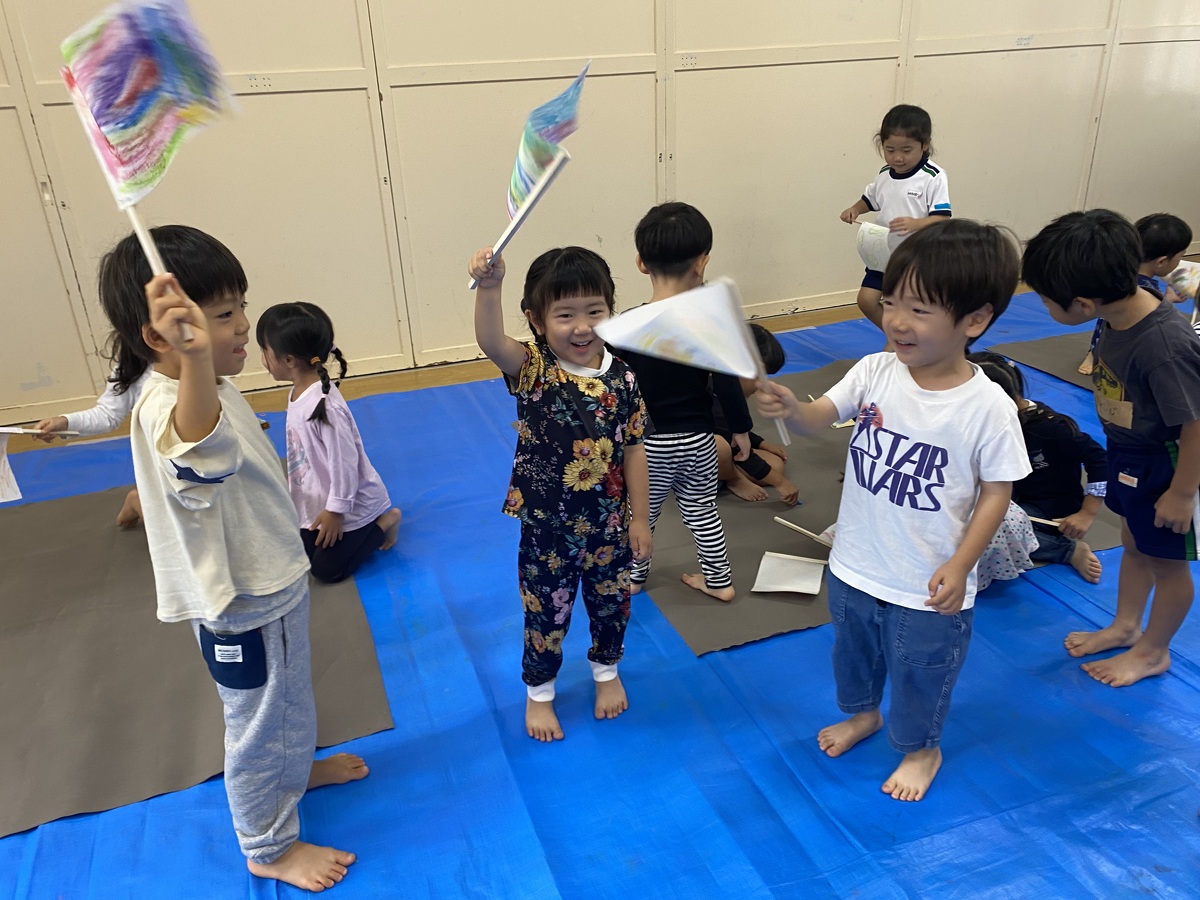 Cグループ(3歳児)のアートの日がありました。 2024年11月08日(金) Cグループ(3歳児)のアートの日がありました。キラキラえがおデーを終えて、キラキラえがおデーで感じた気持ちを色で表してみました。 「楽しかった気持ちの色」「ドキドキした気持ちの色」など、子どもたちはそれぞれキラキラえがおデーの時を思い出しながら旗に色を塗りました!大きな旗にも色を塗ってみました!紙とは違う発色に興味津々の子どもたち。 最後は、できあがった旗を振って「がんばれ〜!!」と元気いっぱい応援してみました♪ 後藤先生、素敵な時間をありがとうございました!