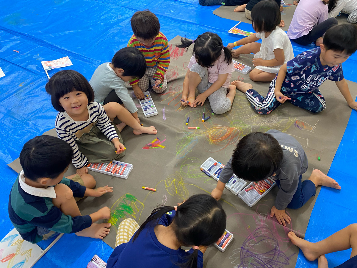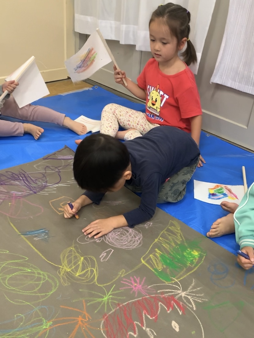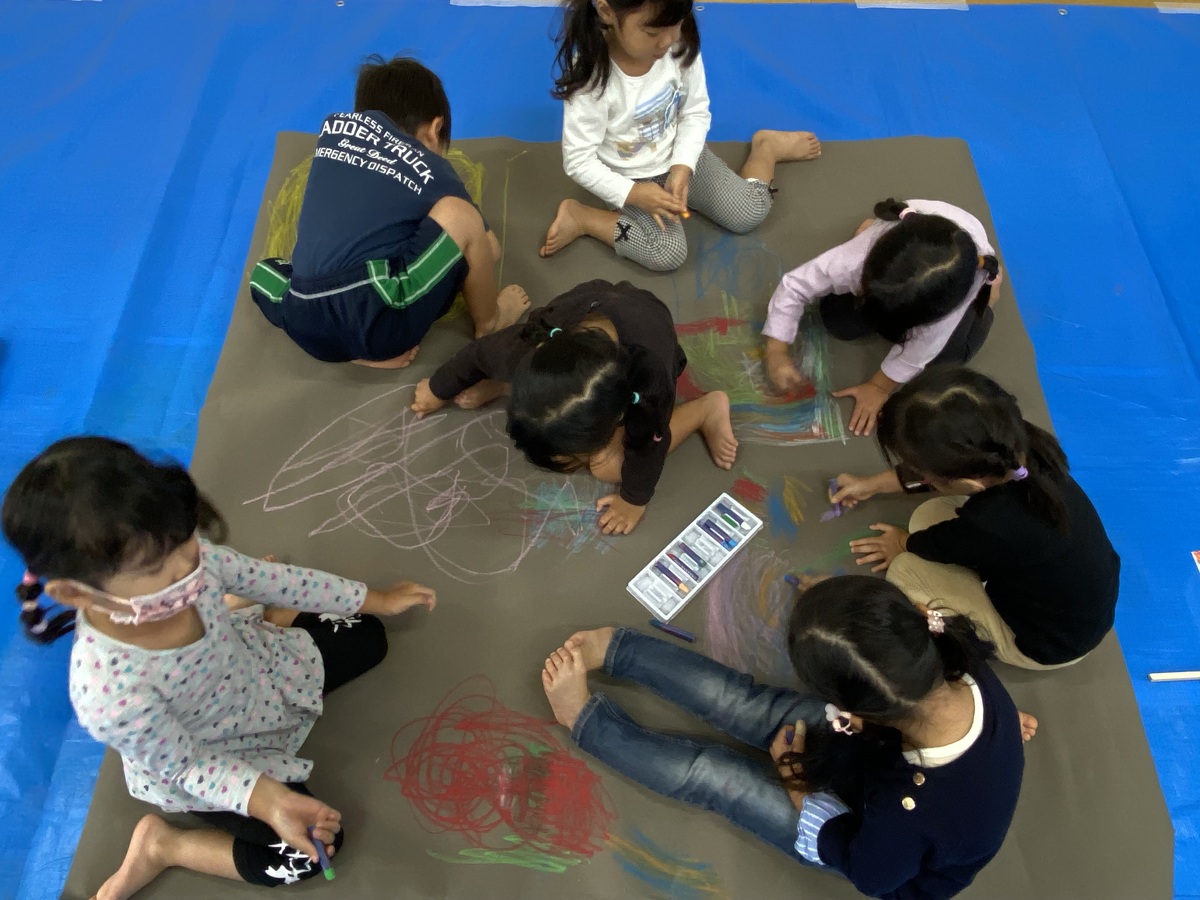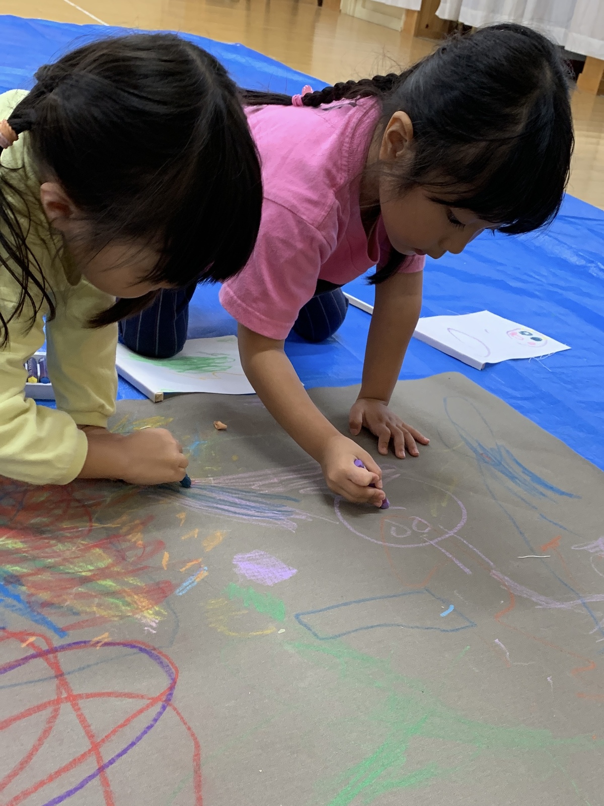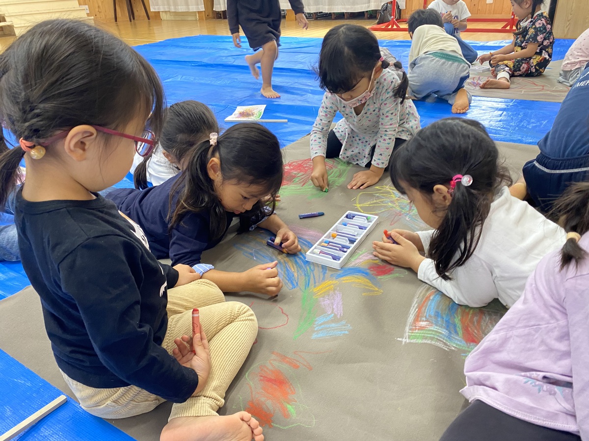 Cグループ(3歳児)のアートの日がありました。 2024年11月08日(金) Cグループ(3歳児)のアートの日がありました。キラキラえがおデーを終えて、キラキラえがおデーで感じた気持ちを色で表してみました。 「楽しかった気持ちの色」「ドキドキした気持ちの色」など、子どもたちはそれぞれキラキラえがおデーの時を思い出しながら旗に色を塗りました!大きな旗にも色を塗ってみました!紙とは違う発色に興味津々の子どもたち。 最後は、できあがった旗を振って「がんばれ〜!!」と元気いっぱい応援してみました♪ 後藤先生、素敵な時間をありがとうございました!