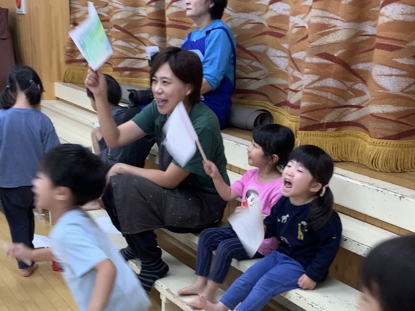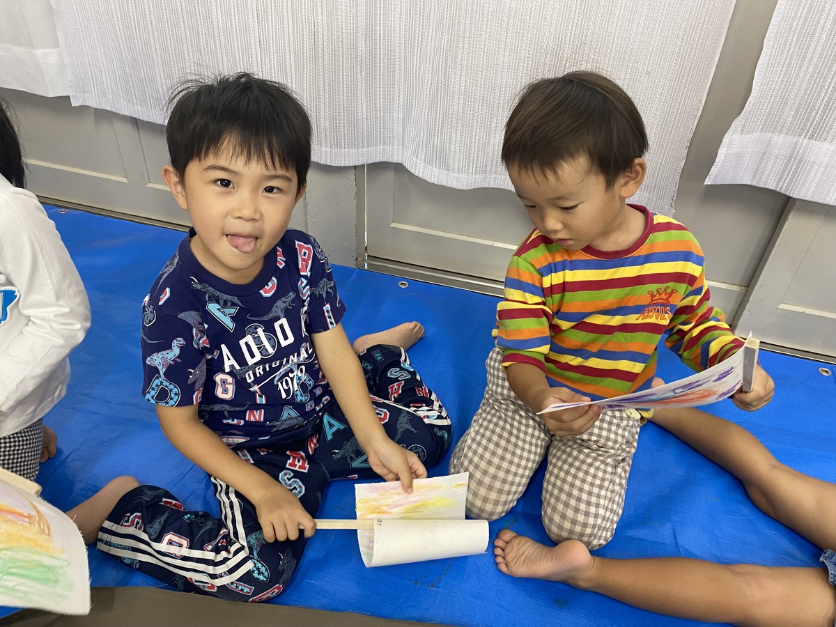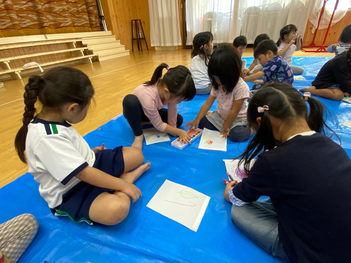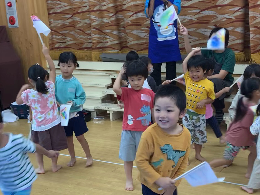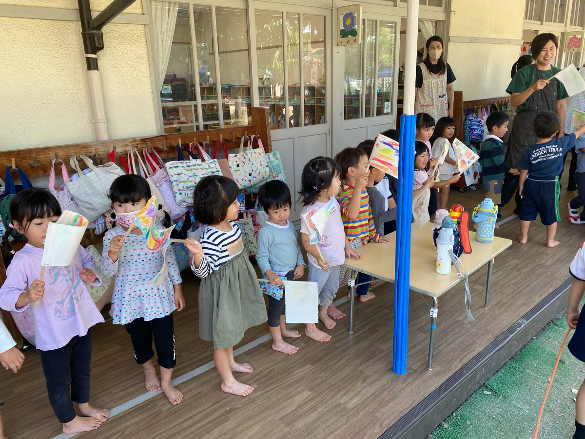 Cグループ(3歳児)のアートの日がありました。 2024年11月08日(金) Cグループ(3歳児)のアートの日がありました。キラキラえがおデーを終えて、キラキラえがおデーで感じた気持ちを色で表してみました。 「楽しかった気持ちの色」「ドキドキした気持ちの色」など、子どもたちはそれぞれキラキラえがおデーの時を思い出しながら旗に色を塗りました!大きな旗にも色を塗ってみました!紙とは違う発色に興味津々の子どもたち。 最後は、できあがった旗を振って「がんばれ〜!!」と元気いっぱい応援してみました♪ 後藤先生、素敵な時間をありがとうございました!