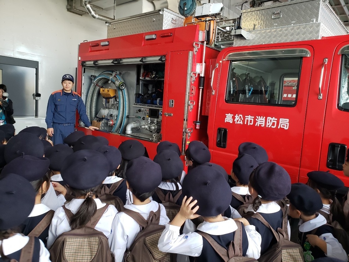 Aグループ(5歳児)が消防署見学へ、高松南消防署まで歩いて行きました。