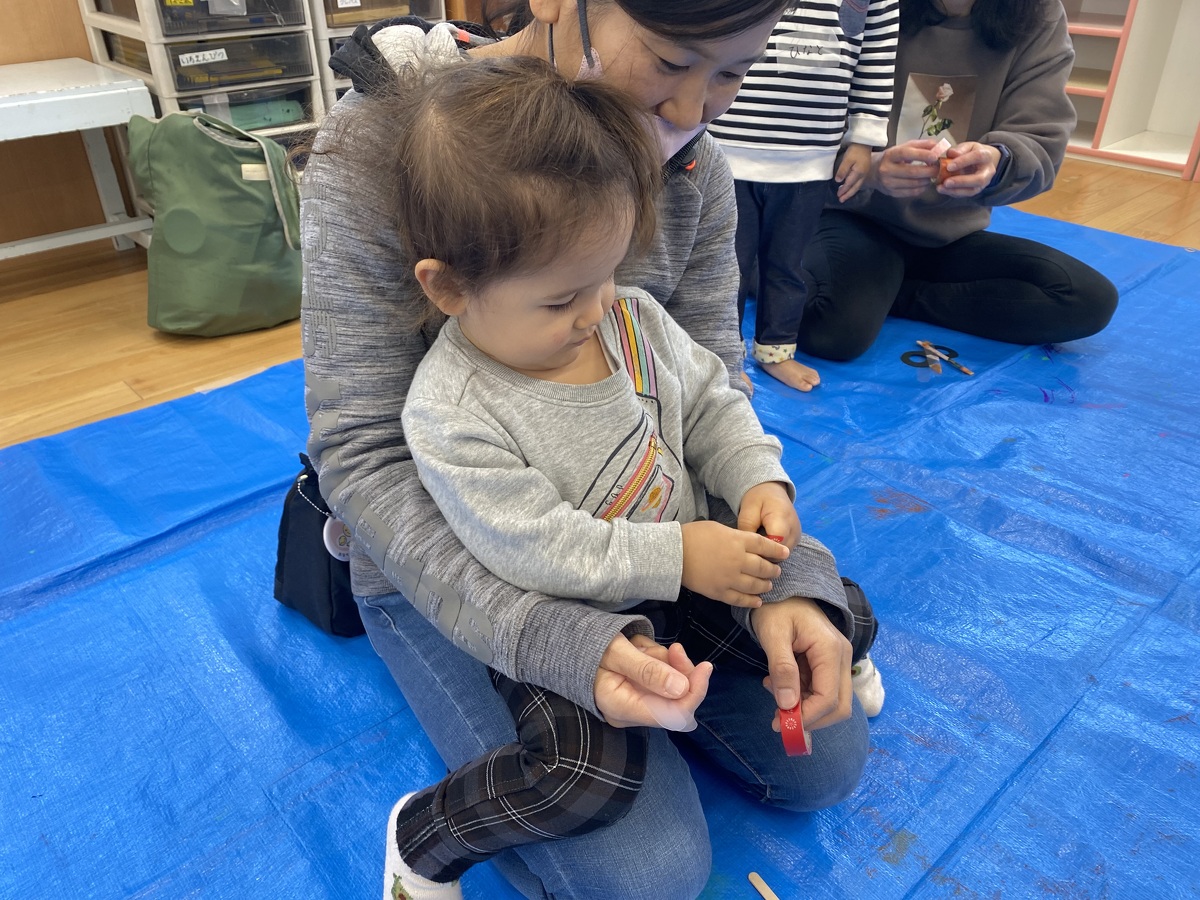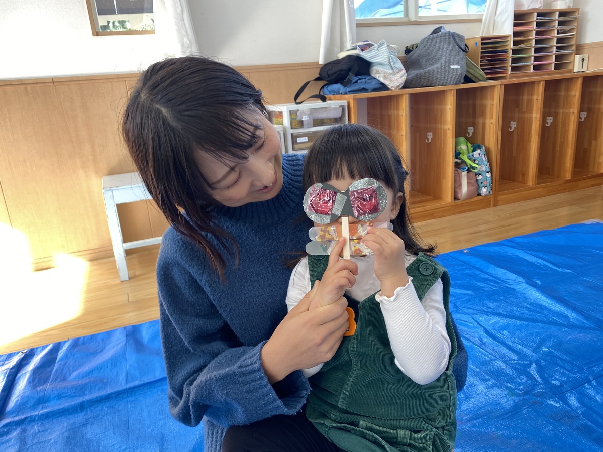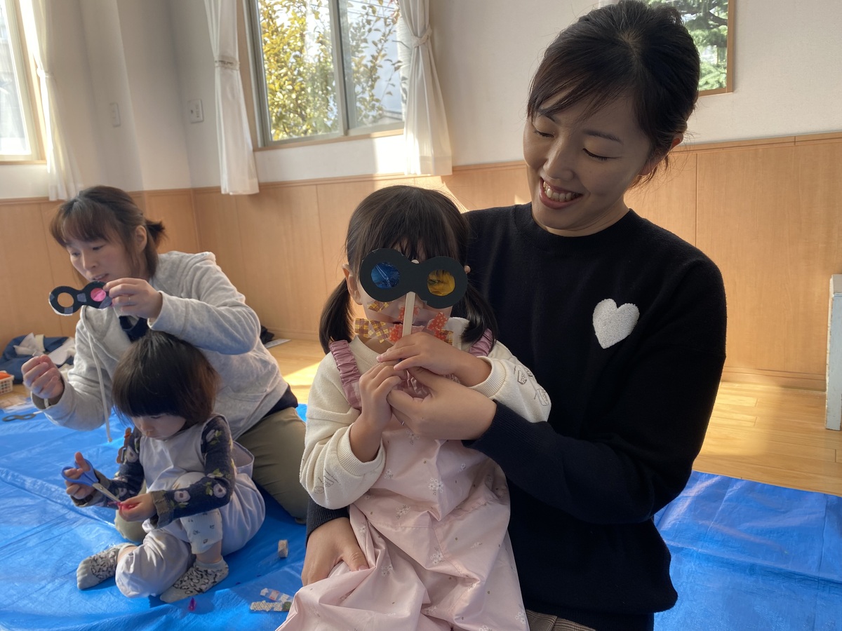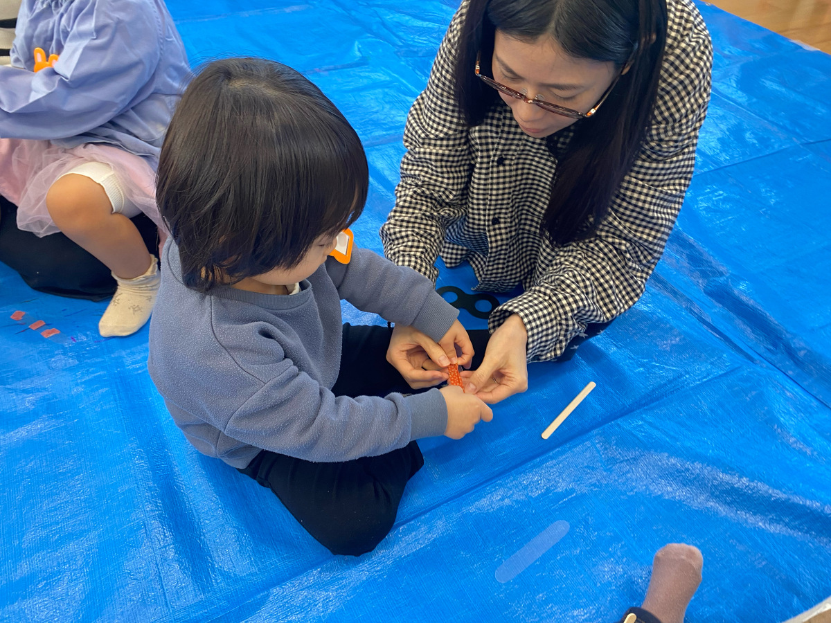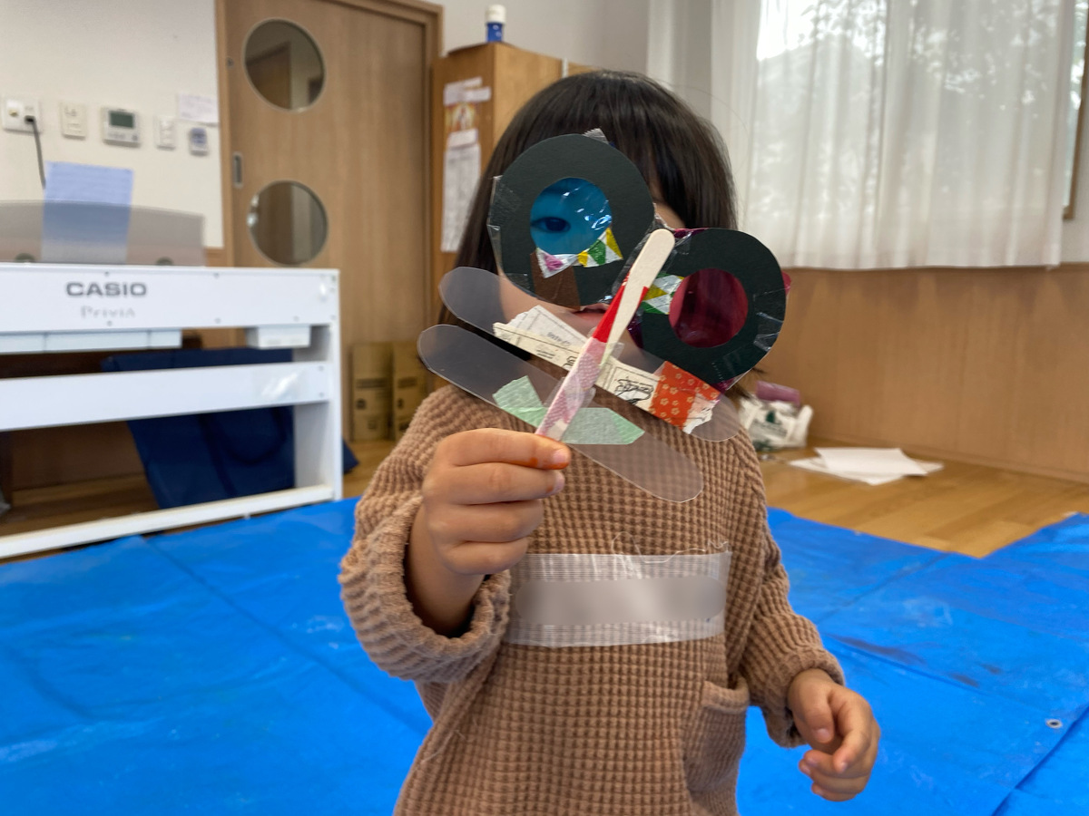 つぼみ・プチつぼみクラスのおえかきあそびがありました。 2024年12月10日(火) つぼみ・プチつぼみクラスのおえかきあそびがありました。はじめは、宮地先生のパネルシアターや読み聞かせ。秋の七草やどんぐりの童歌も教えていただきました♪ とんぼの絵本を読んで、みんなの指にとんぼさんが飛んできたところで、後藤先生と一緒にとんぼの製作です!秋の色のマスキングテープをちぎって貼って、可愛いとんぼさんのできあがり♪とんぼのメガネで見ると周りがどんな色に見えたかな? 宮地先生、後藤先生、今回も楽しい時間をありがとうございました!!