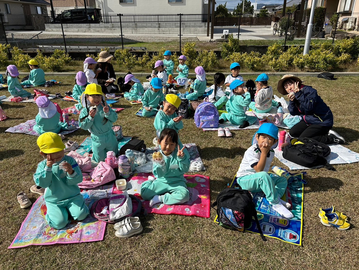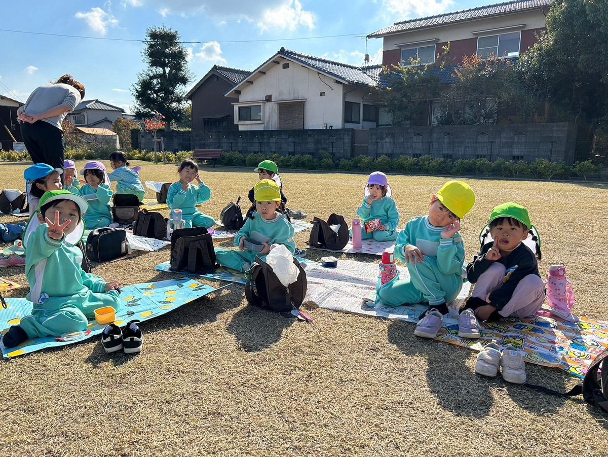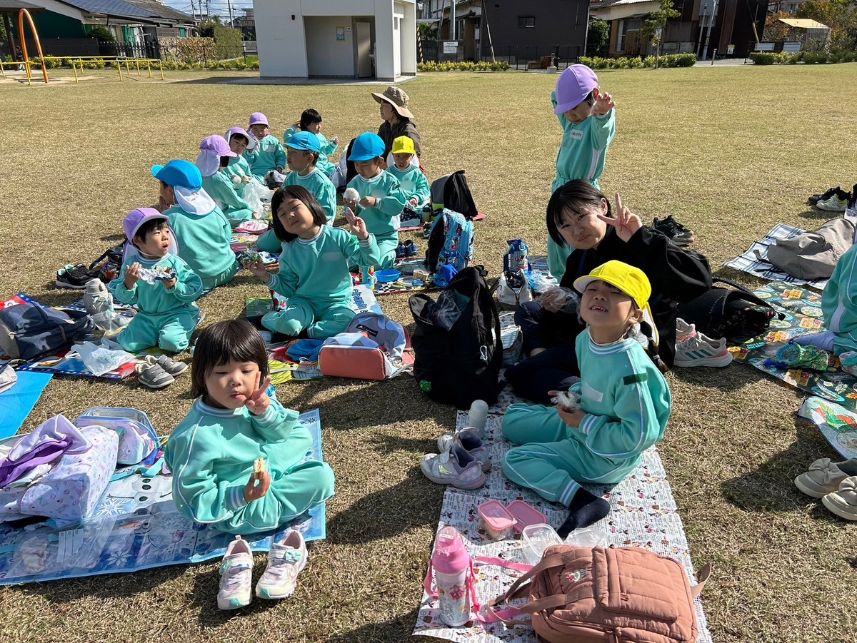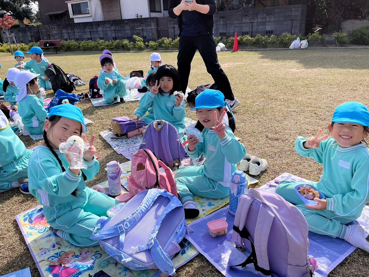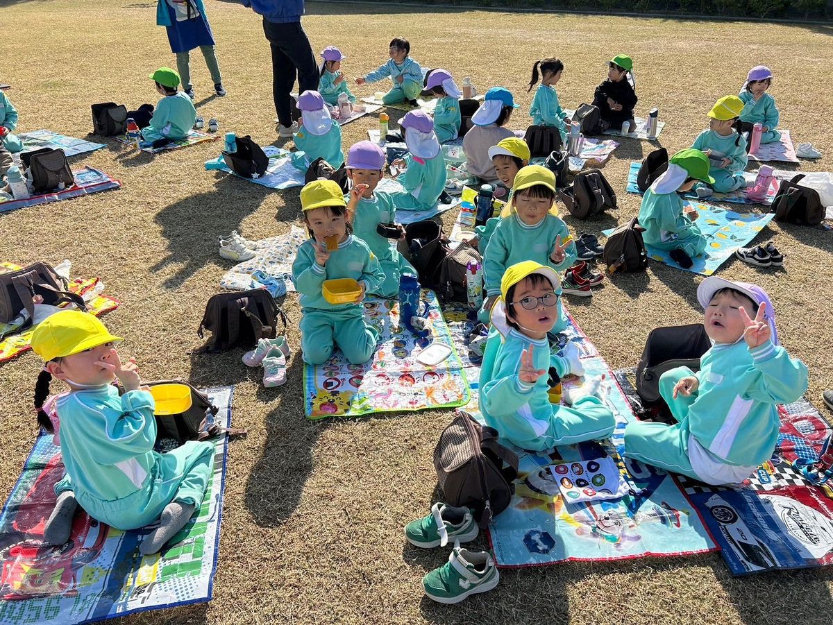 園外保育・遠足ごっこを行いました。 2024年12月10日(火) ABCグループ(3・4・5歳児)さんは太田南皿井公園までお出かけ、Dグループ(満3歳児)さんは、幼稚園の園庭で遠足ごっこをしました! 太田南皿井公園では、体操やかけっこをしたり縄跳びや遊具で遊んだり、たっぷり楽しみました♪ どのグループもみんな自分のレジャーシートを広げて、お友だちや先生と一緒に、おにぎりとおやつを食べました!みんなのお顔を見ながら食べられて嬉しかったですね♪ 秋の自然を感じたり、普段と少し違った体験をしたりして、とても楽しい1日になりました!