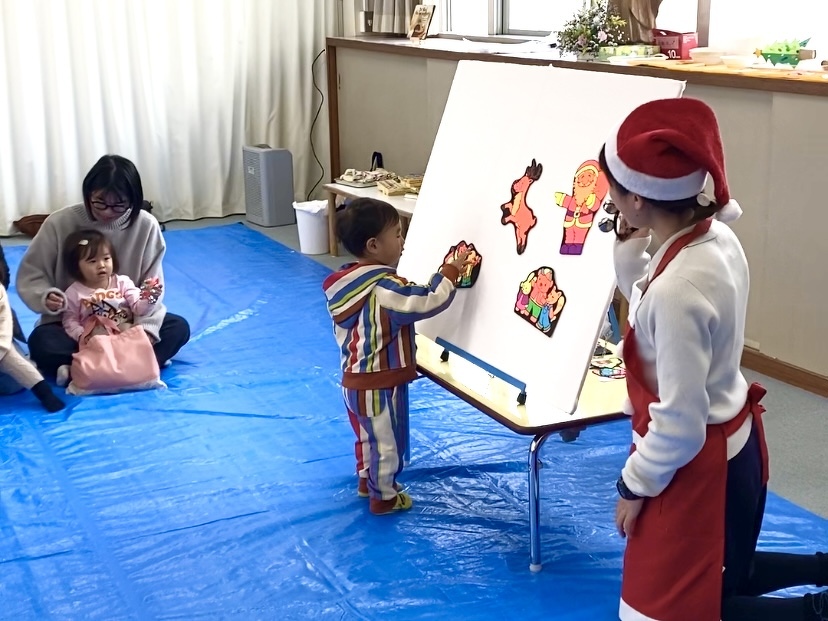 次に、クリスマスのパネルシアターを「赤鼻のトナカイ」や「ジングルベル」の曲に乗せて楽しみました!みんなでリズムに合わせて鈴も鳴らしてみました♪