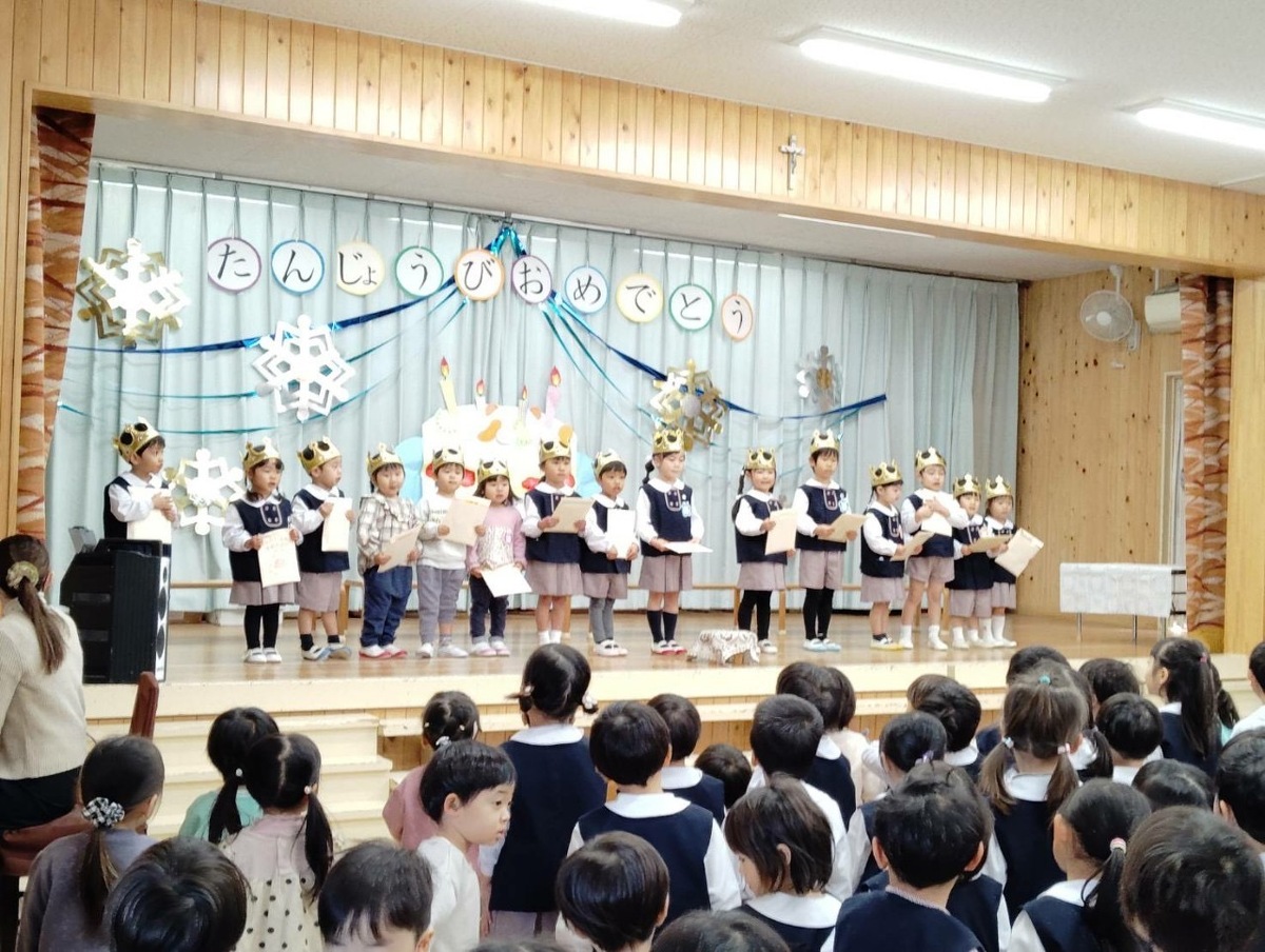 12月生まれの誕生日会がありました。ドキドキ緊張したお友だちも先生と一緒に、頑張って発表することができました!