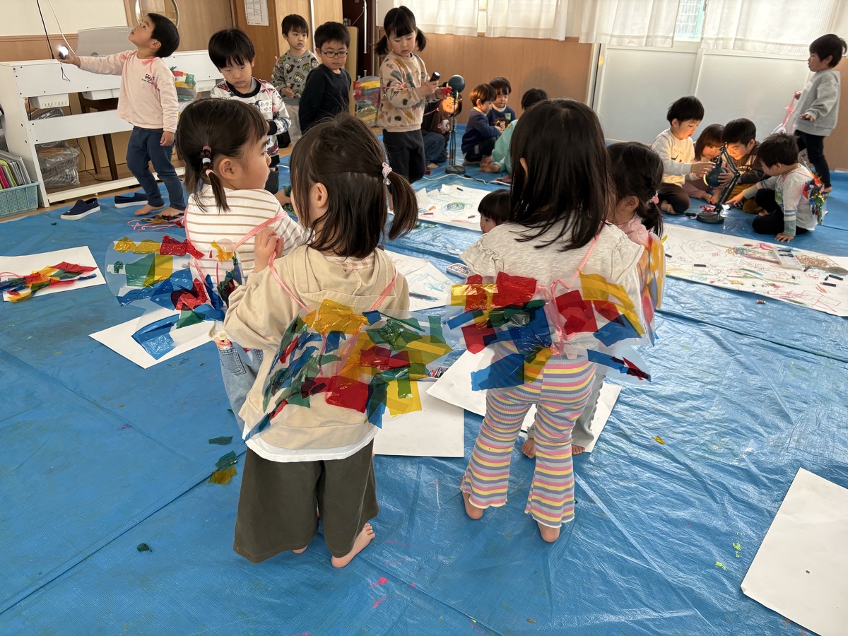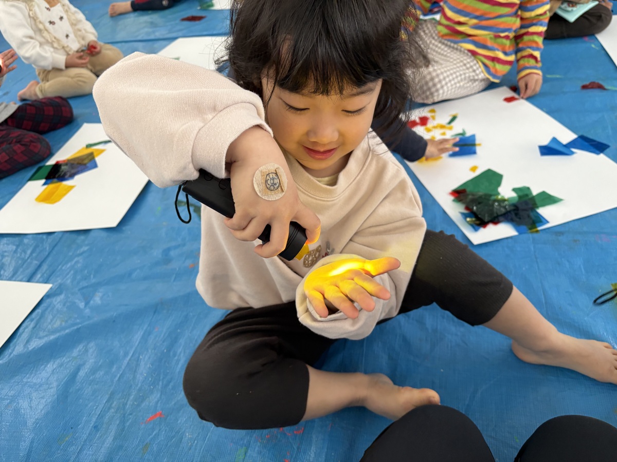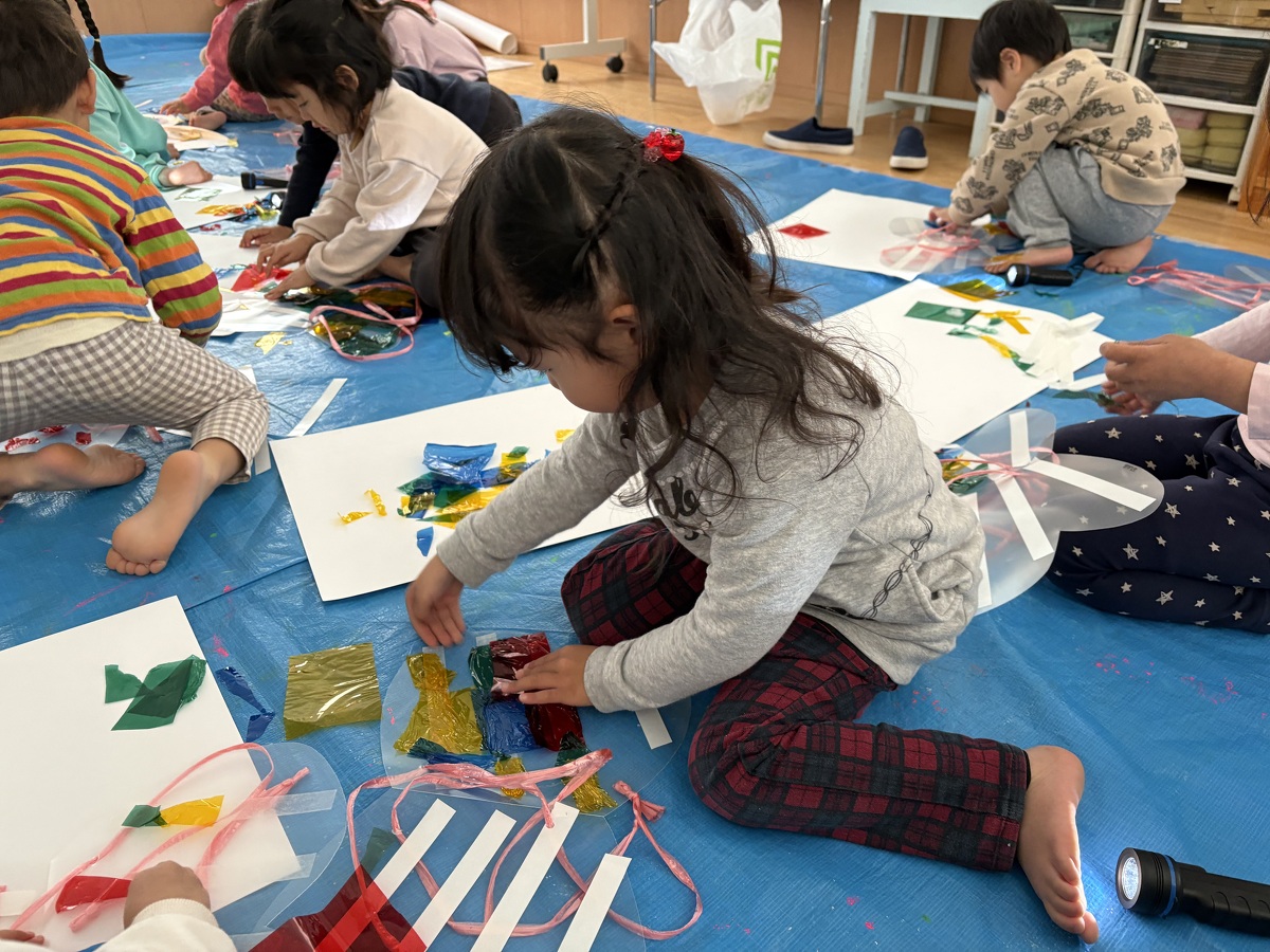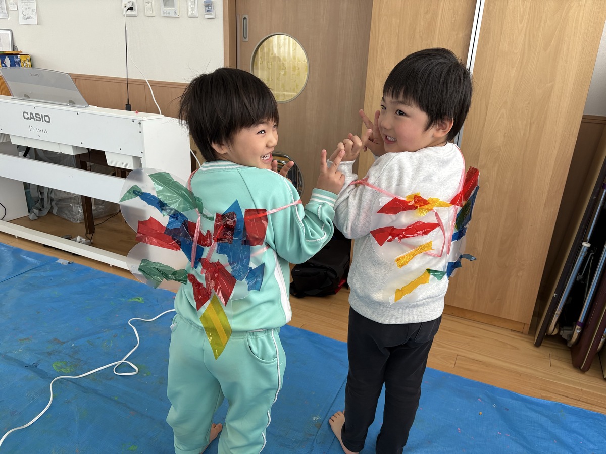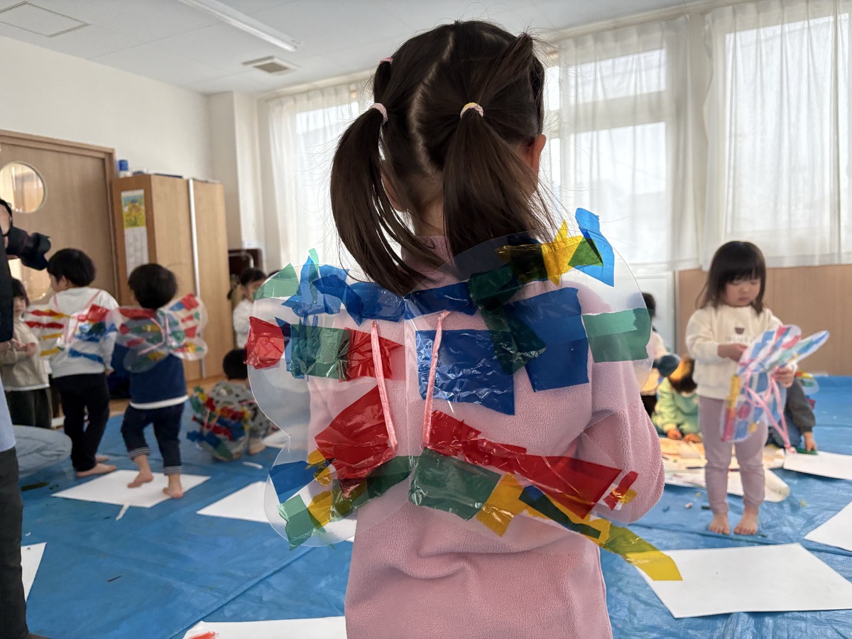Cグループ(3歳児)のアートの日がありました。 2025年03月06日(木) Cグループ(3歳児)の最後のアートの日がありました。 初めに、「はらぺこあおむし」の絵本を読みました。みんなでちょうちょになろう!ということで、羽にカラーセロハンを貼っていきます。セロハンをライトに透かして、光の色が変わることも楽しみました! 最後には、できた羽を背負って、可愛いちょうちょさんに変身!! 後藤先生、今回も素敵なアートの時間となりました♪1年間ありがとうございました!