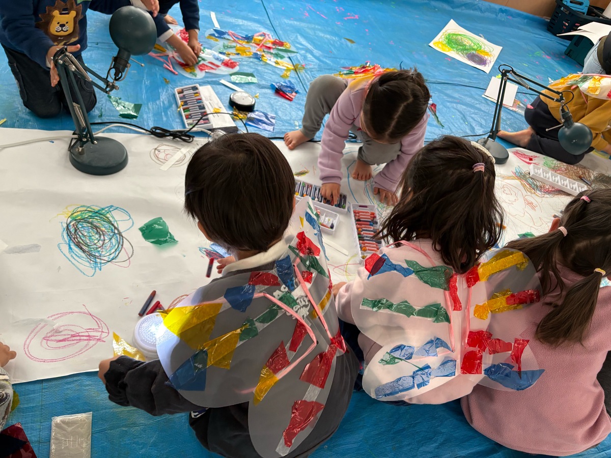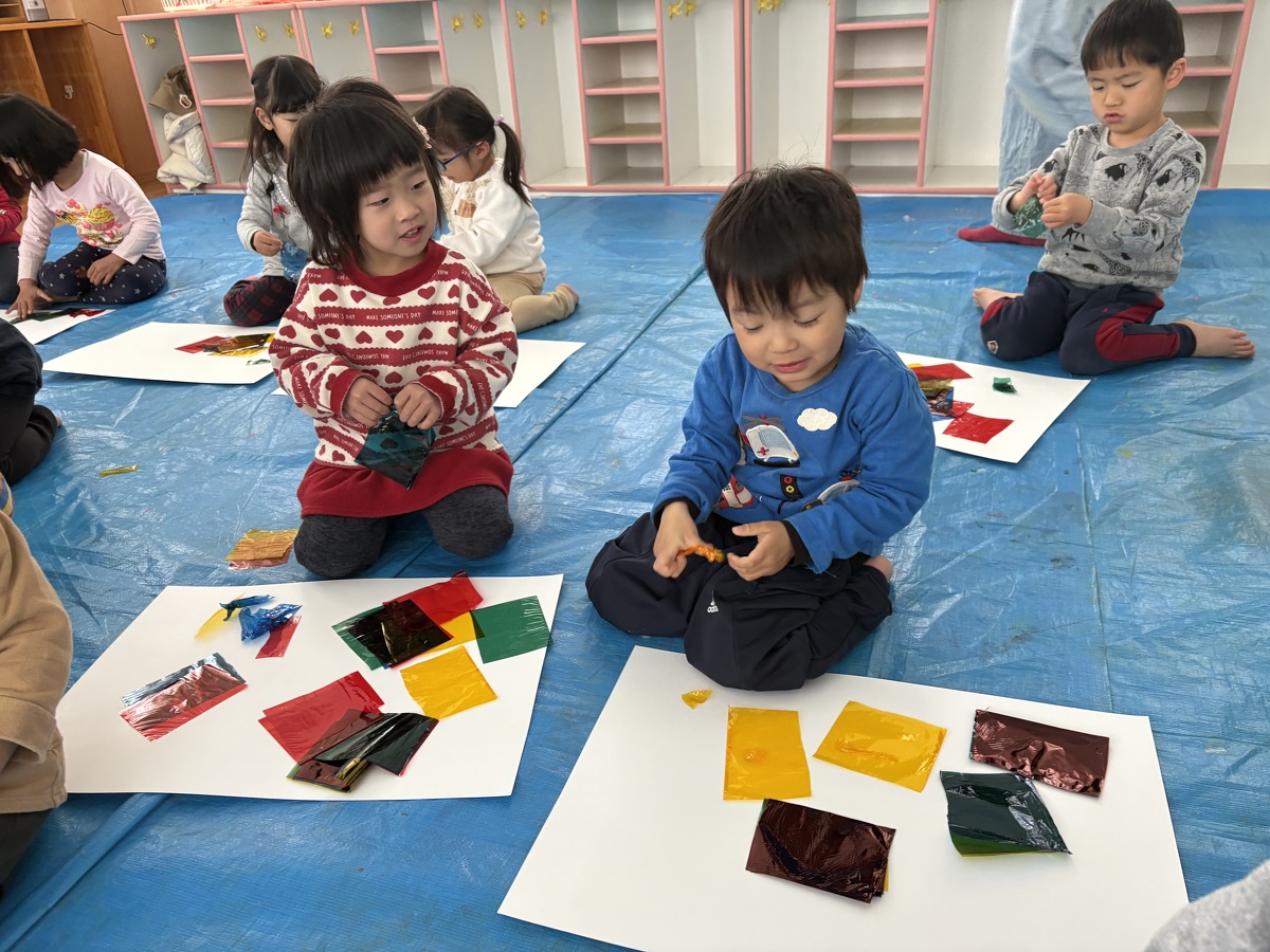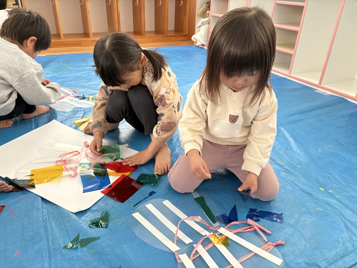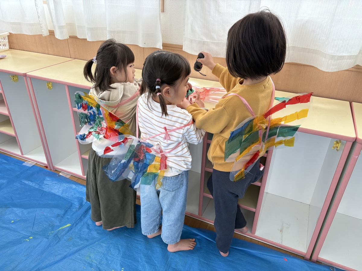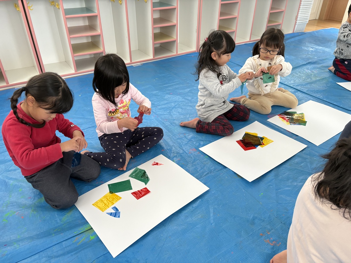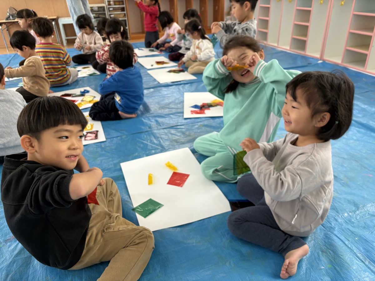 Cグループ(3歳児)のアートの日がありました。 2025年03月06日(木) Cグループ(3歳児)の最後のアートの日がありました。 初めに、「はらぺこあおむし」の絵本を読みました。みんなでちょうちょになろう!ということで、羽にカラーセロハンを貼っていきます。セロハンをライトに透かして、光の色が変わることも楽しみました! 最後には、できた羽を背負って、可愛いちょうちょさんに変身!! 後藤先生、今回も素敵なアートの時間となりました♪1年間ありがとうございました!