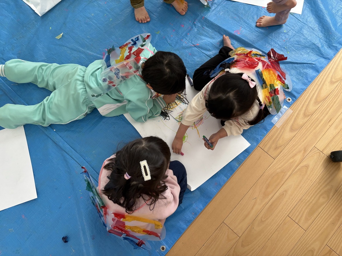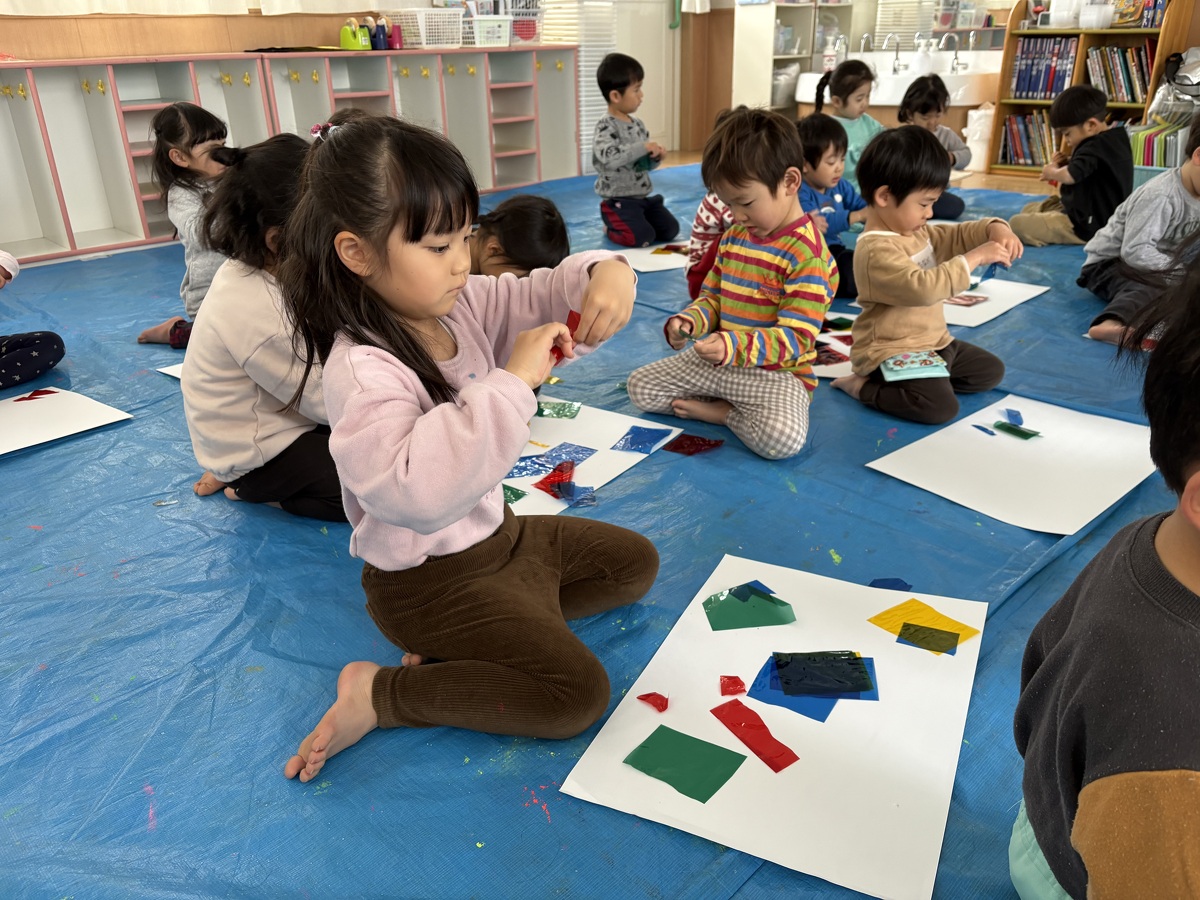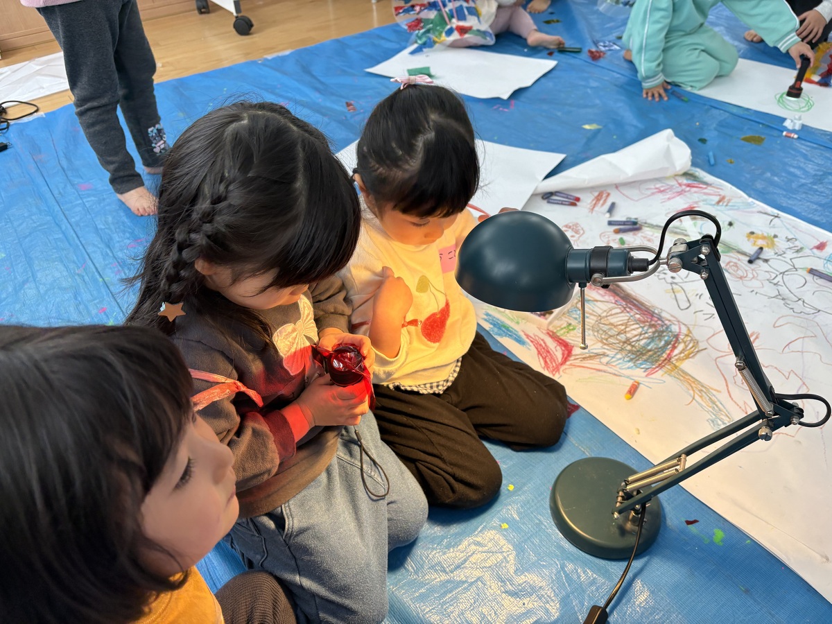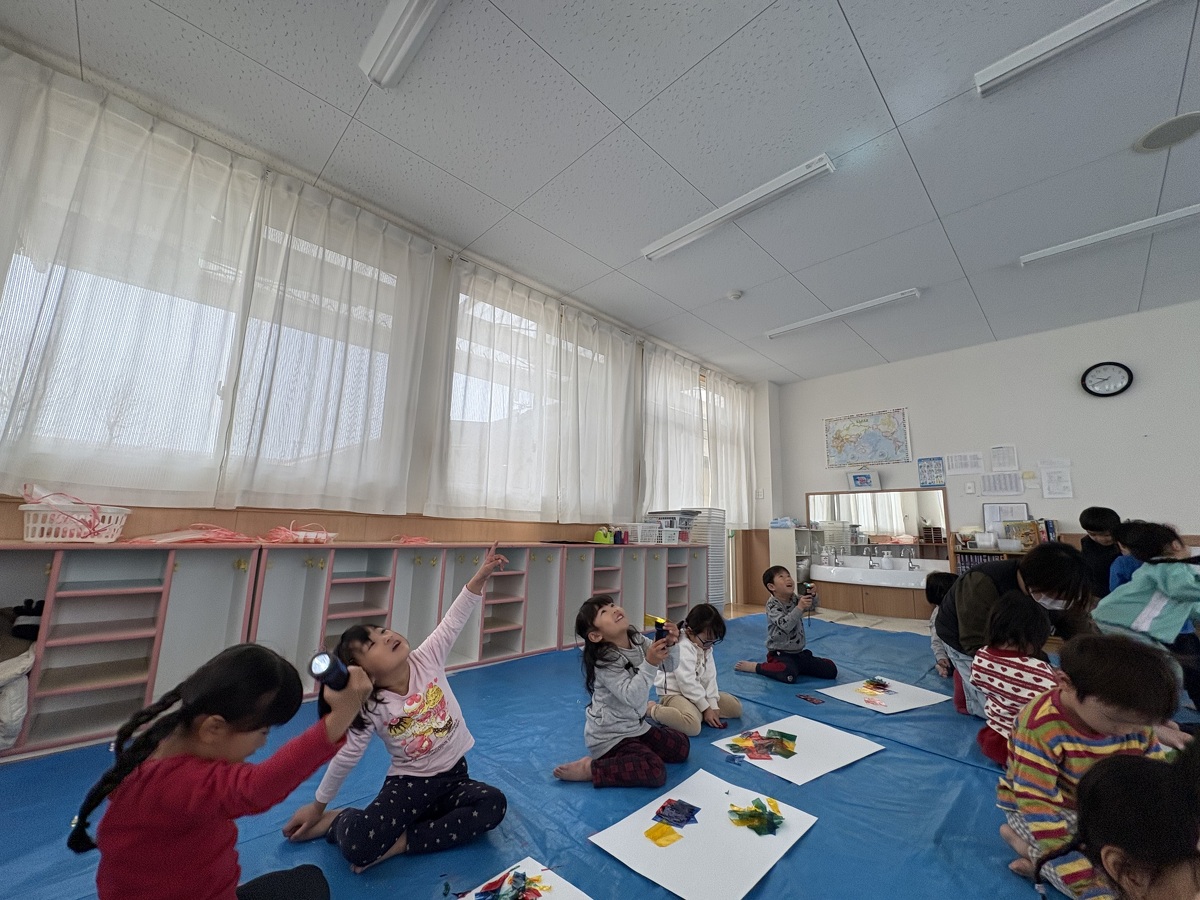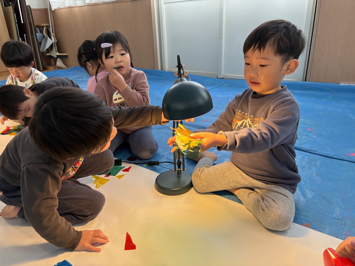 Cグループ(3歳児)のアートの日がありました。 2025年03月06日(木) Cグループ(3歳児)の最後のアートの日がありました。 初めに、「はらぺこあおむし」の絵本を読みました。みんなでちょうちょになろう!ということで、羽にカラーセロハンを貼っていきます。セロハンをライトに透かして、光の色が変わることも楽しみました! 最後には、できた羽を背負って、可愛いちょうちょさんに変身!! 後藤先生、今回も素敵なアートの時間となりました♪1年間ありがとうございました!