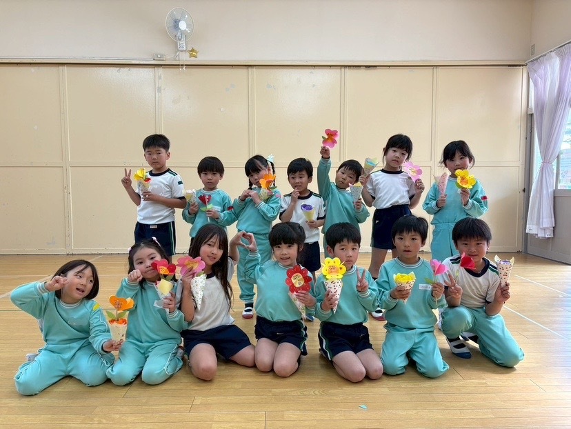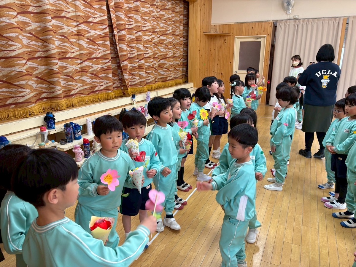 預かり保育で、Aグループさんのお別れ会を行いました。まず、BCDグループさんが心を込めて作った可愛いお花をAグループさんにプレゼントしました。