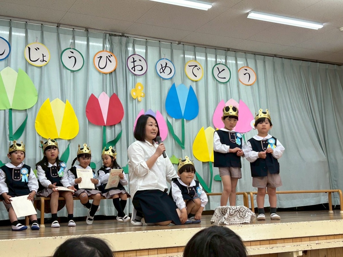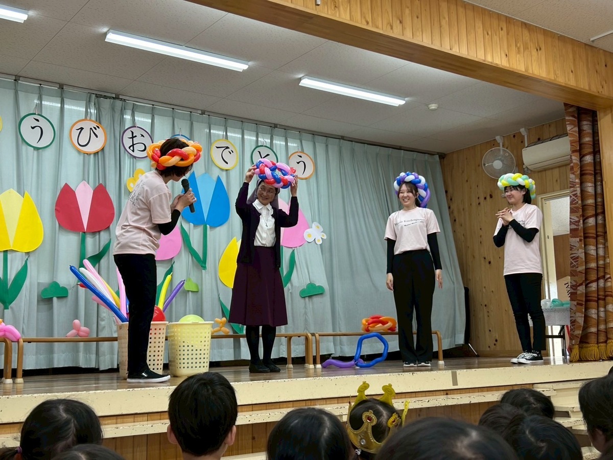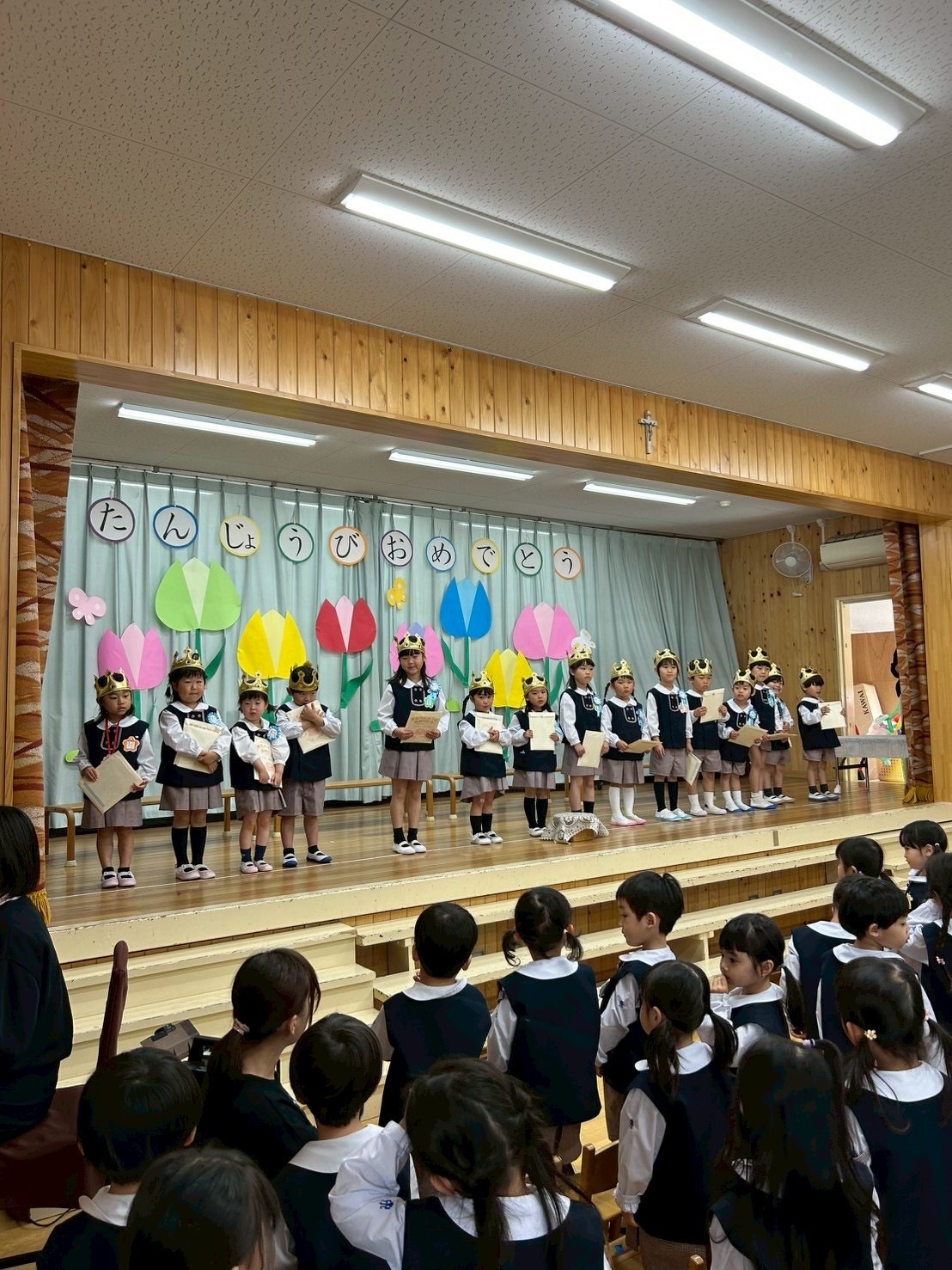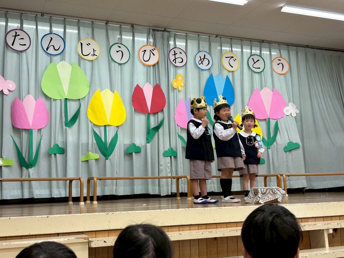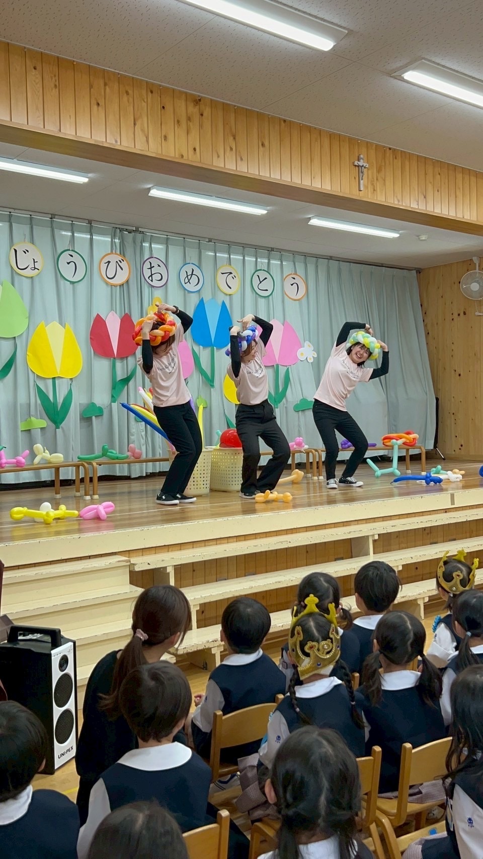 4月生まれのお誕生会がありました! 2025年04月25日(金) 今年度初めてのお誕生会✴︎ドキドキしながらも頑張って発表することができました! 先生と一緒に「ふうせんのうた」にのせて手遊びをした後、ハッピーバルーン隊(先生たち)によるバルーンアートを見ました!「どんな色が好き」の歌をみんなで歌いながらバルーンアートを楽しみましたね♫冠を貰ってみんなもハッピーバルーン隊の仲間になりました⭐︎