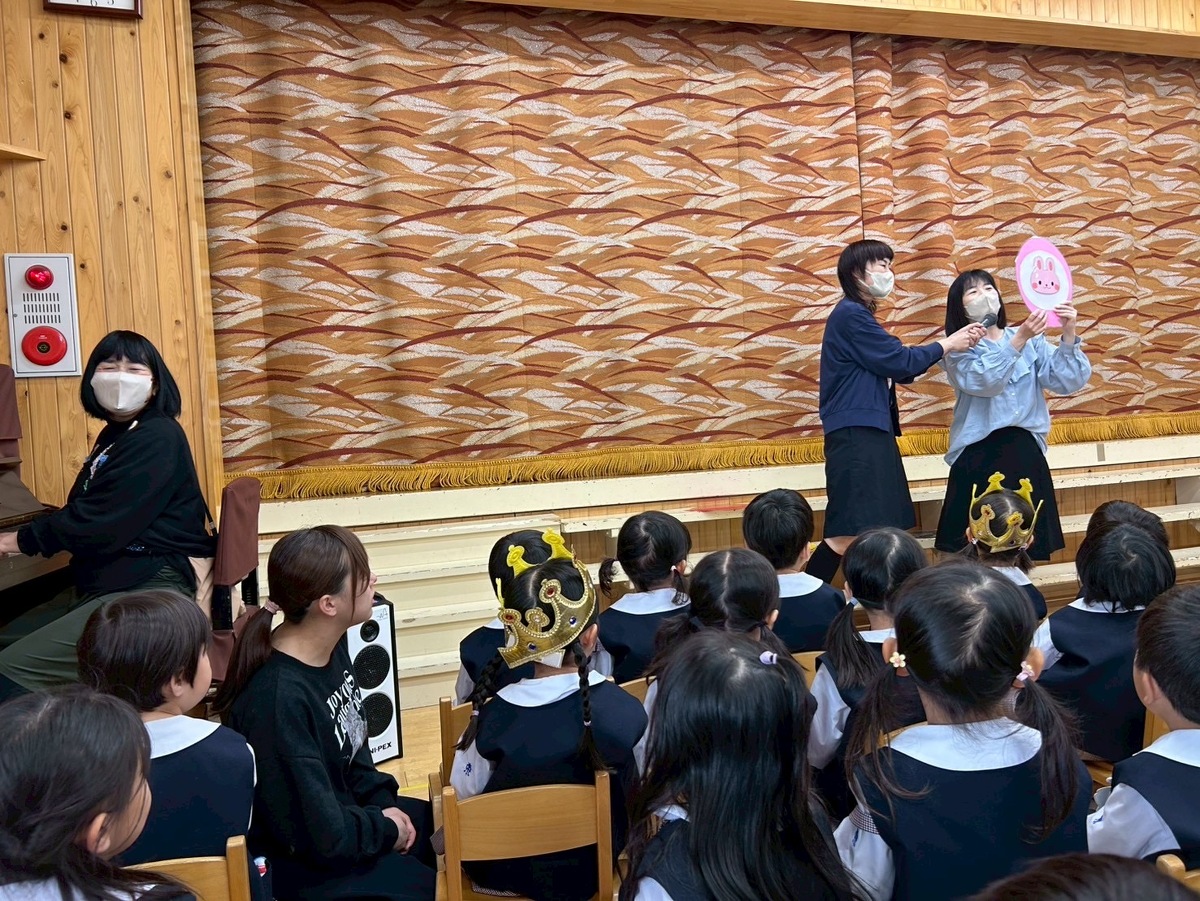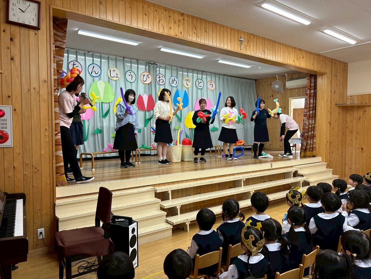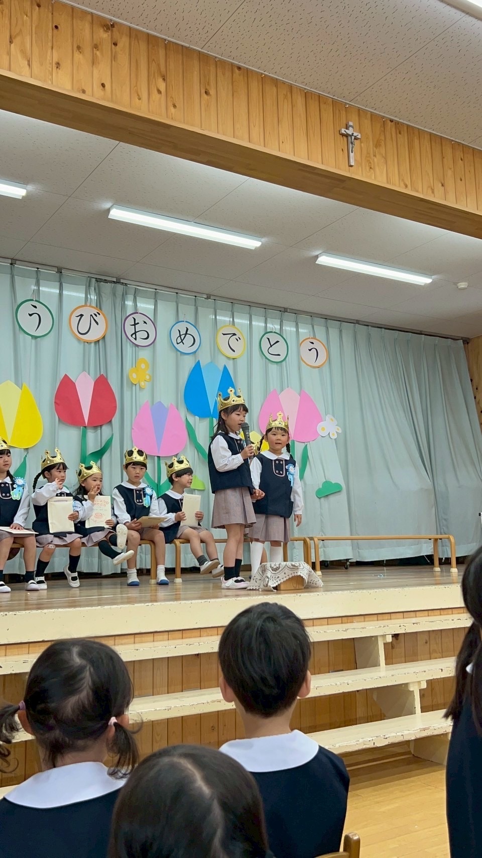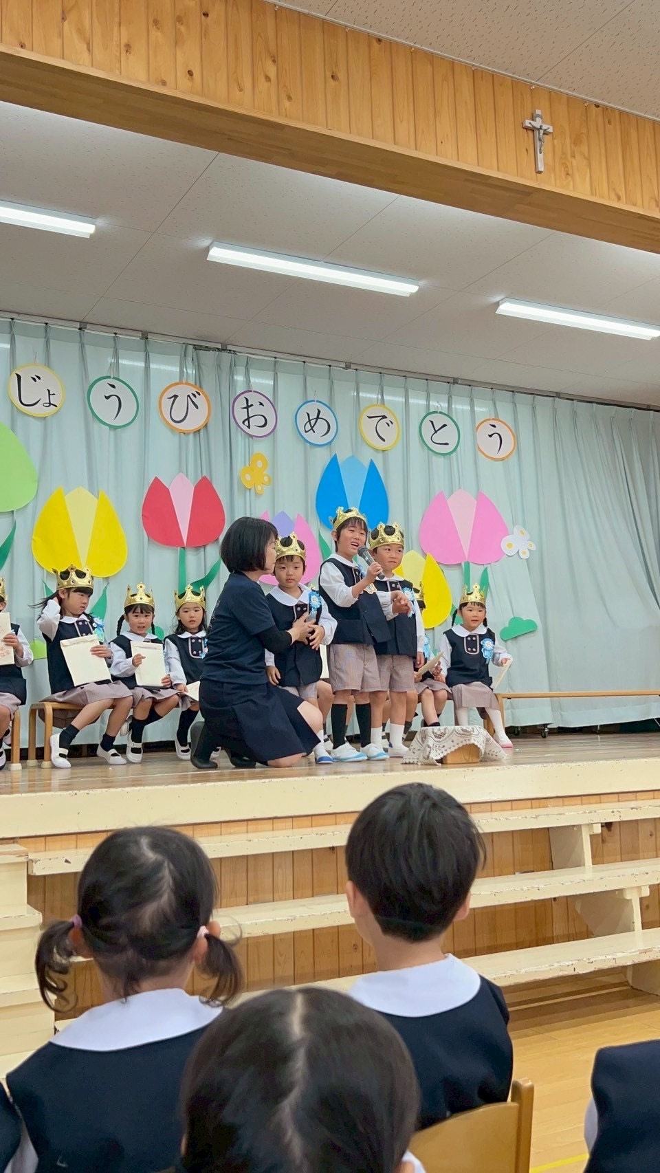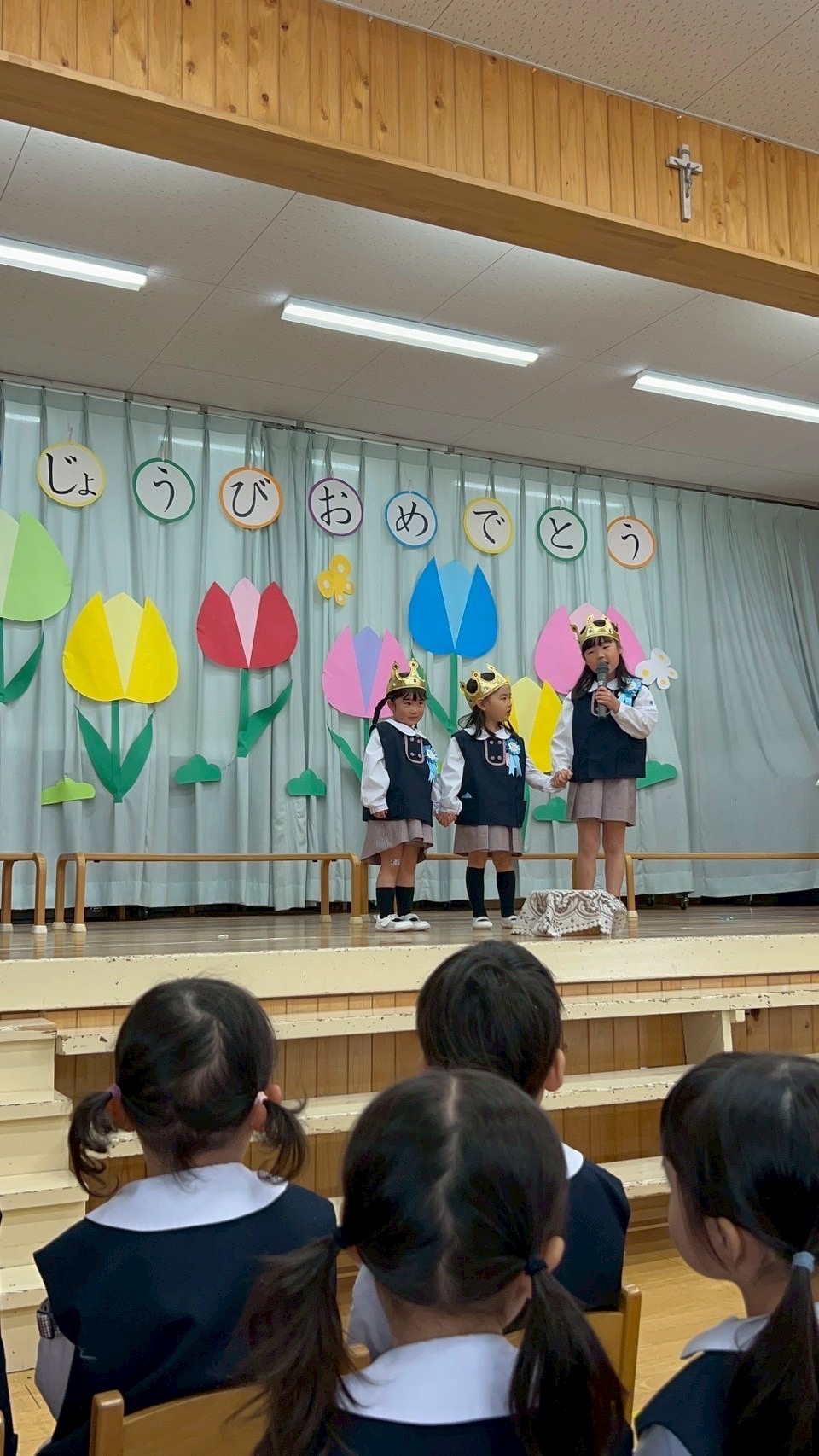 4月生まれのお誕生会がありました! 2025年04月25日(金) 今年度初めてのお誕生会✴︎ドキドキしながらも頑張って発表することができました! 先生と一緒に「ふうせんのうた」にのせて手遊びをした後、ハッピーバルーン隊(先生たち)によるバルーンアートを見ました!「どんな色が好き」の歌をみんなで歌いながらバルーンアートを楽しみましたね♫冠を貰ってみんなもハッピーバルーン隊の仲間になりました⭐︎