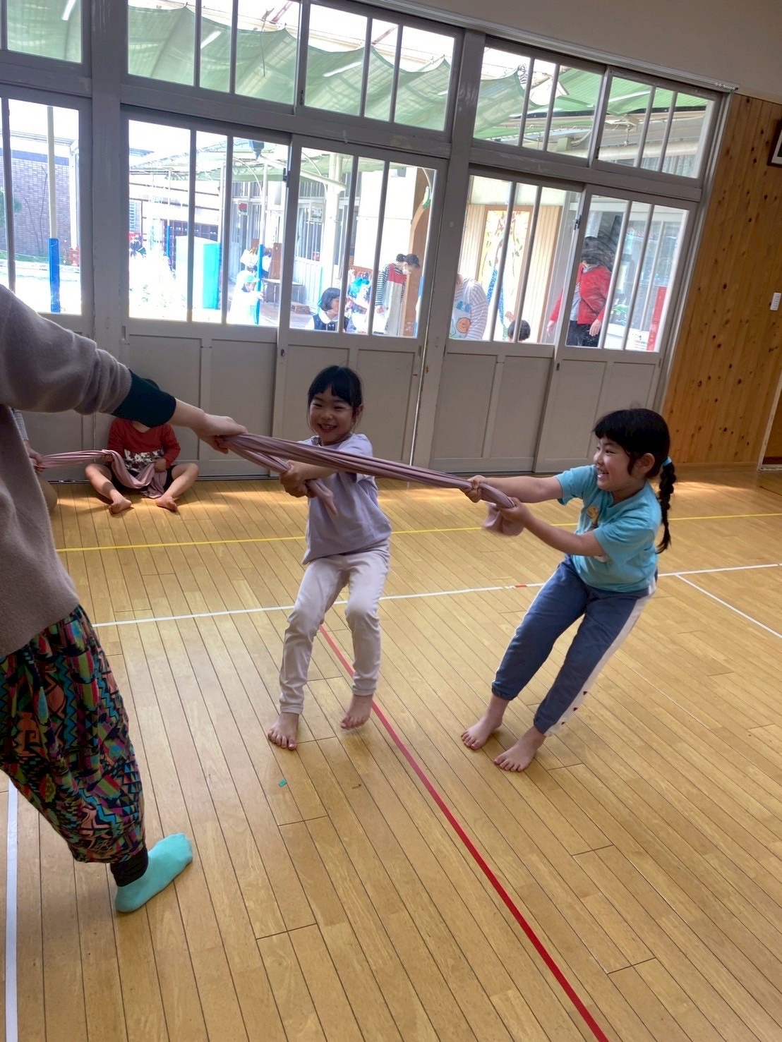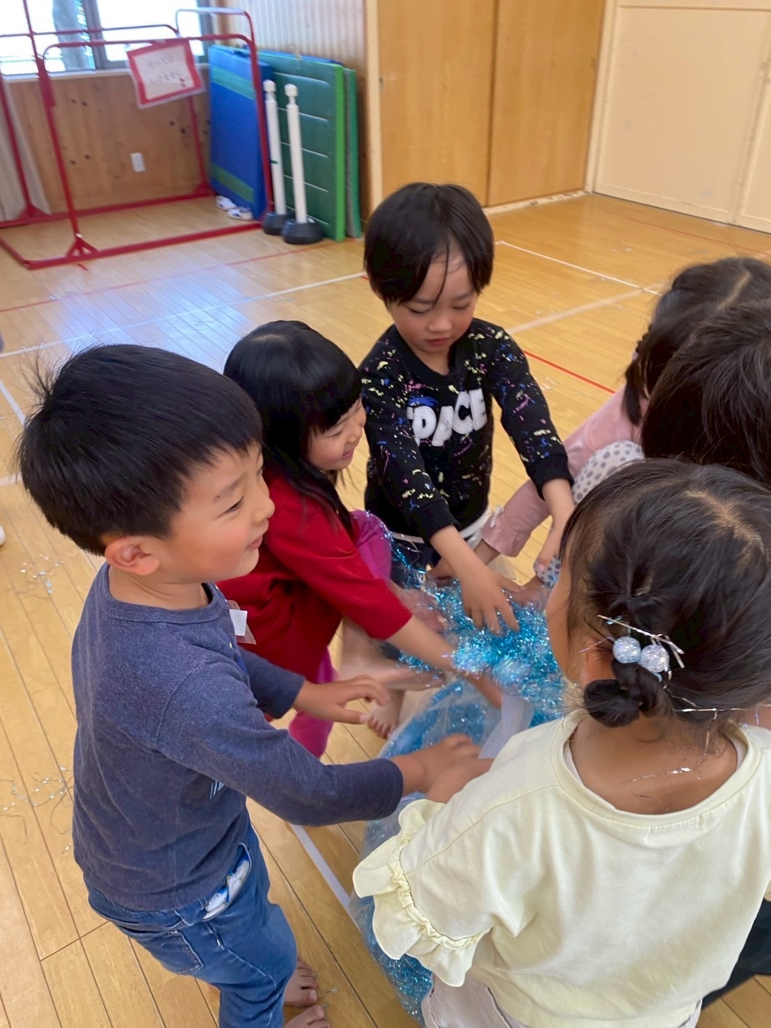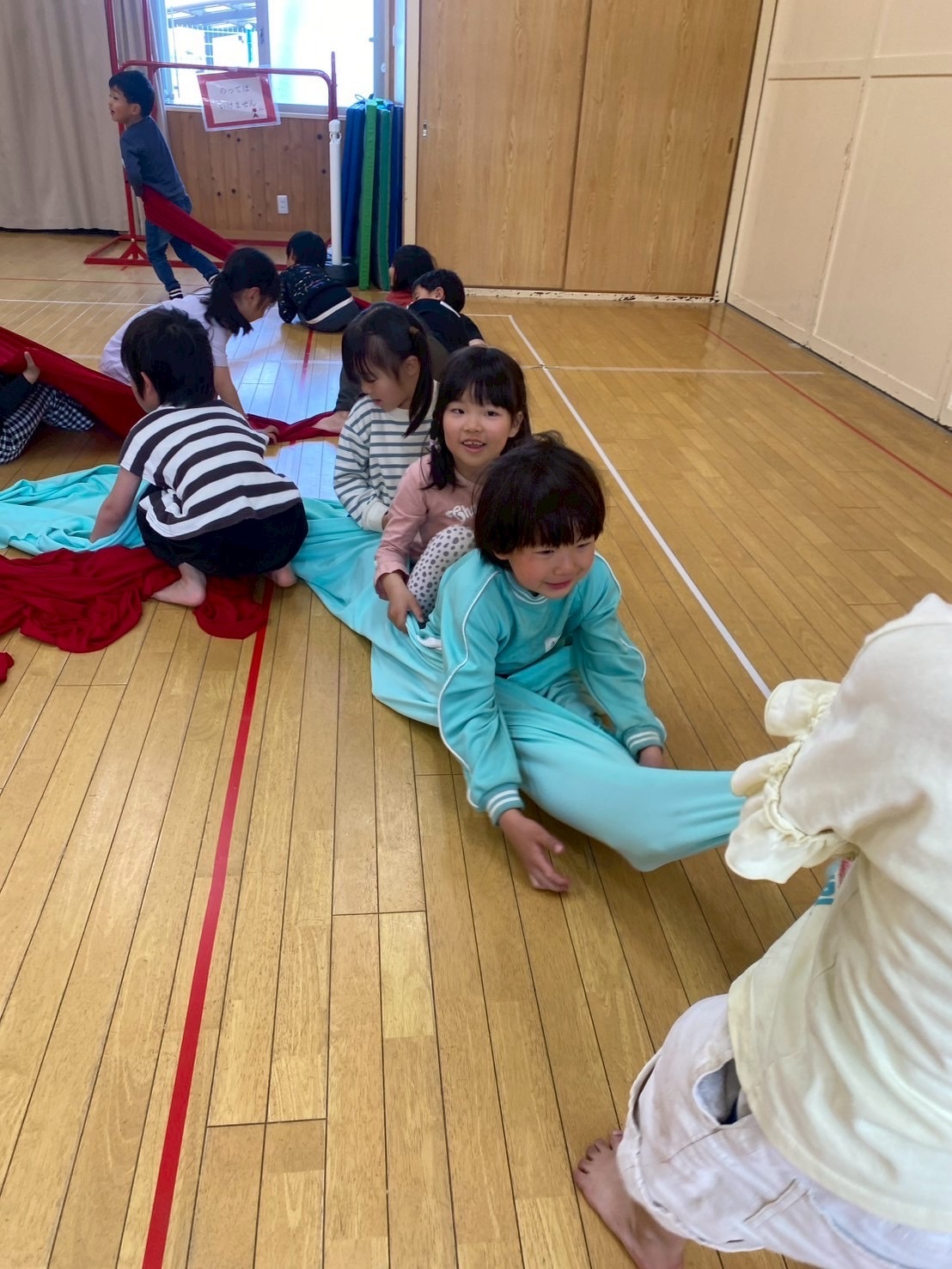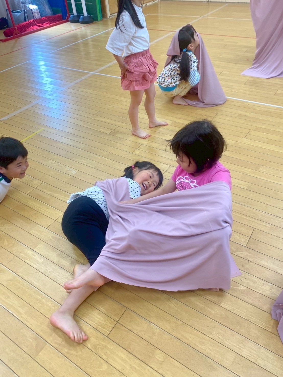 Aグループ(5歳児)アートの日がありました! 2025年04月25日(金) Aグループ(5歳児)アートの日がありました。まずは音楽に合わせて準備運動!次に、怪我をしないようにうまく体を使い、危なくない身体の使い方を実際に動きながら確認しました! 大きな布を使っての表現では、寝転んだり、くるまったり、一枚の布で、いろいろな表現ができました♫ 最後は、様々な素材に触れてみんなで表現を楽しみました⭐︎ みきゆき先生、楽しい時間をありがとうございました!