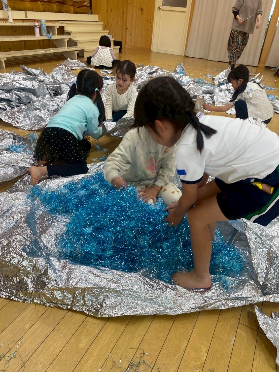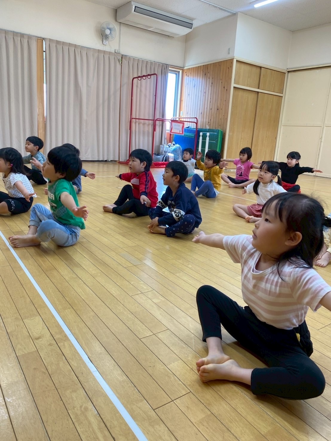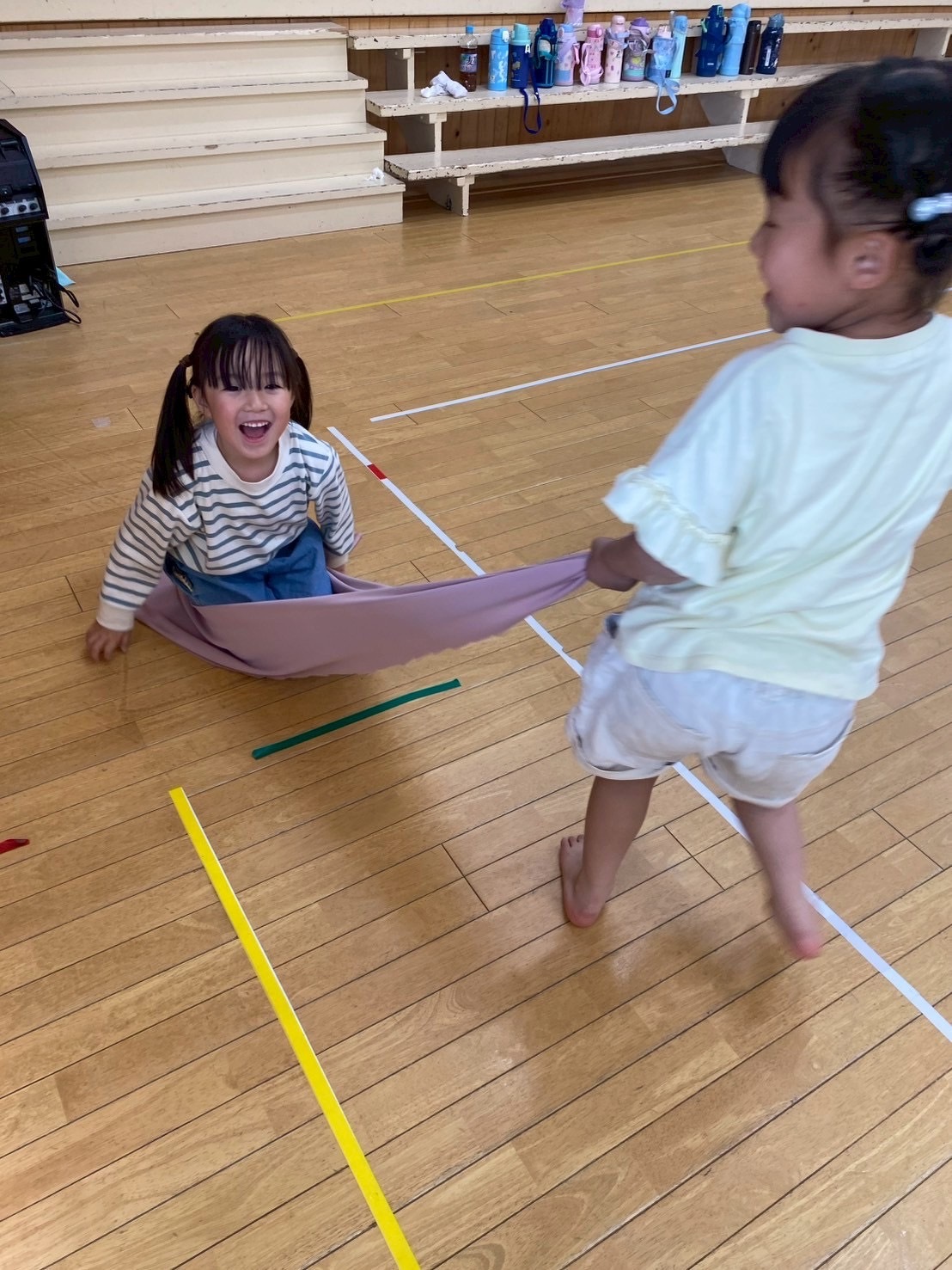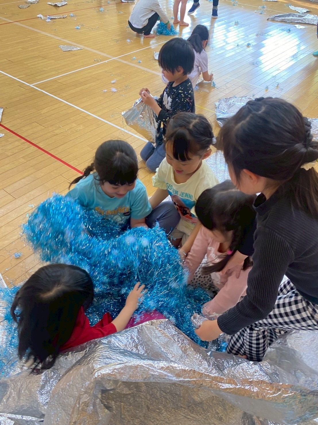 Aグループ(5歳児)アートの日がありました! 2025年04月25日(金) Aグループ(5歳児)アートの日がありました。まずは音楽に合わせて準備運動!次に、怪我をしないようにうまく体を使い、危なくない身体の使い方を実際に動きながら確認しました! 大きな布を使っての表現では、寝転んだり、くるまったり、一枚の布で、いろいろな表現ができました♫ 最後は、様々な素材に触れてみんなで表現を楽しみました⭐︎ みきゆき先生、楽しい時間をありがとうございました!