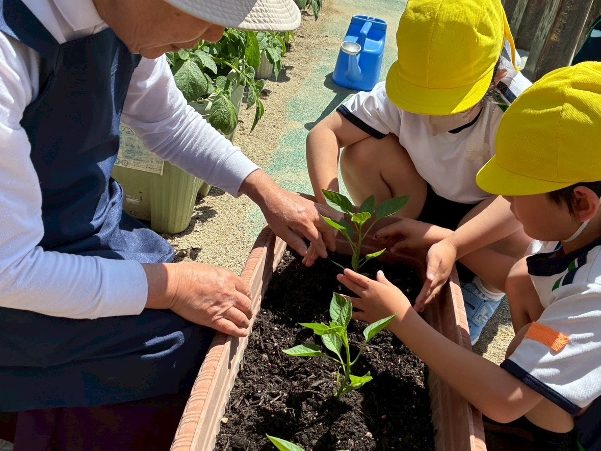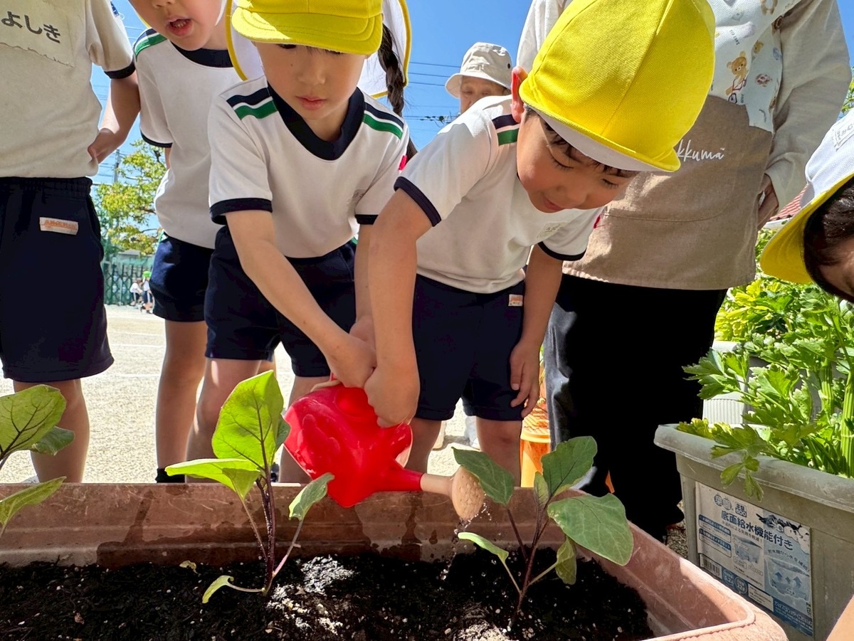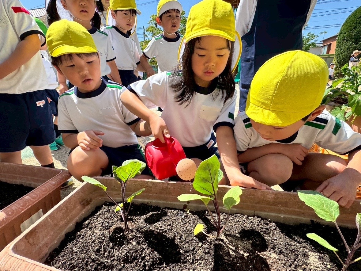 Aグループ(5歳児)野菜の苗を植えました☀︎ 2025年05月22日(木) シスターと一緒にナスとピーマンの苗を植えました♪ 鉢に苗を優しく植えたり、「大きくなーれ!」「美味しくなーれ!」と思いを込めて水やりをしました✴︎ みんなで大切に育てましょうね♬ 美味しいナスとピーマンができますように♡