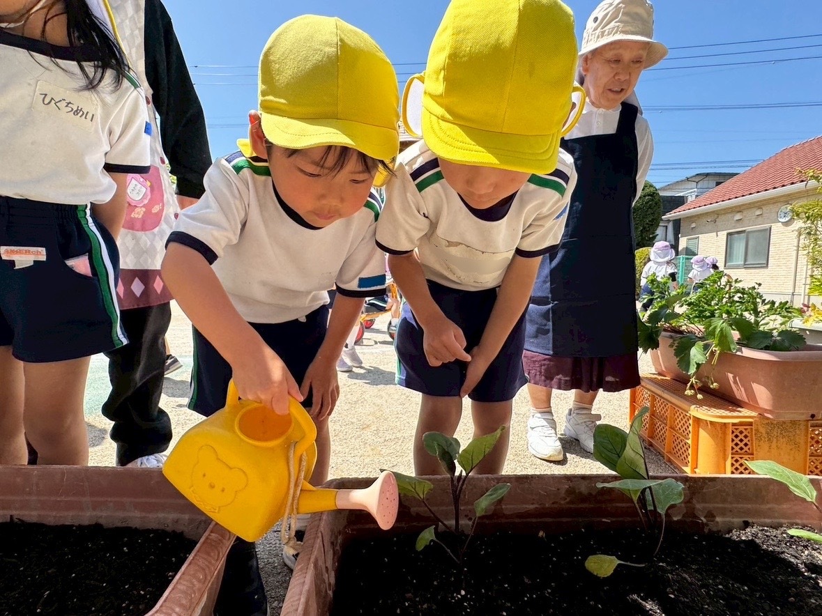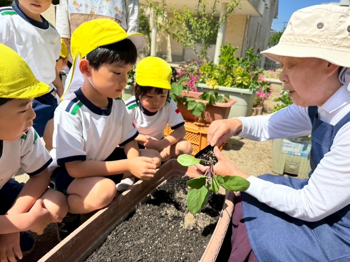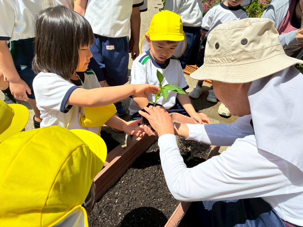 Aグループ(5歳児)野菜の苗を植えました☀︎ 2025年05月22日(木) シスターと一緒にナスとピーマンの苗を植えました♪ 鉢に苗を優しく植えたり、「大きくなーれ!」「美味しくなーれ!」と思いを込めて水やりをしました✴︎ みんなで大切に育てましょうね♬ 美味しいナスとピーマンができますように♡