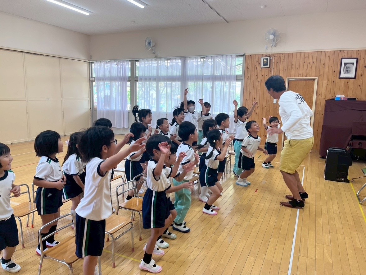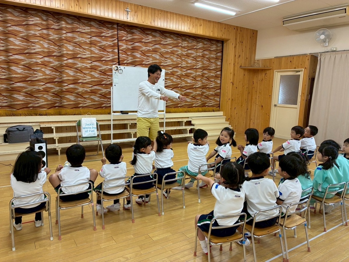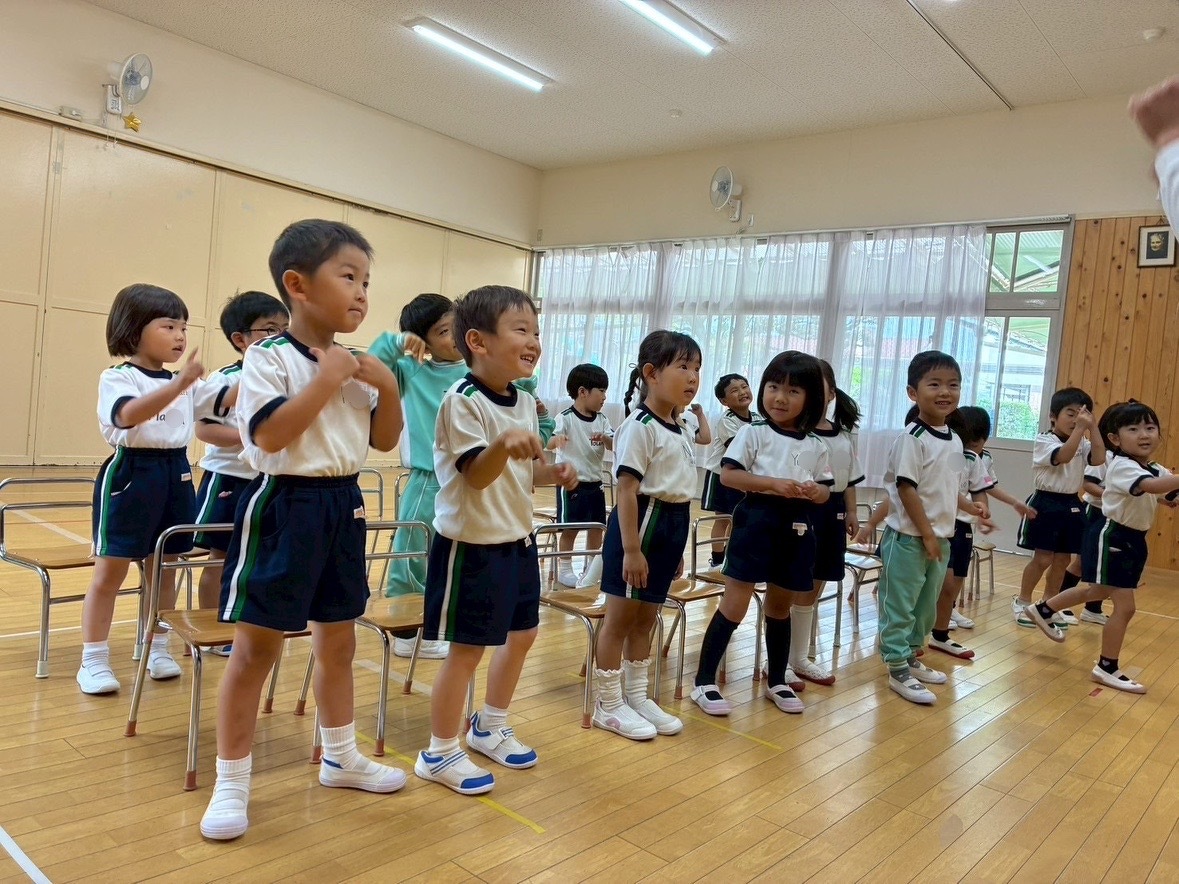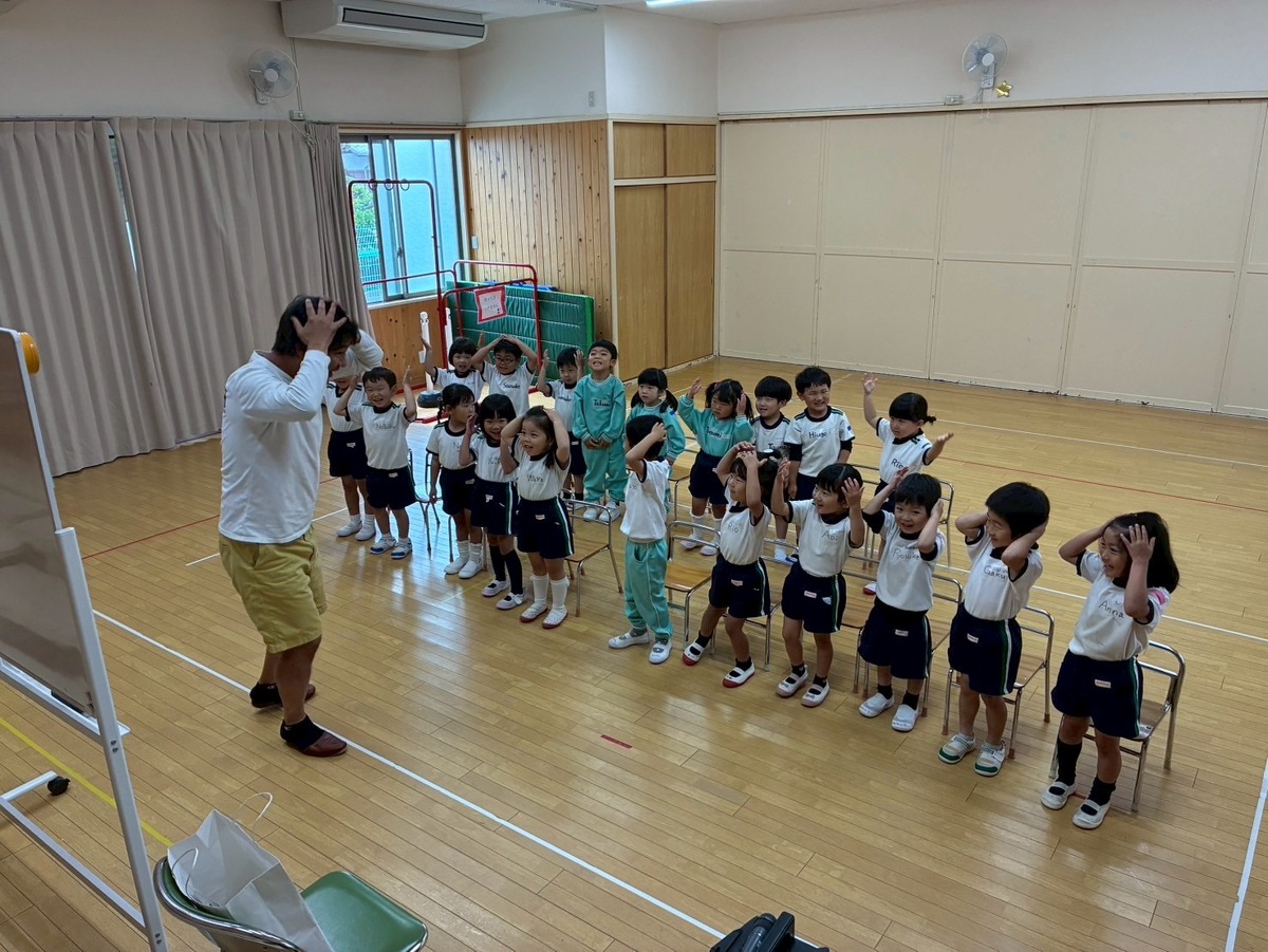 Aグループ(5歳児)・Bグループ(4歳児)の英語教室が始まりました! 2025年05月23日(金) Aグループ(5歳児)・Bグループ(4歳児)の英語教室がありました♪ 「RINGO」の歌をみんなで歌ったり、英語で名前を言ったり、英語でじゃんけんをしたり! 踊ったり、跳んだり、身体全体を使って英語を楽しむことができました✴︎ ジャック先生、1年間よろしくお願い致します!