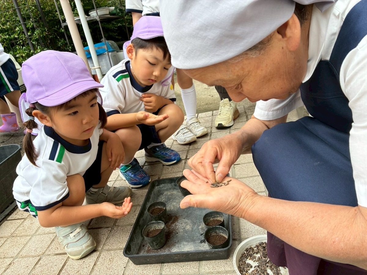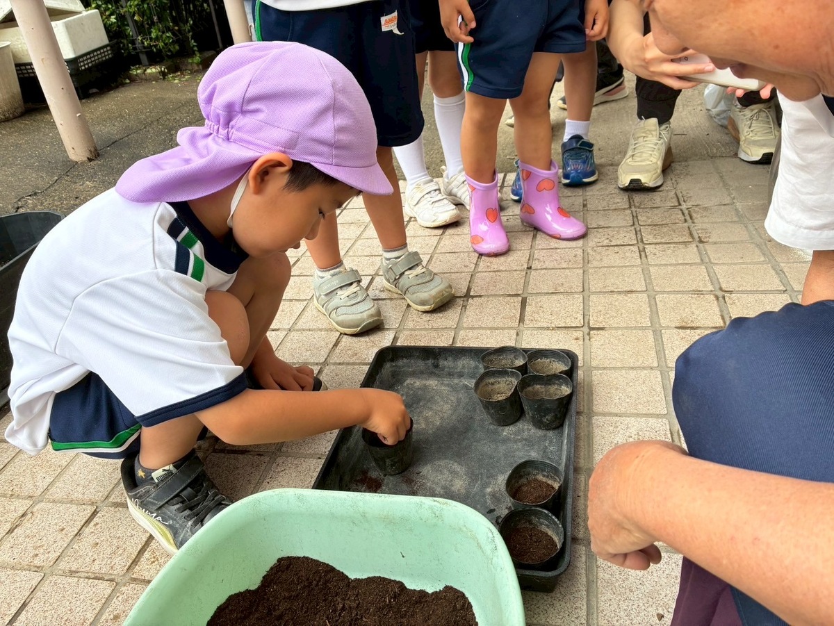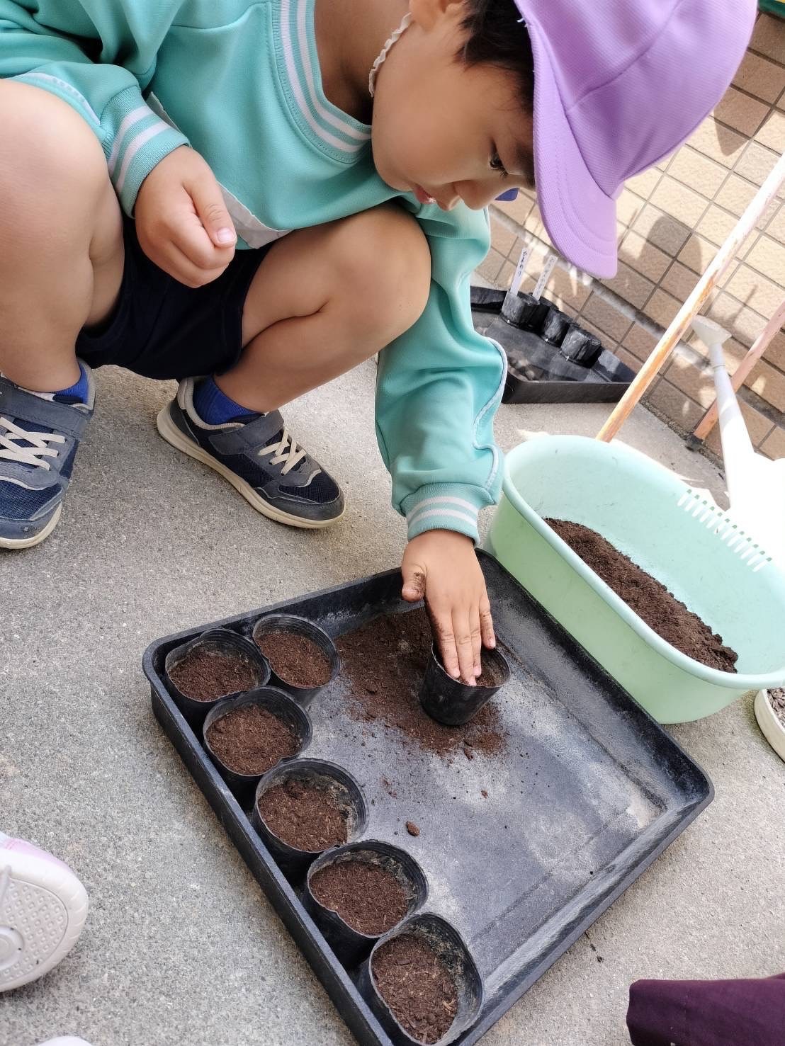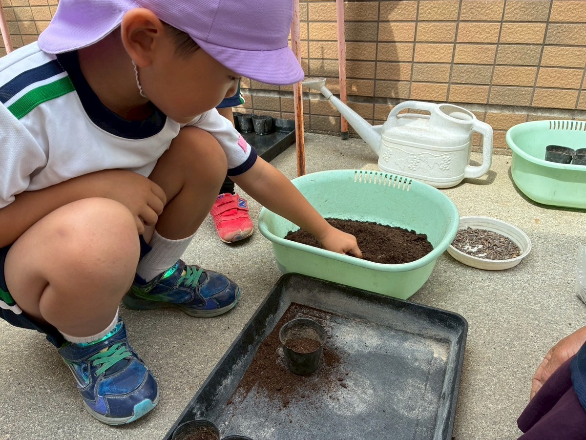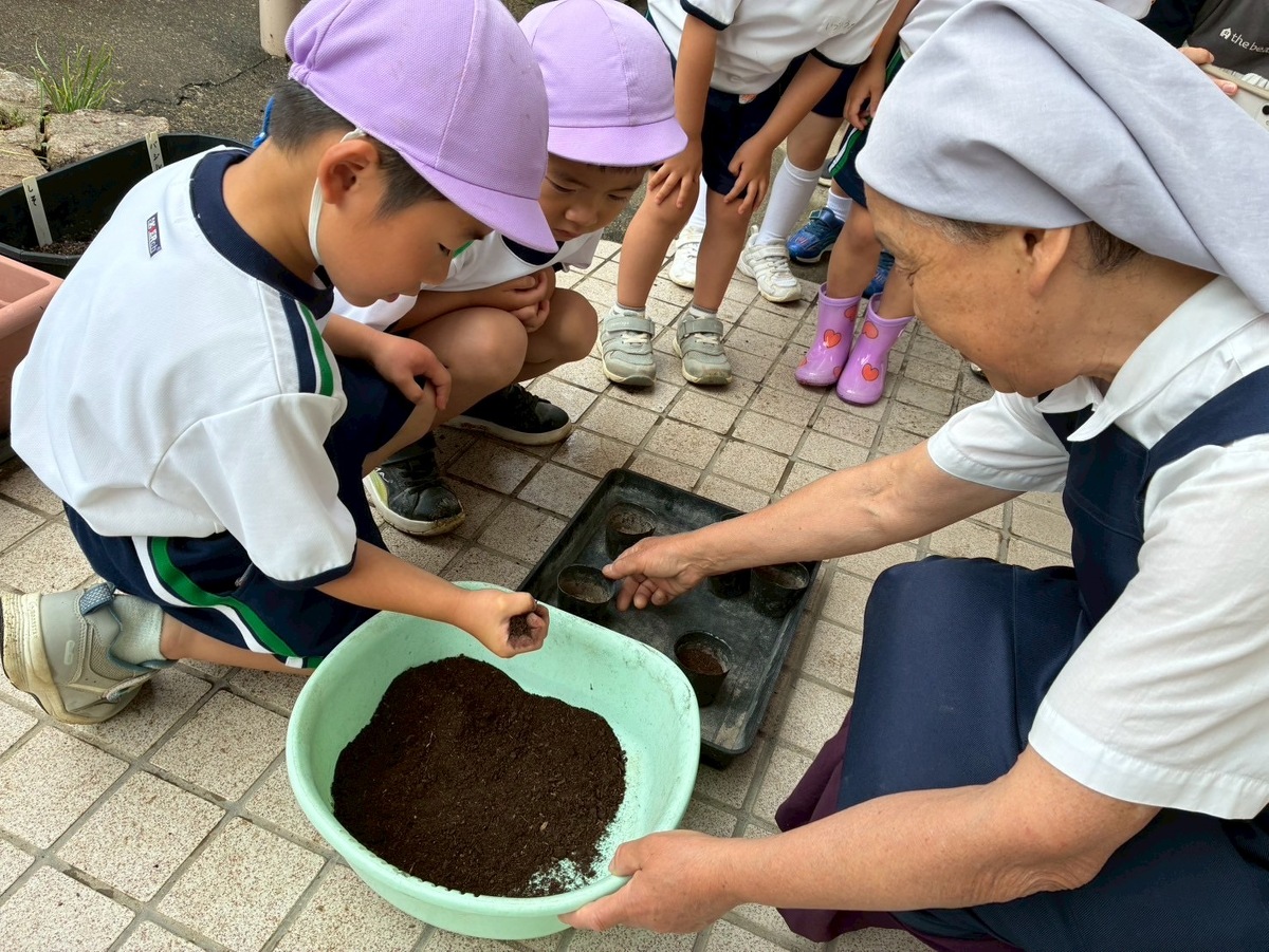 花の種植えを行いしました* 2025年06月03日(火) 花の種植えを行いました! シスターと一緒に「ひまわり」「あさがお」「フウセンカズラ」のお花の種をひとつずつ優しく、丁寧に植えました♪ 花の成長と共に、子どもたちの心と身体もすこやかに育ちますように。