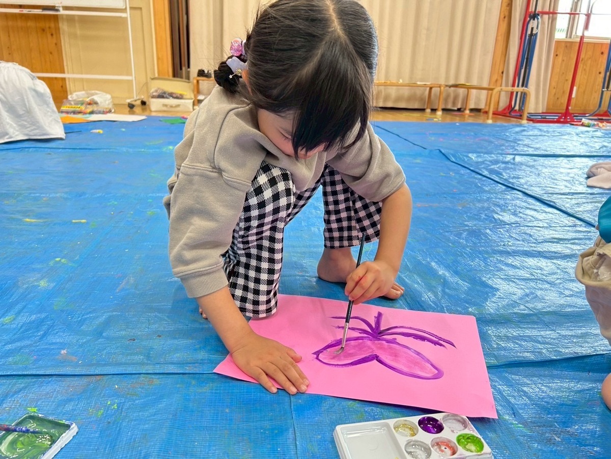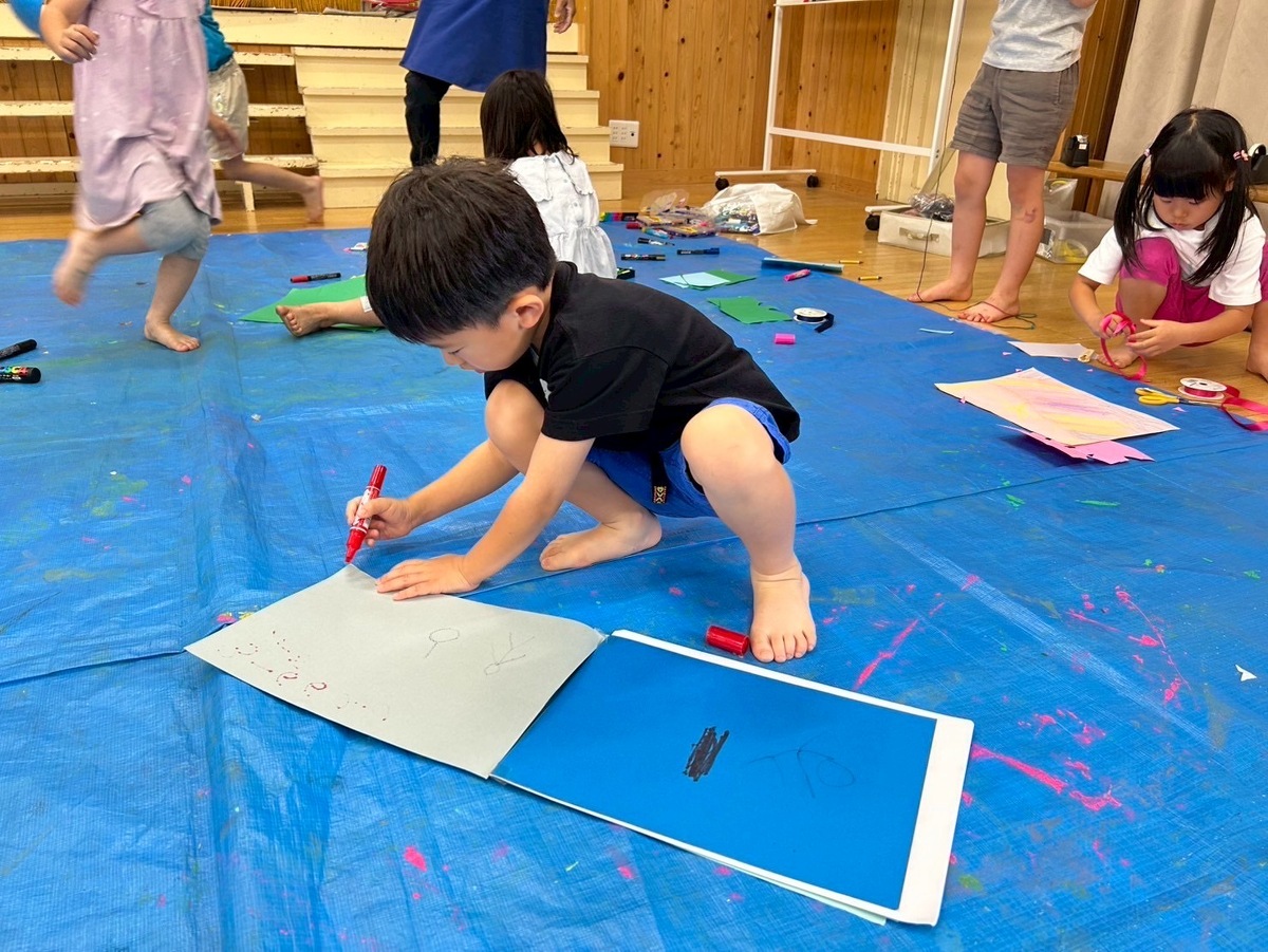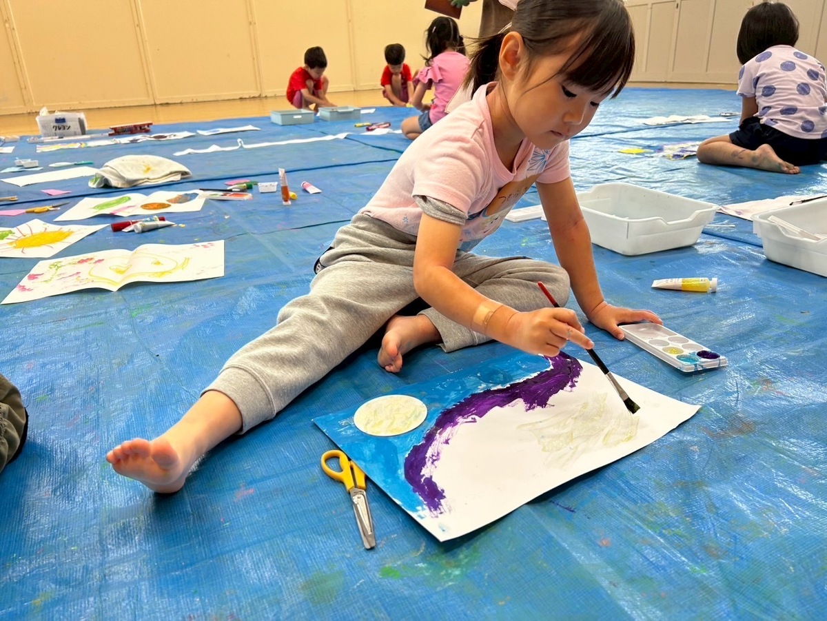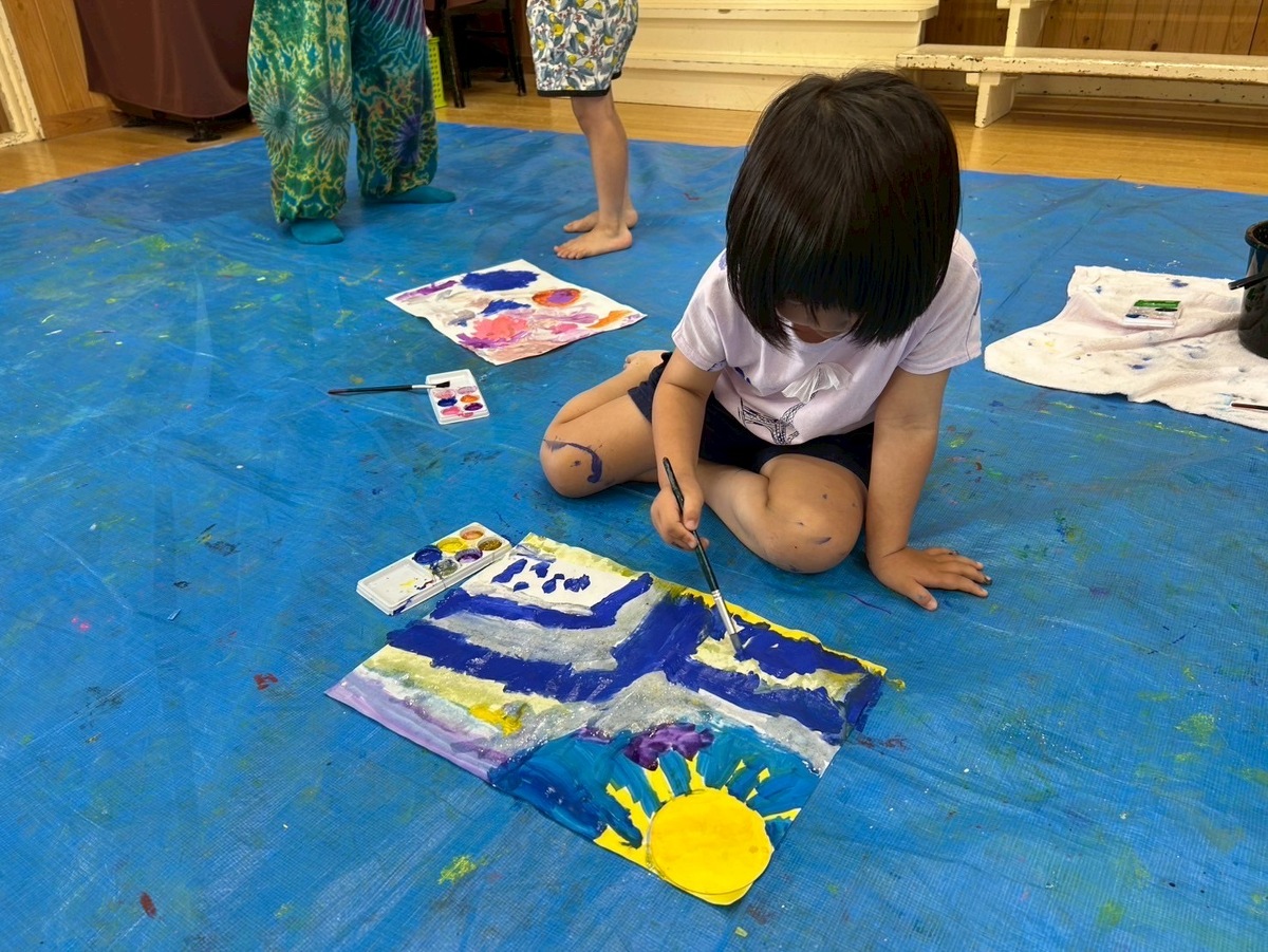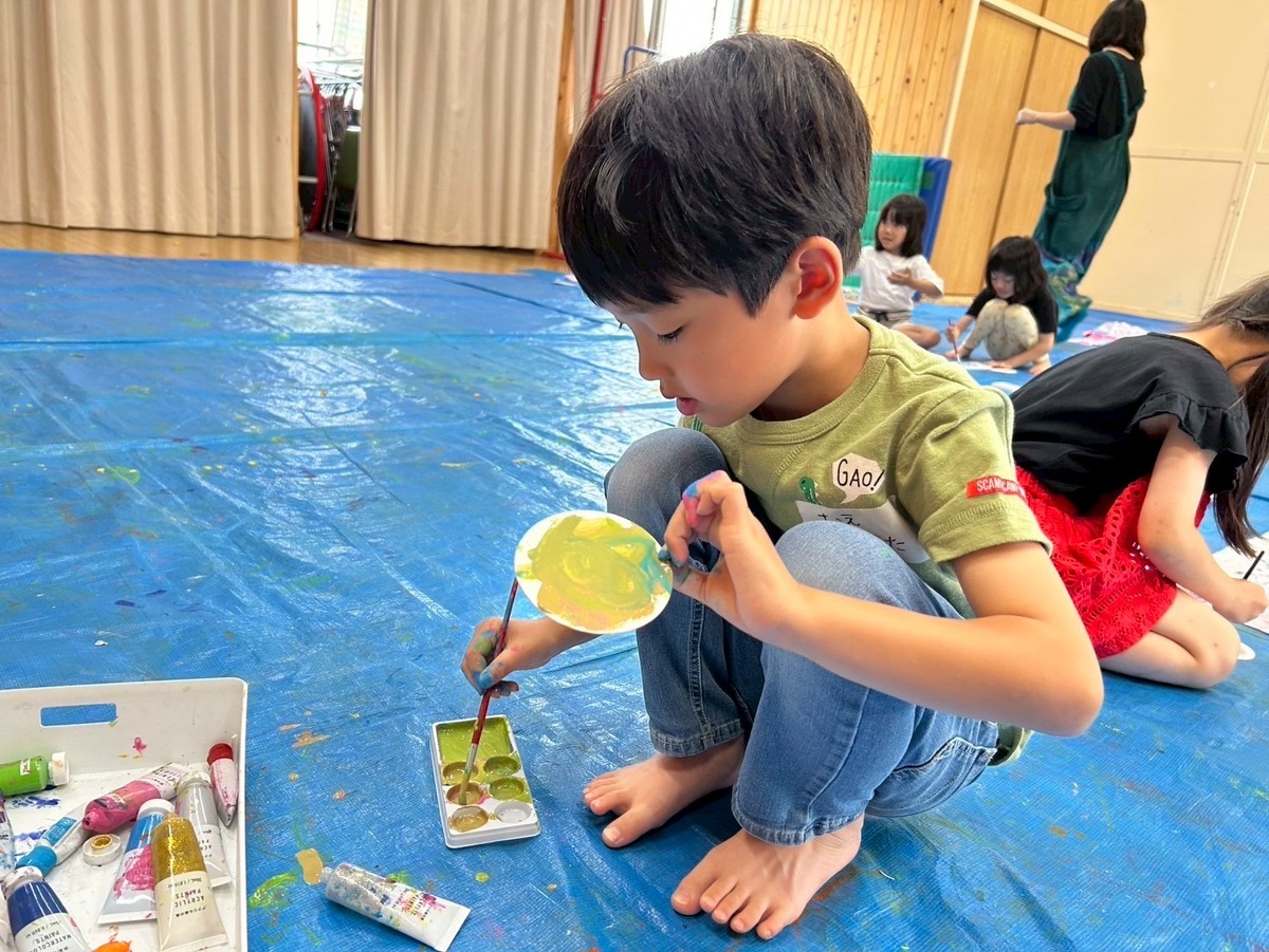 Aグループ(5歳児)アートの日がありました☆ 2025年06月06日(金) Aグループ(5歳児)のアートがありました! 今回は、「濃淡」をテーマに、絵の具を使って色の混ざり方を楽しみました♪ できた色を使って絵を描いたり、形を作ったりしました‼︎ 色の不思議や、新しい発見を身体いっぱい楽しむことができました。 みきゆき先生ありがとうございました‼︎