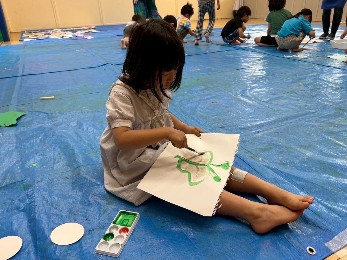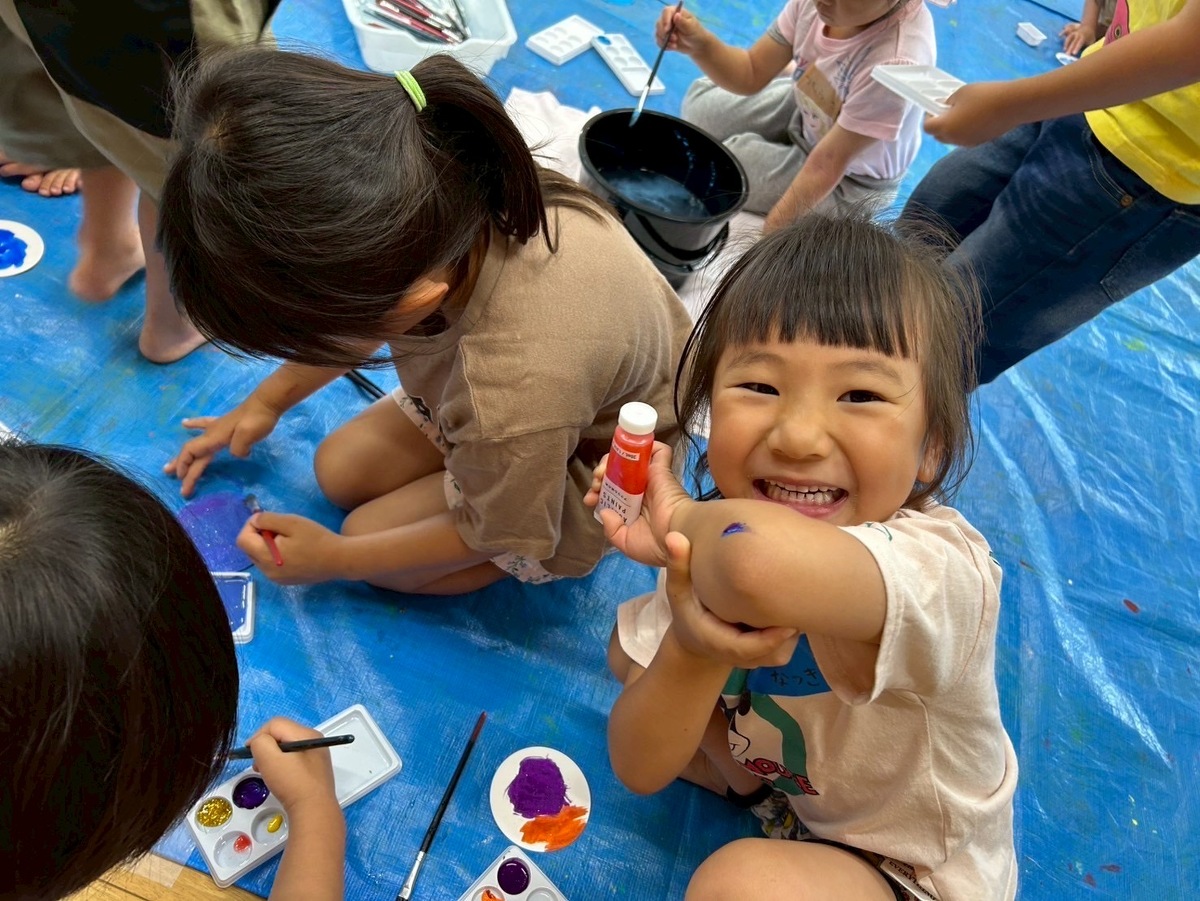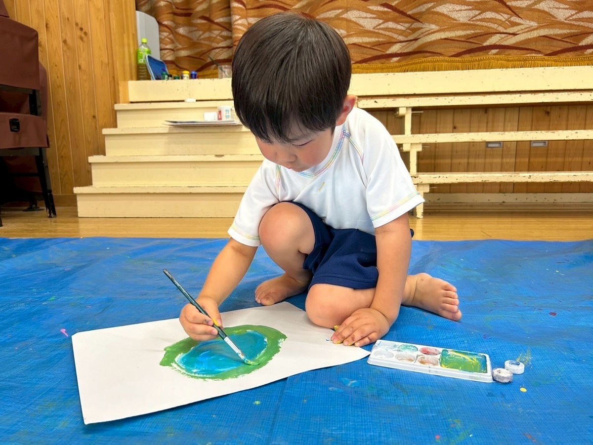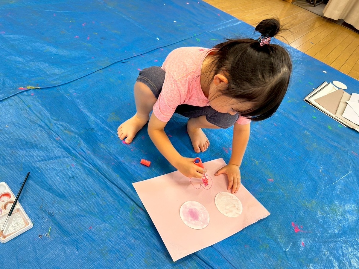 Aグループ(5歳児)アートの日がありました☆ 2025年06月06日(金) Aグループ(5歳児)のアートがありました! 今回は、「濃淡」をテーマに、絵の具を使って色の混ざり方を楽しみました♪ できた色を使って絵を描いたり、形を作ったりしました‼︎ 色の不思議や、新しい発見を身体いっぱい楽しむことができました。 みきゆき先生ありがとうございました‼︎