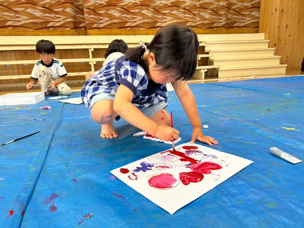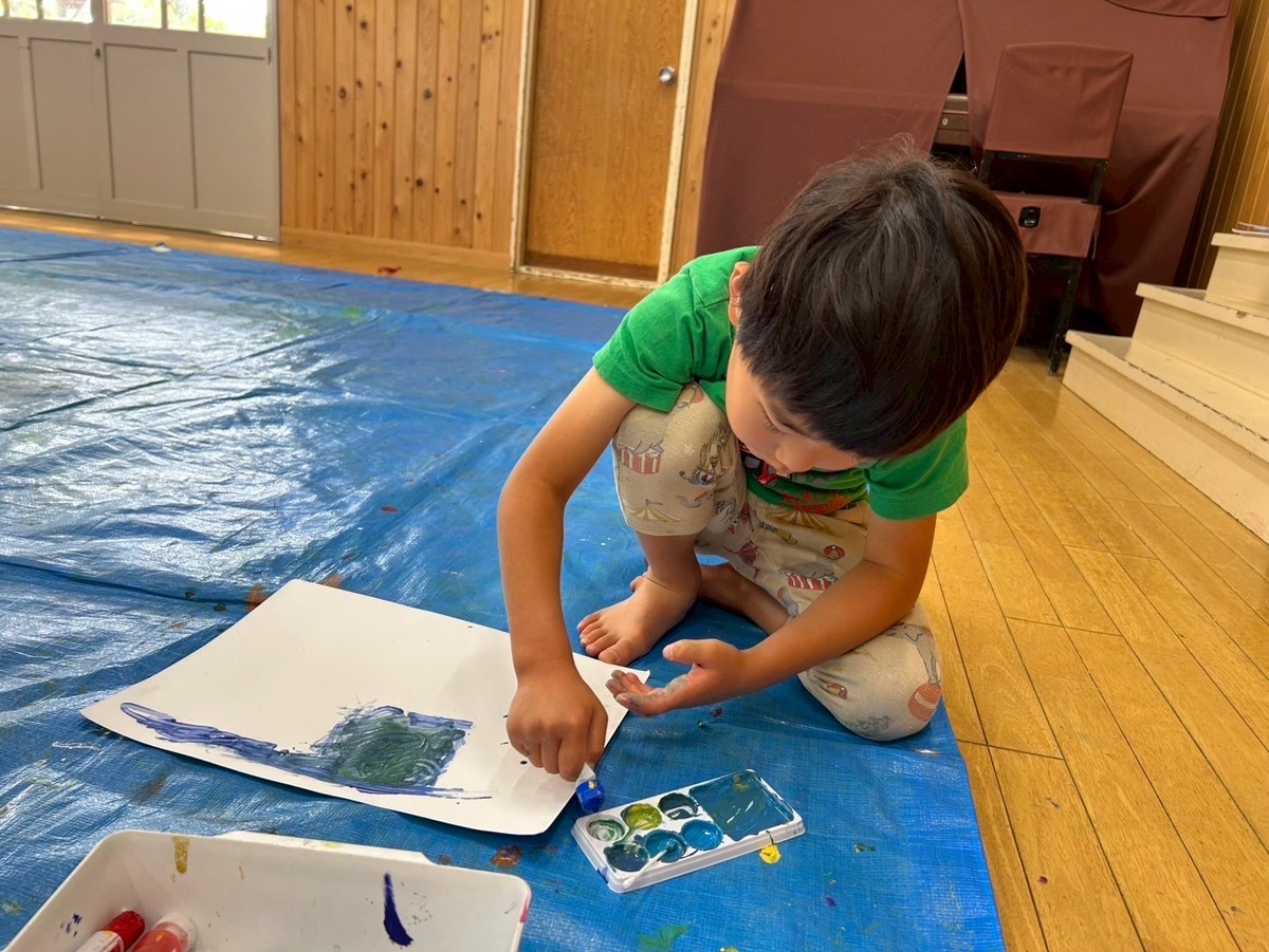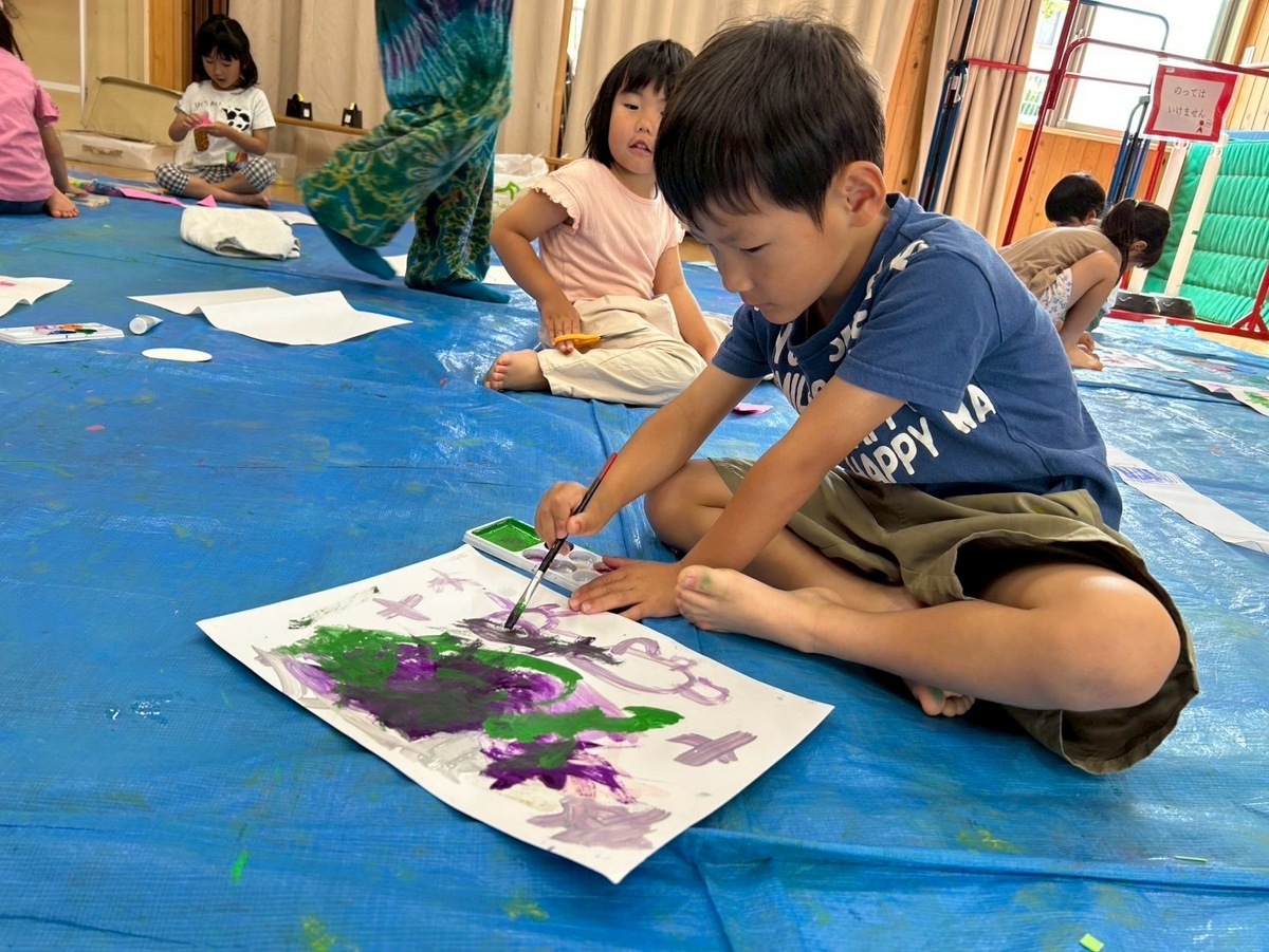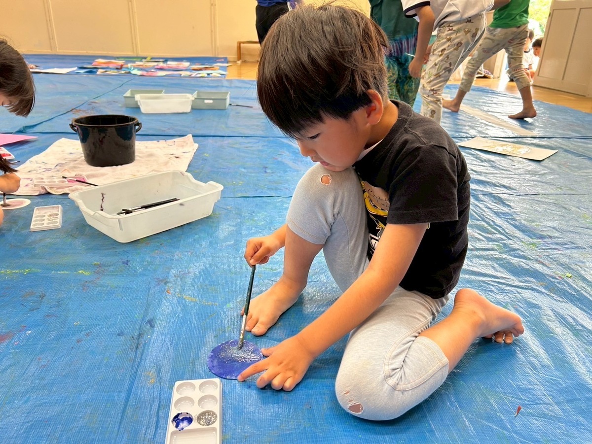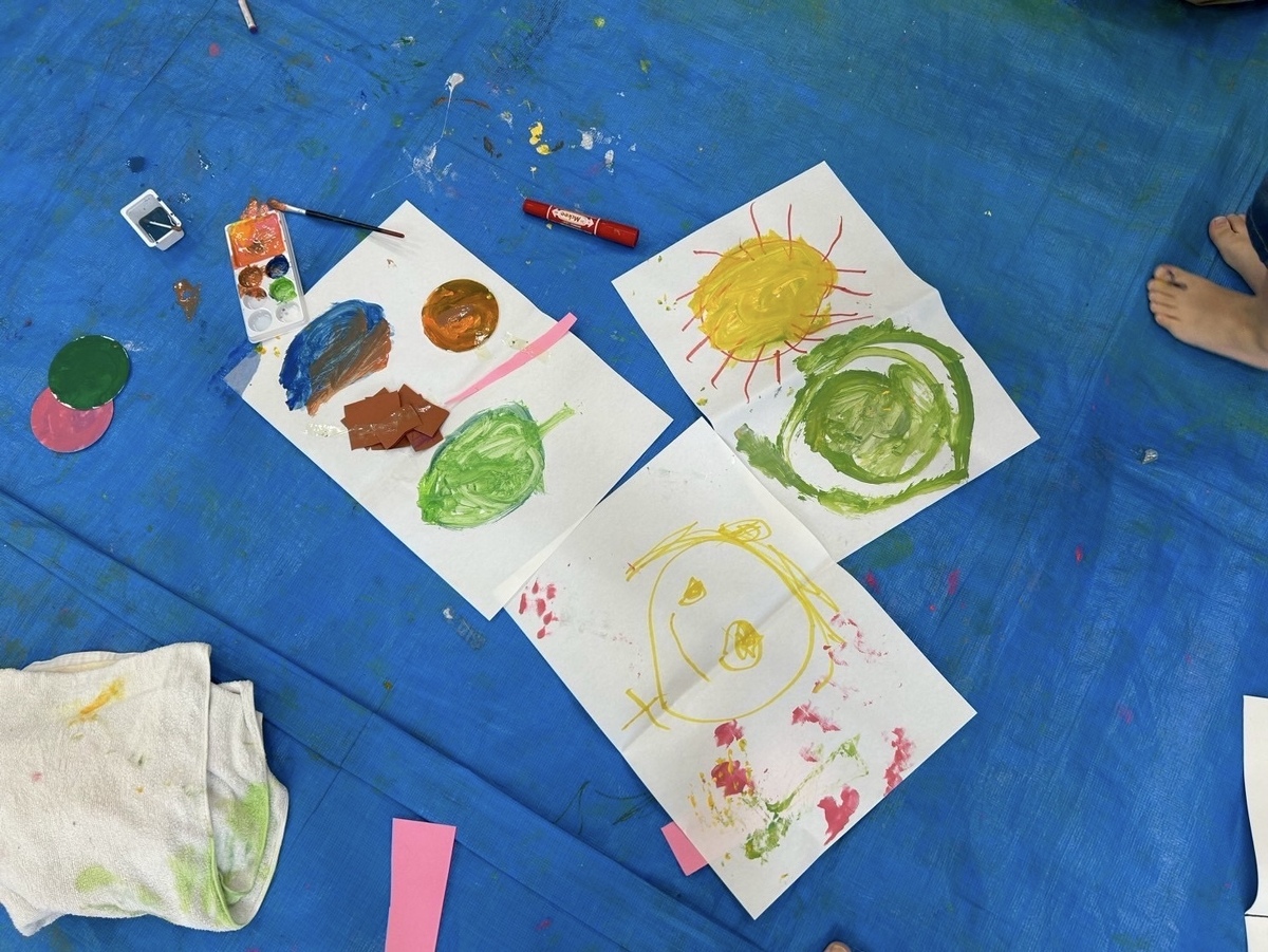 Aグループ(5歳児)アートの日がありました☆ 2025年06月06日(金) Aグループ(5歳児)のアートがありました! 今回は、「濃淡」をテーマに、絵の具を使って色の混ざり方を楽しみました♪ できた色を使って絵を描いたり、形を作ったりしました‼︎ 色の不思議や、新しい発見を身体いっぱい楽しむことができました。 みきゆき先生ありがとうございました‼︎