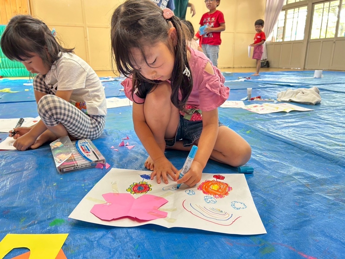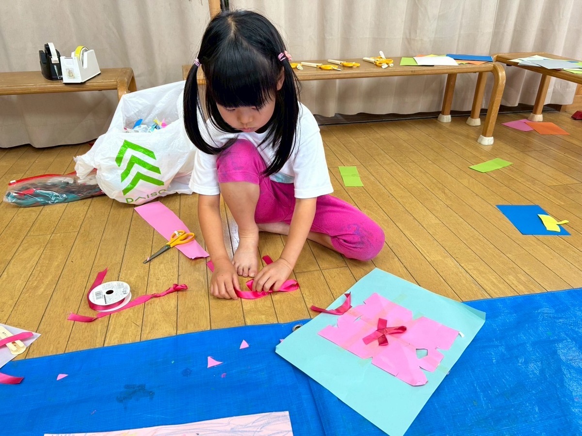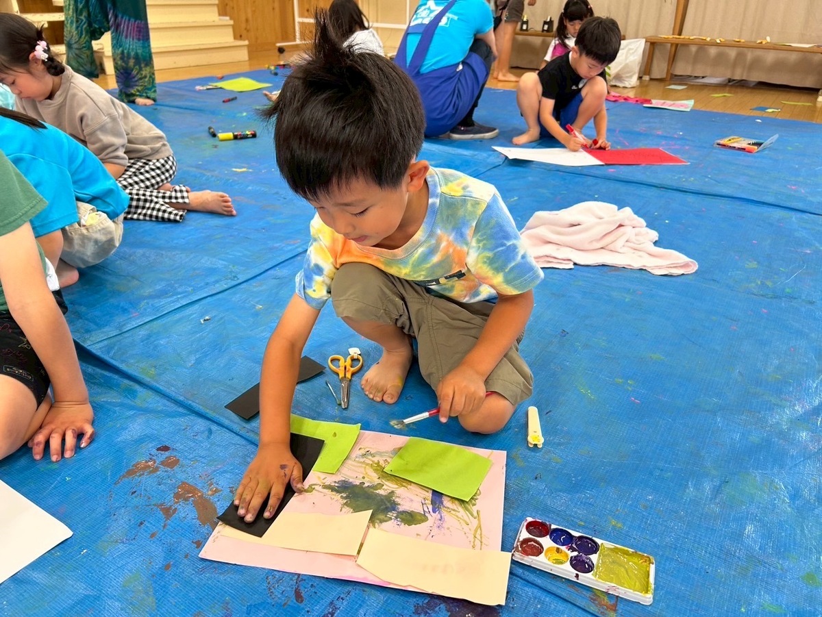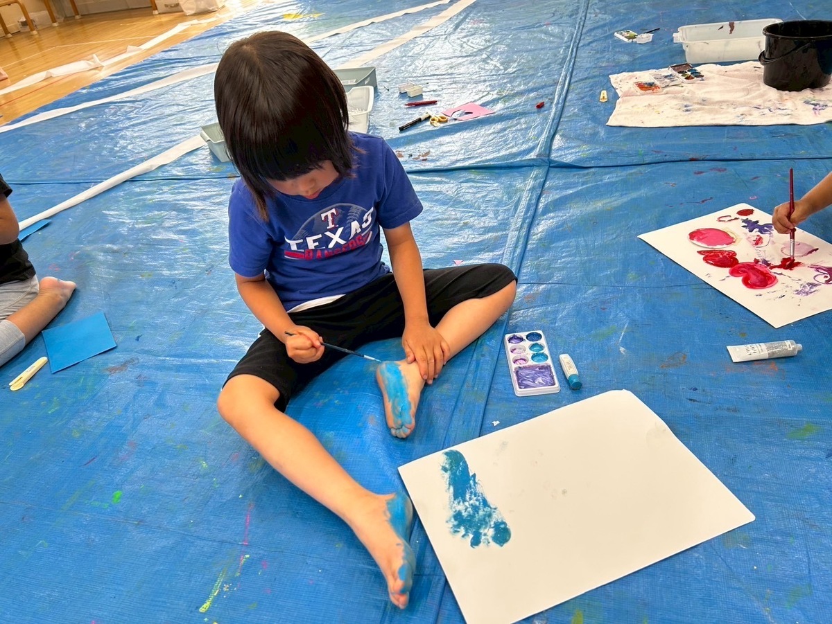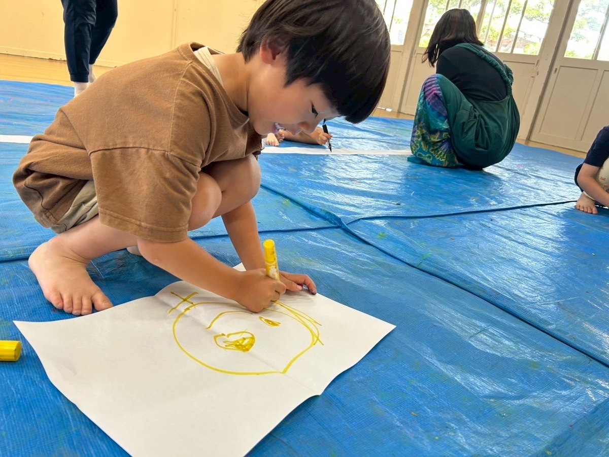 Aグループ(5歳児)アートの日がありました☆ 2025年06月06日(金) Aグループ(5歳児)のアートがありました! 今回は、「濃淡」をテーマに、絵の具を使って色の混ざり方を楽しみました♪ できた色を使って絵を描いたり、形を作ったりしました‼︎ 色の不思議や、新しい発見を身体いっぱい楽しむことができました。 みきゆき先生ありがとうございました‼︎