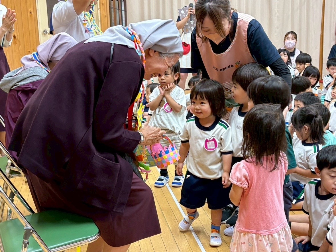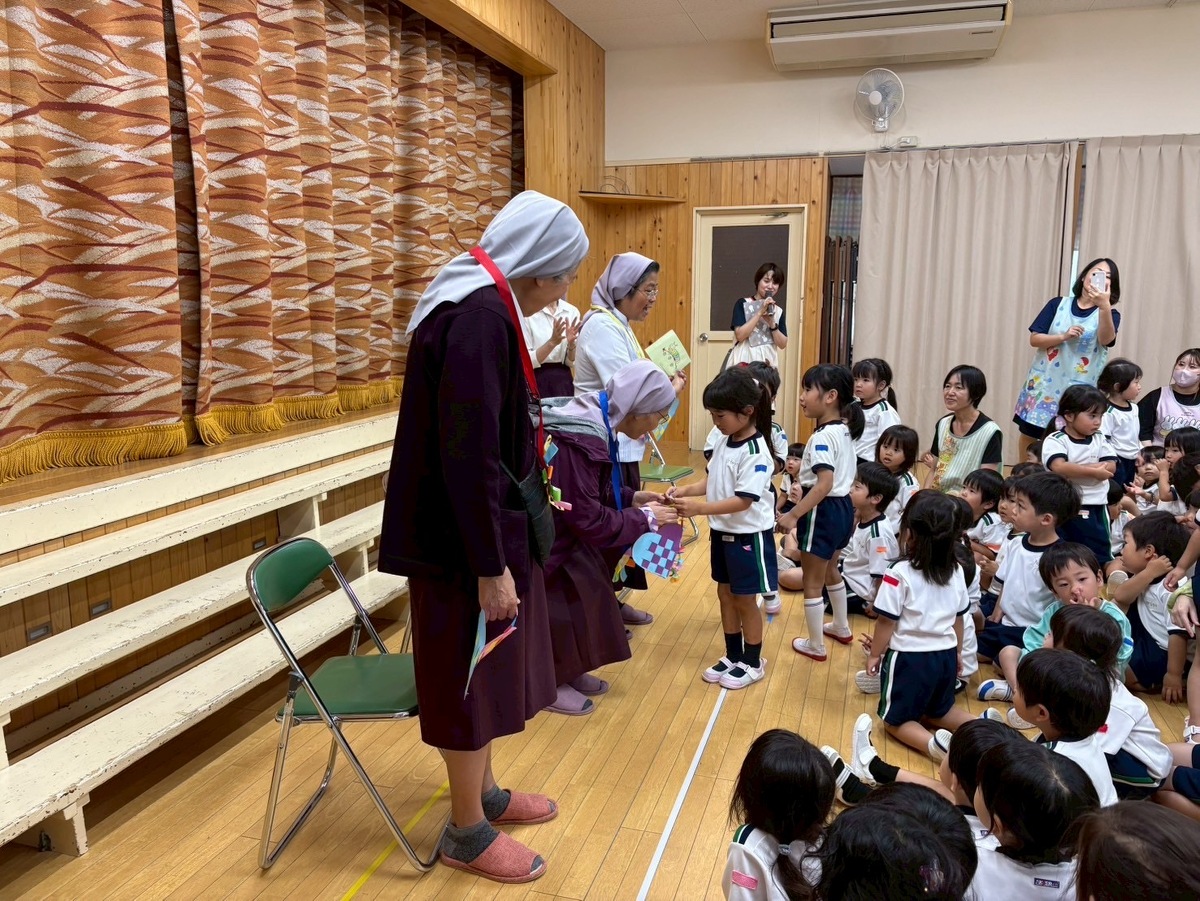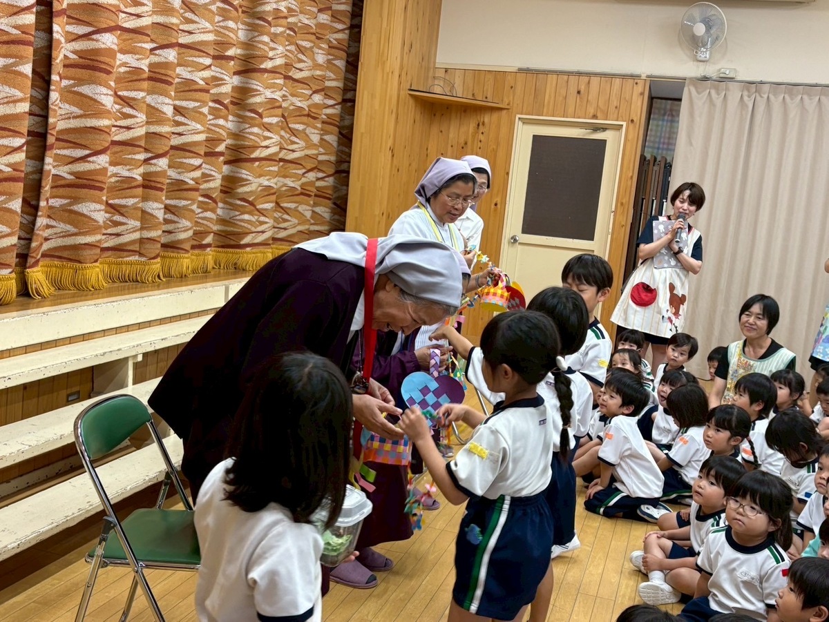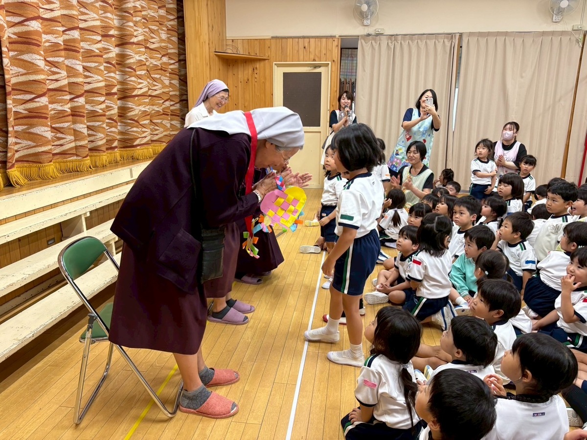 シスター歓迎セレモニーがありました‼︎ 2025年06月25日(水) フィリピンから来てくださったシスターの歓迎セレモニーを行いました。 シスターのお話を聞いたり、「好きな色は?」「好きな食べ物は?」など、子どもたちからの質問したりしました!シスターもにこやかに答えてくださりました! その後は、心を込めた歌のプレゼントと、子どもたちが手作りしたプレゼントを渡しました。シスターたちもとても喜んでくださりました‼︎ また、いつでもマリア幼稚園に来てください!