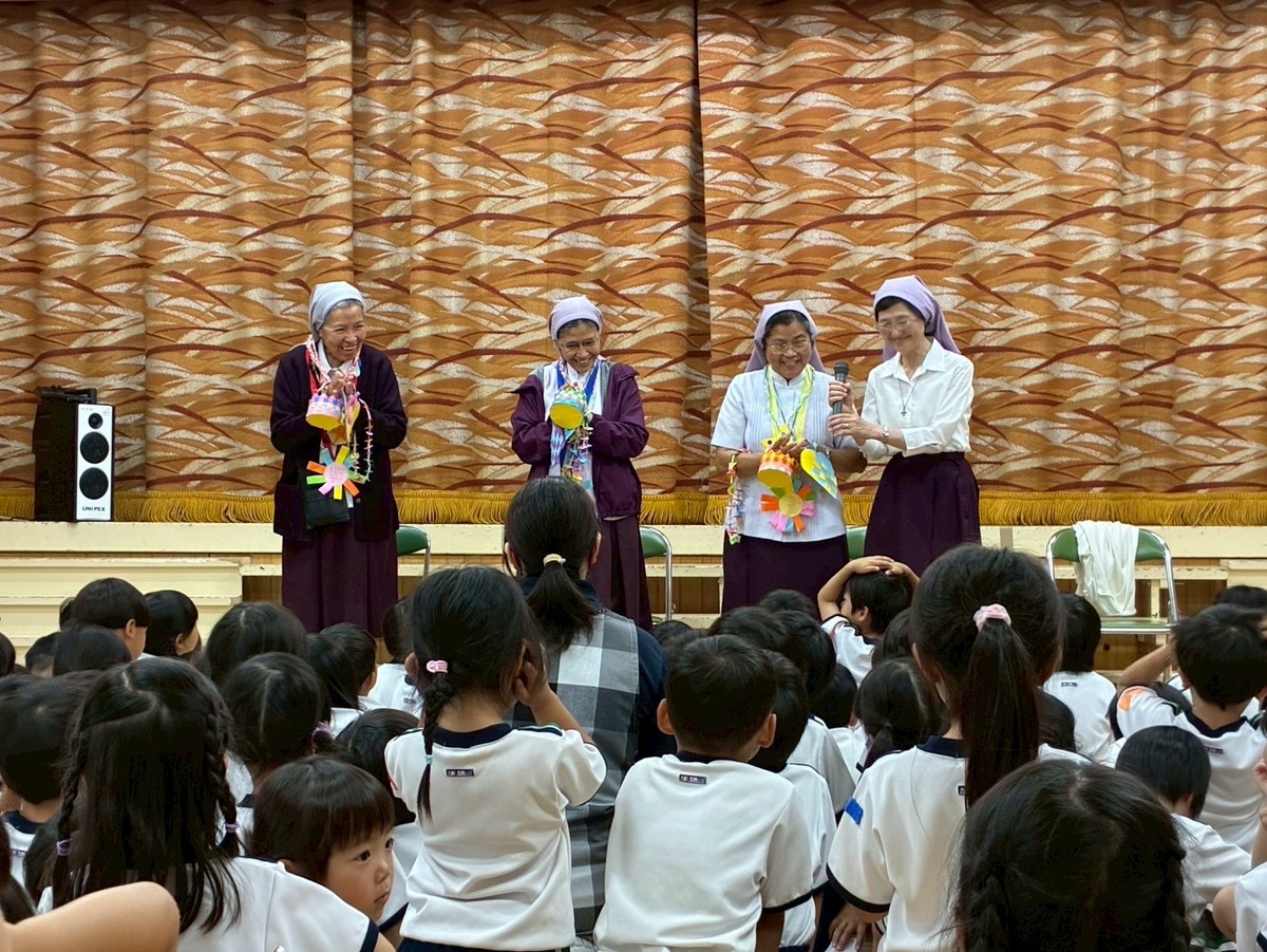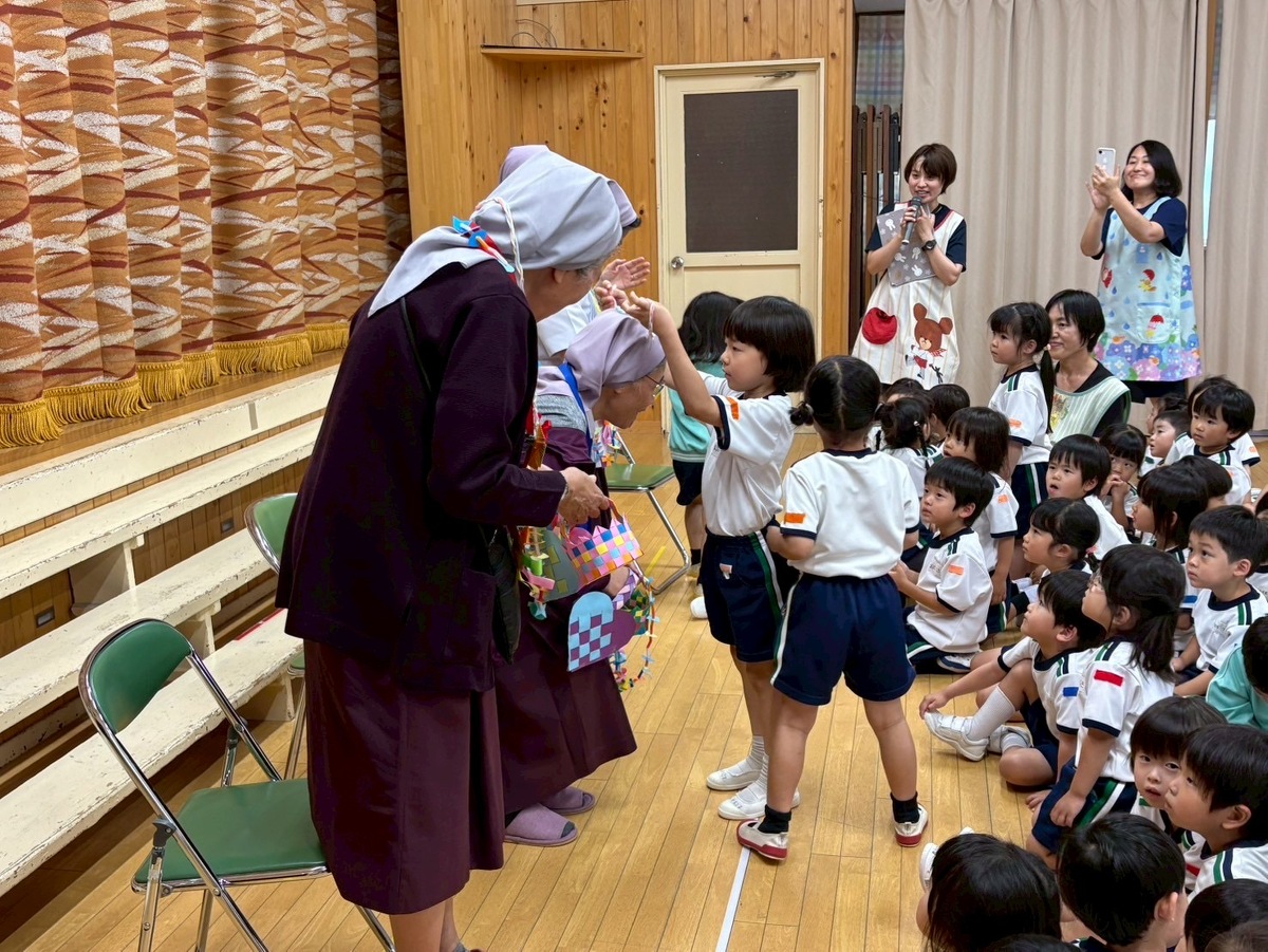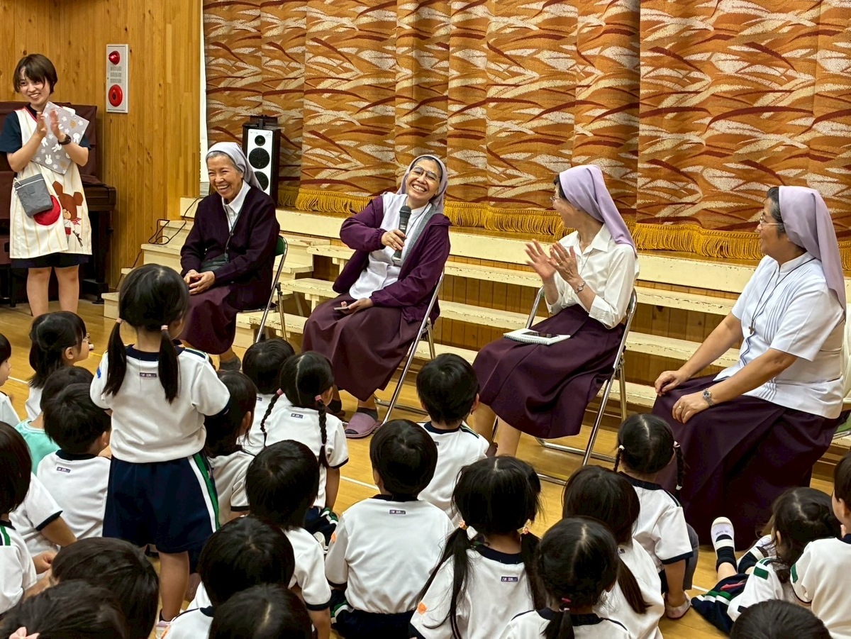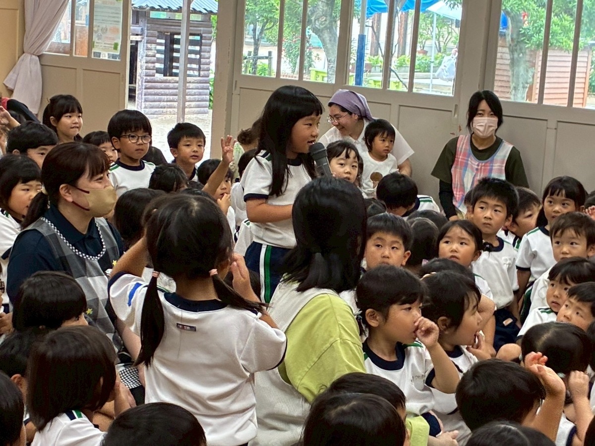 シスター歓迎セレモニーがありました‼︎ 2025年06月25日(水) フィリピンから来てくださったシスターの歓迎セレモニーを行いました。 シスターのお話を聞いたり、「好きな色は?」「好きな食べ物は?」など、子どもたちからの質問したりしました!シスターもにこやかに答えてくださりました! その後は、心を込めた歌のプレゼントと、子どもたちが手作りしたプレゼントを渡しました。シスターたちもとても喜んでくださりました‼︎ また、いつでもマリア幼稚園に来てください!