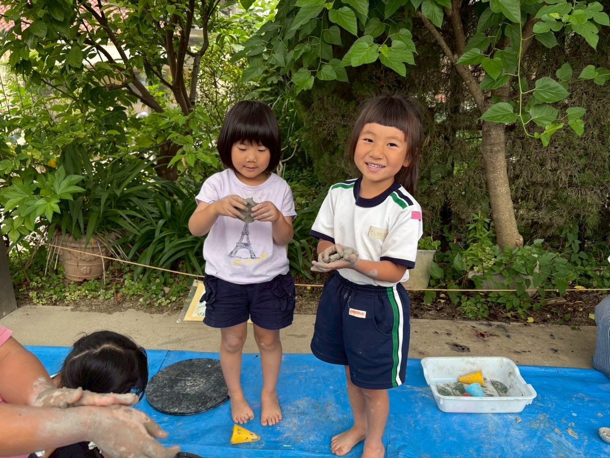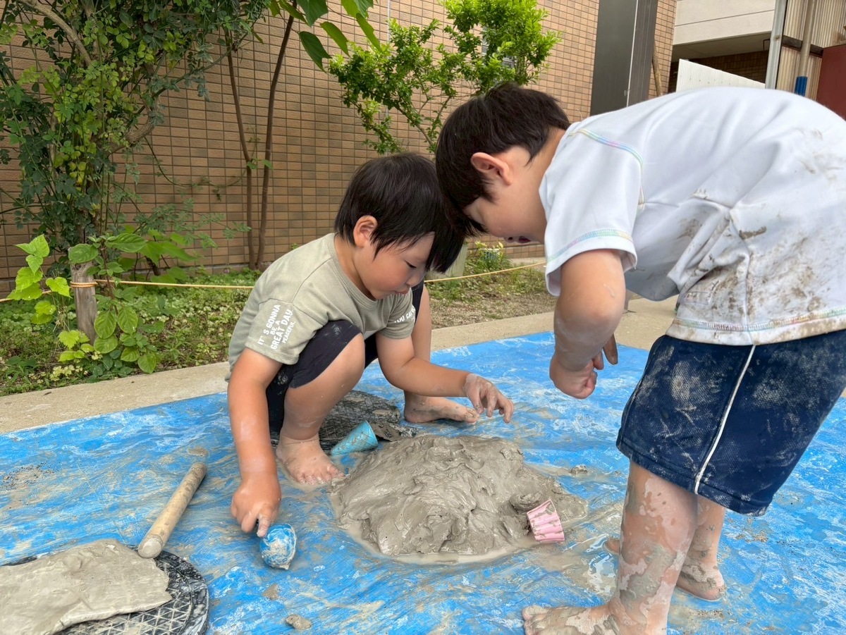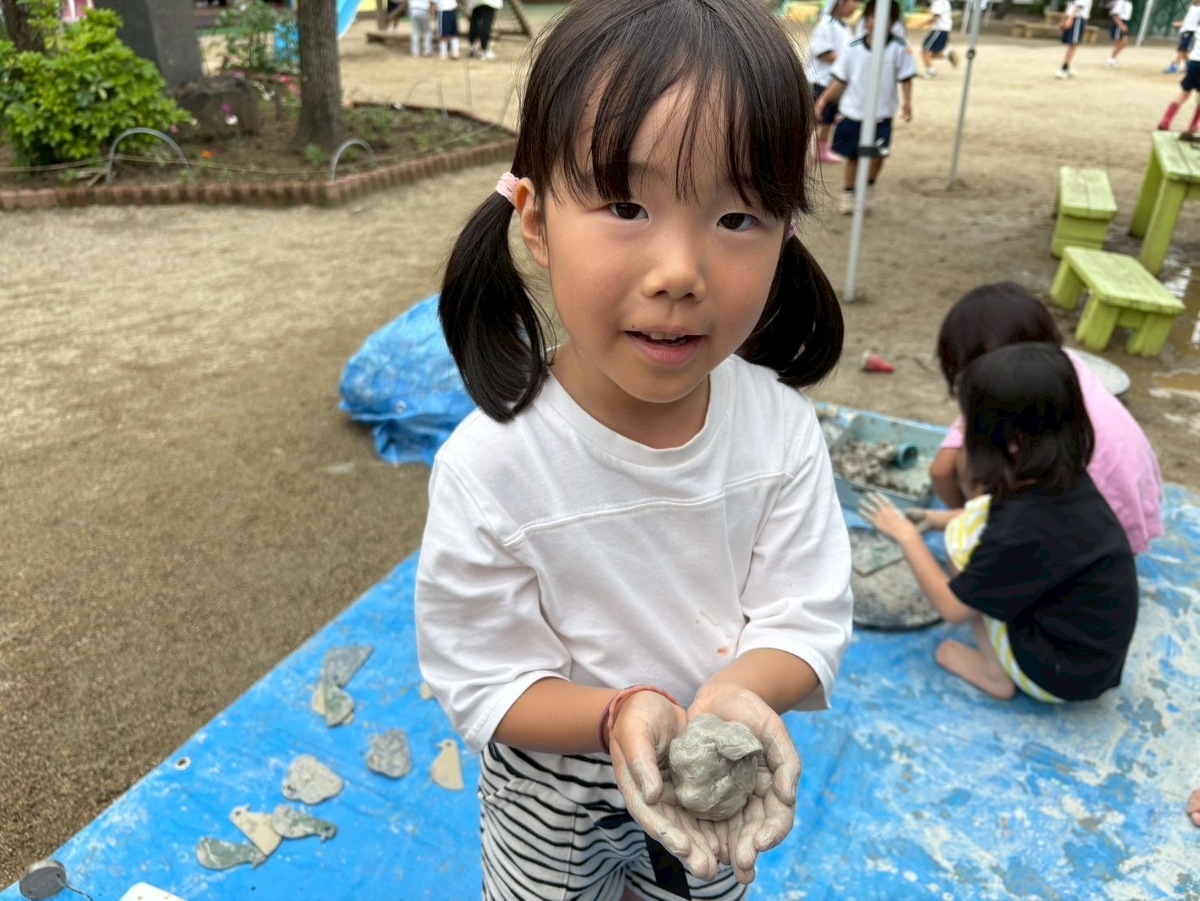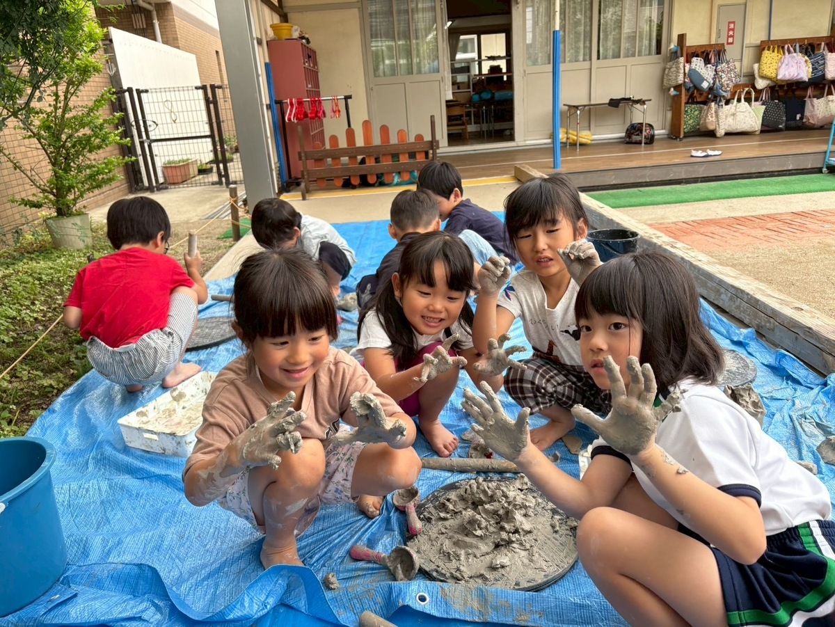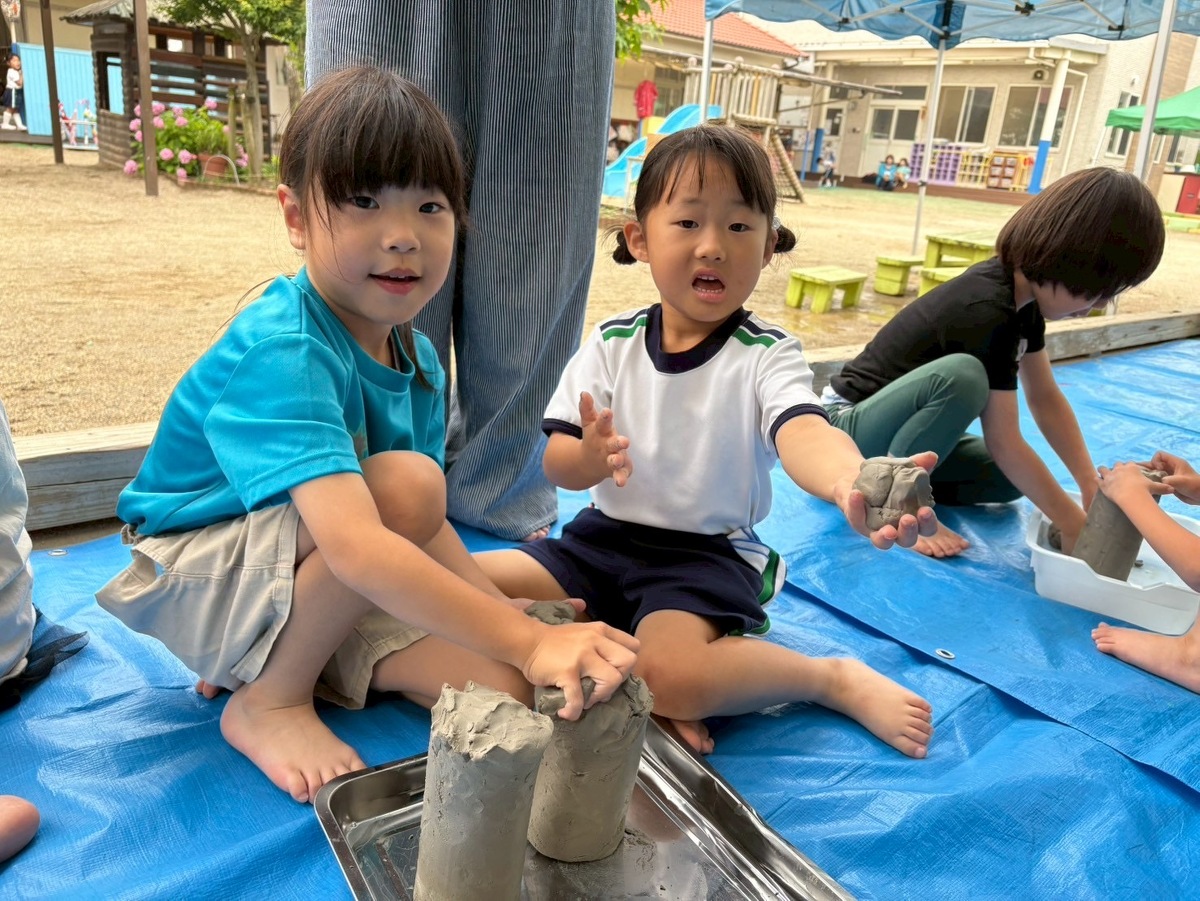 Aグループ(5歳児)のアートがありました! 2025年06月25日(水) Aグループ(5歳児)のアートで土粘土をしました‼︎ 初めは少し硬く、上手く形を変えるのに一苦労でしたが、水を足したり道具を使ったりすることで、みるみるうちに思い思いの形へと変わっていきました♪ 「お椀ができたよ!」と、器づくりに夢中になる子もいれば、粘土の感触を全身で楽しむ子もいました!手足はもちろん、顔や頭にまで粘土がつくほど夢中になって遊ぶ姿が見られました⭐︎ みきゆき先生、楽しい時間をありがとうございました☺︎‼︎