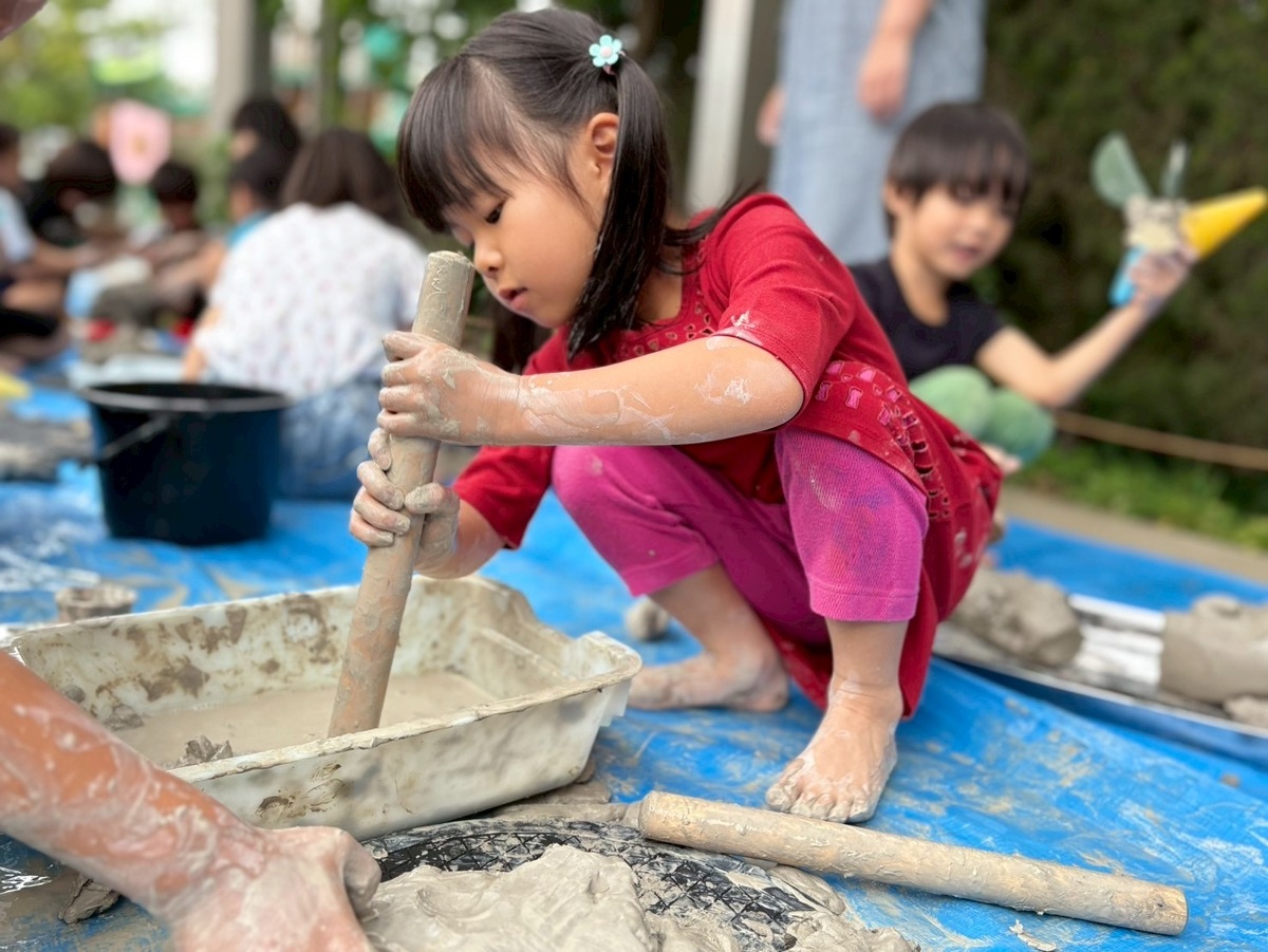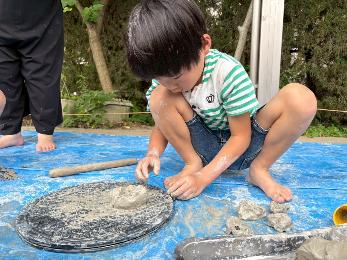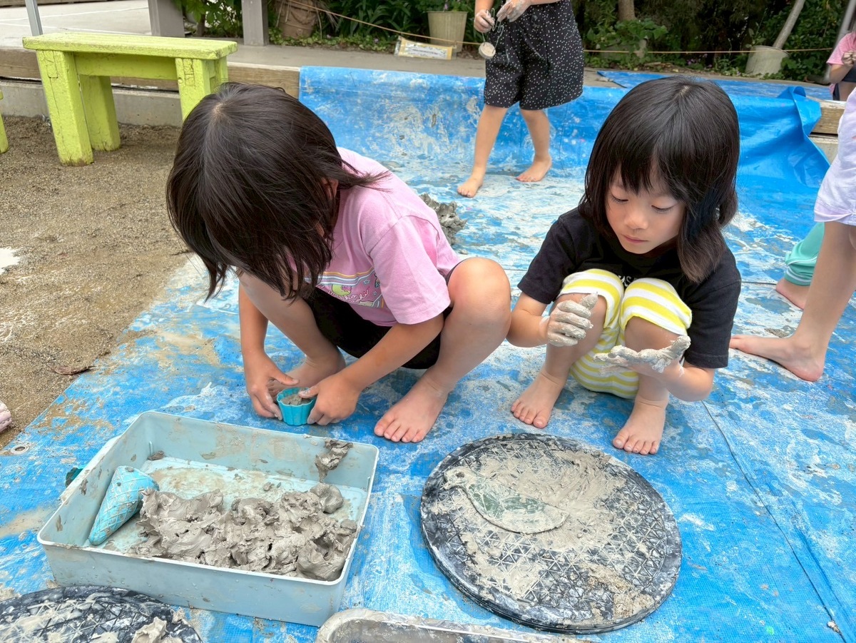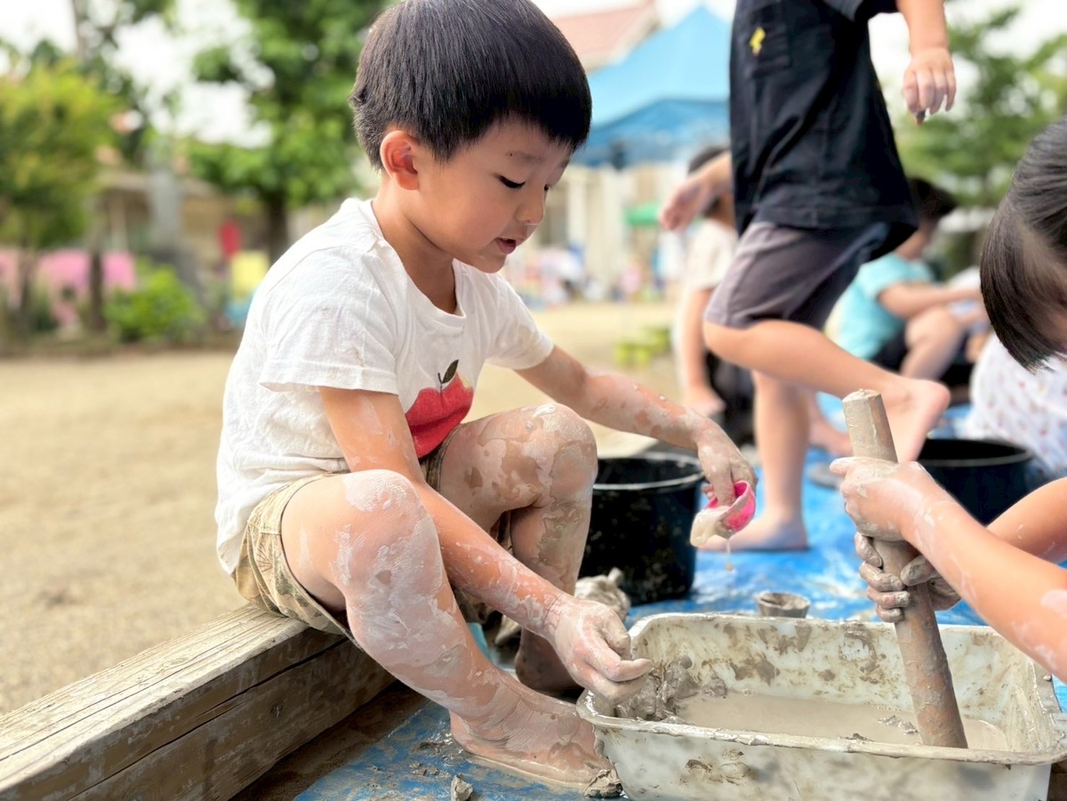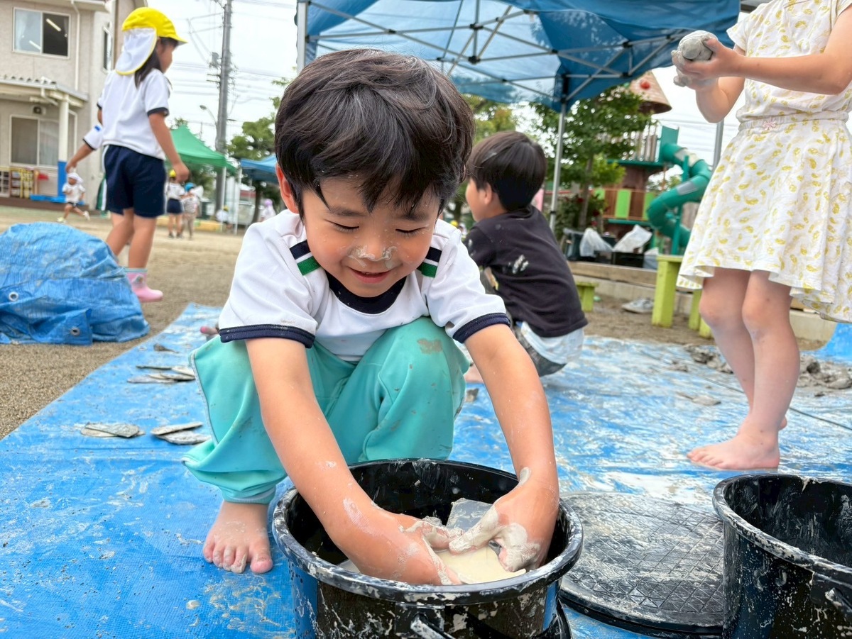 Aグループ(5歳児)のアートがありました! 2025年06月25日(水) Aグループ(5歳児)のアートで土粘土をしました‼︎ 初めは少し硬く、上手く形を変えるのに一苦労でしたが、水を足したり道具を使ったりすることで、みるみるうちに思い思いの形へと変わっていきました♪ 「お椀ができたよ!」と、器づくりに夢中になる子もいれば、粘土の感触を全身で楽しむ子もいました!手足はもちろん、顔や頭にまで粘土がつくほど夢中になって遊ぶ姿が見られました⭐︎ みきゆき先生、楽しい時間をありがとうございました☺︎‼︎