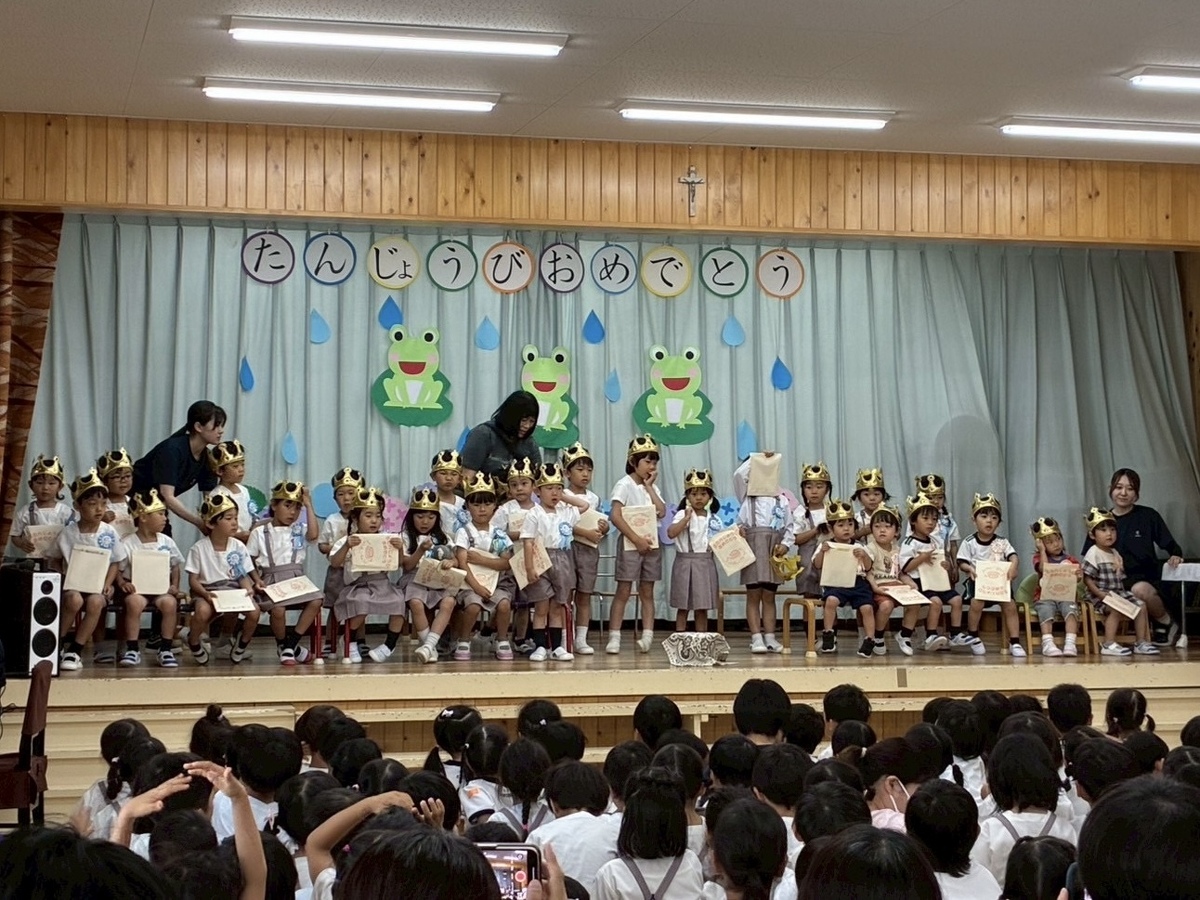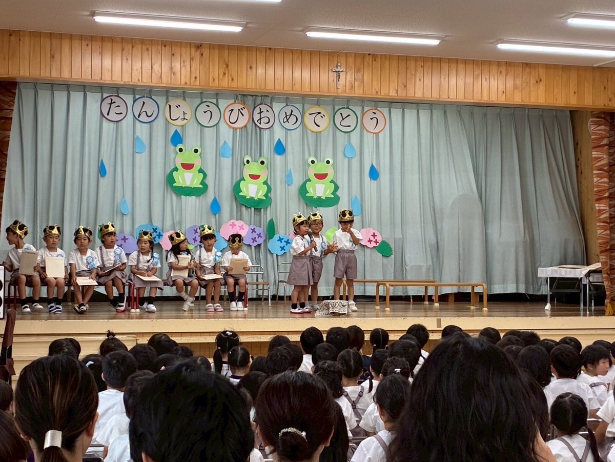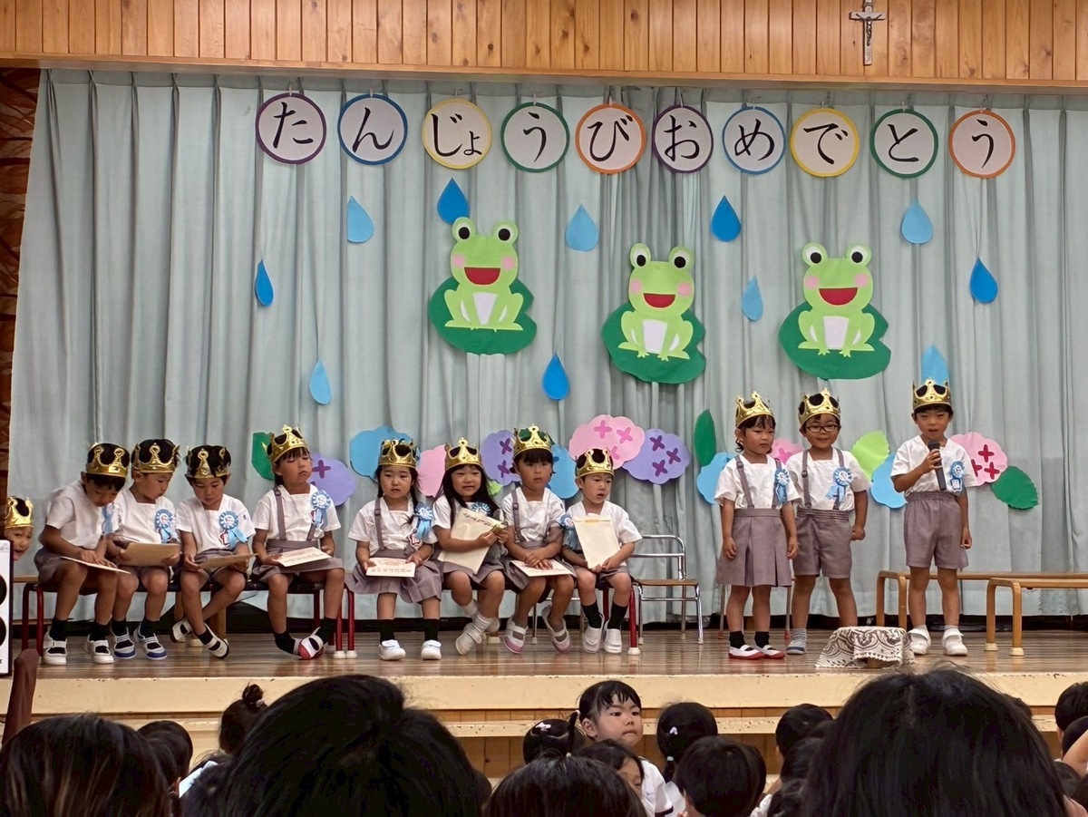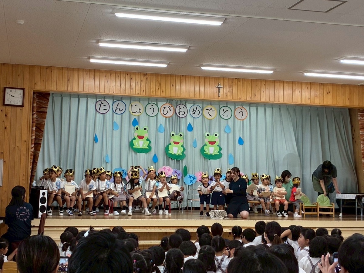 6月の誕生会がありました! 2025年07月04日(金) 6月生まれの誕生会がありました⭐︎ ドキドキしながらもマイクを持って一生懸命発表できました‼︎ 6月生まれのお友だちたくさんいましたね♫ 今月のお楽しみは、先生達による『もったいないばあさん』の劇でした✴︎ 水の出しっ放し、石鹸の使いすぎ、ペーパータオルの使いすぎ、もったいないことしてませんか!? 「ありがとう」の言葉を使ってあったかい気持ち♡になれていますか!? もったいないばあさんが怒らないように!もったいないをみんなで、なくしていきましょうね♪