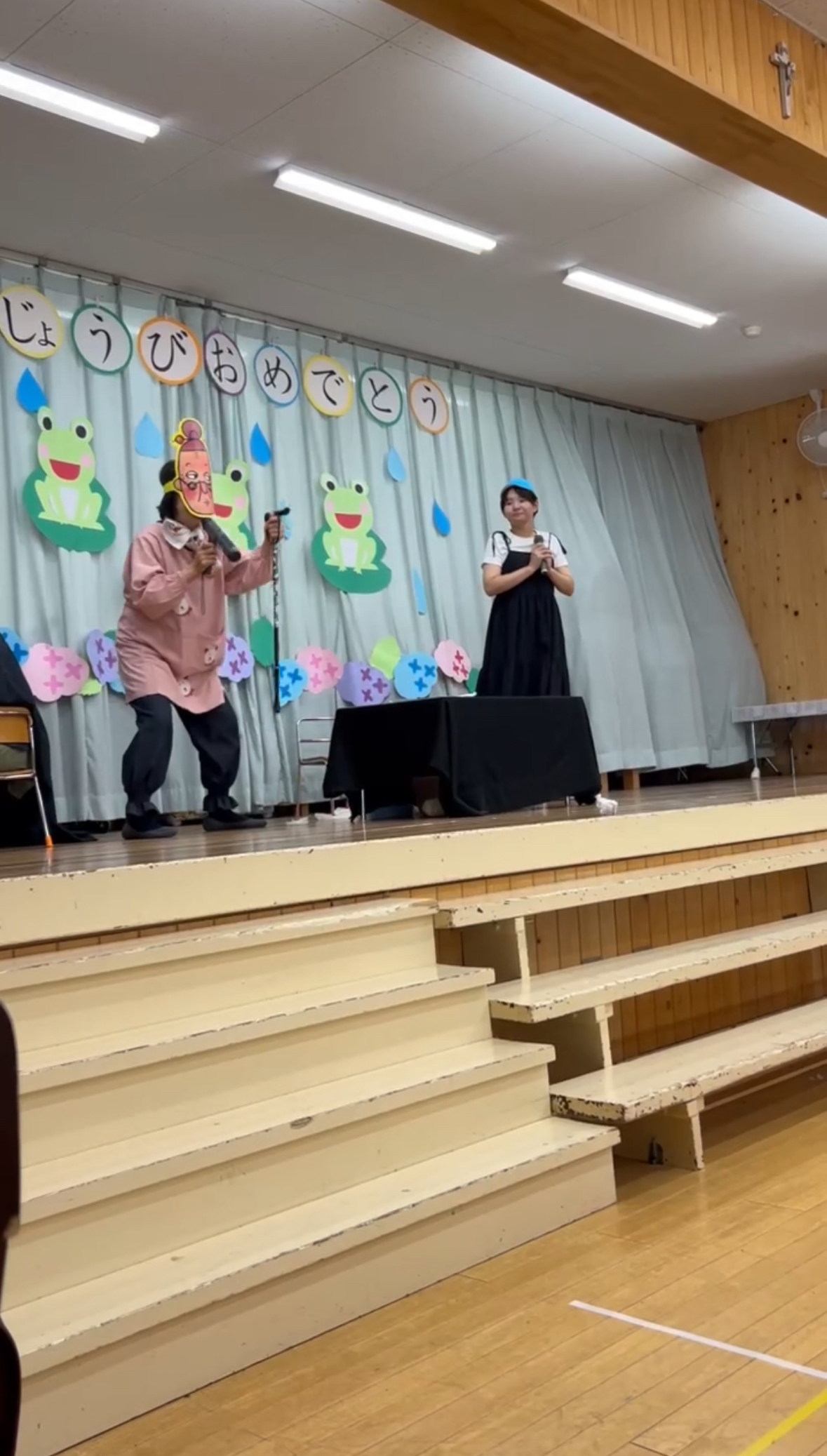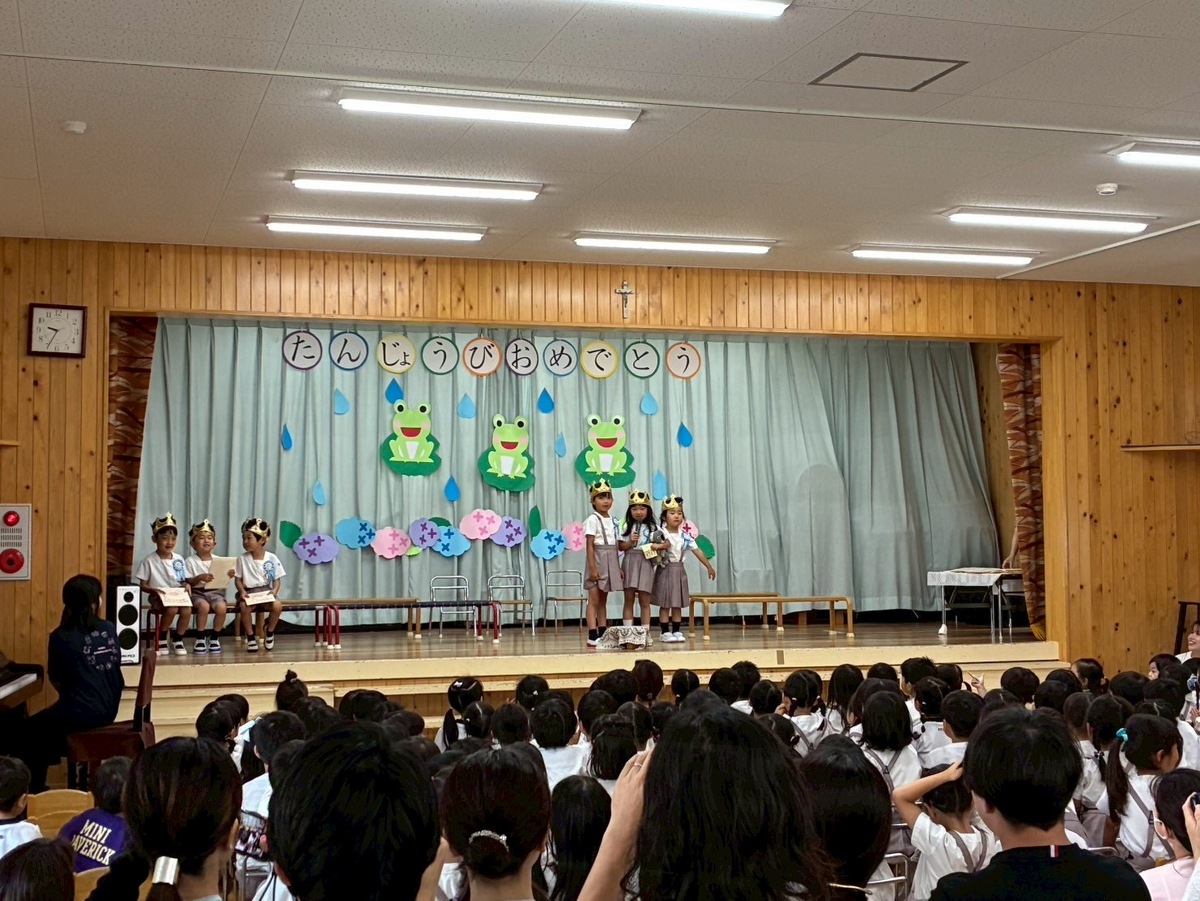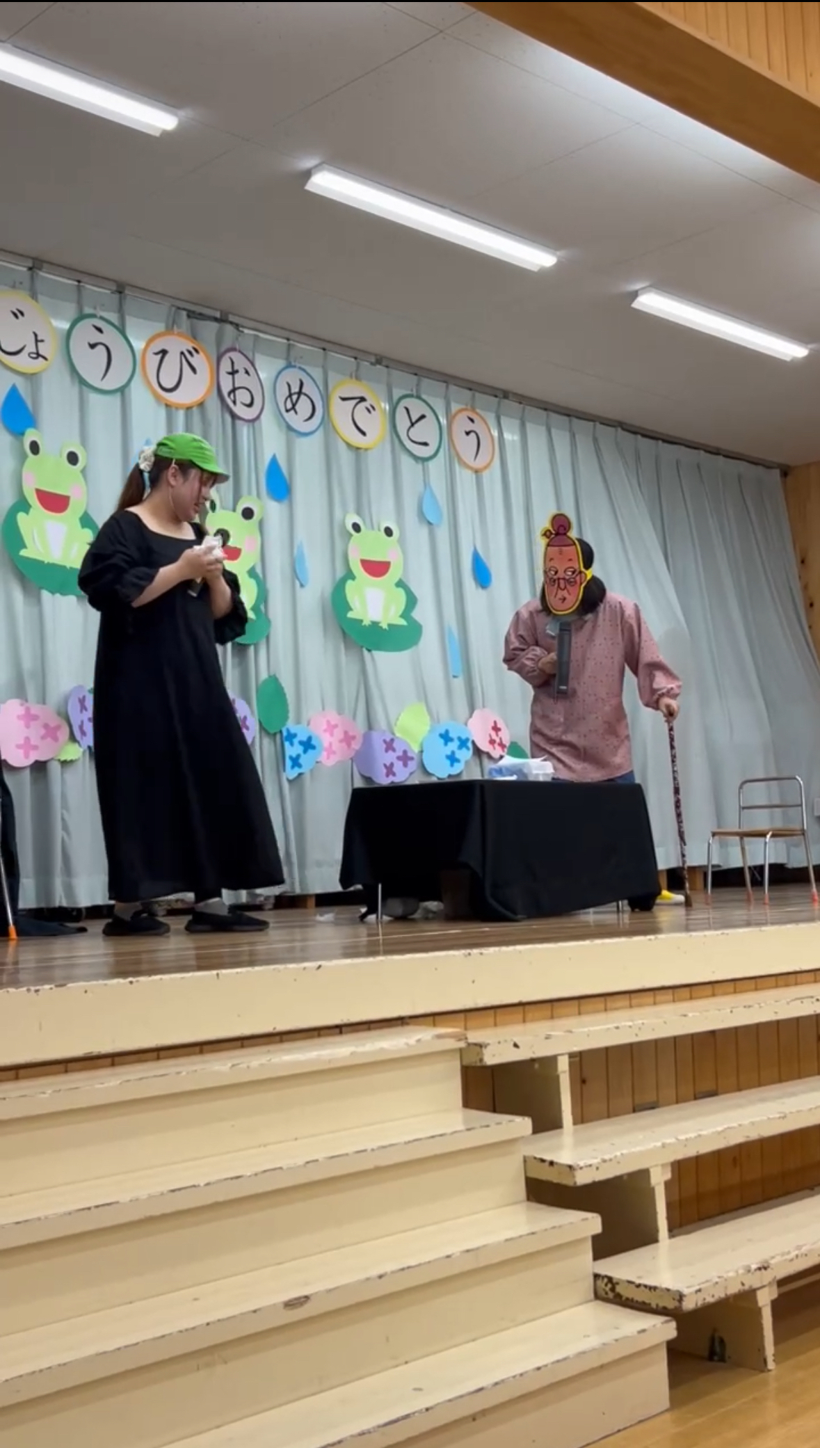 6月の誕生会がありました! 2025年07月04日(金) 6月生まれの誕生会がありました⭐︎ ドキドキしながらもマイクを持って一生懸命発表できました‼︎ 6月生まれのお友だちたくさんいましたね♫ 今月のお楽しみは、先生達による『もったいないばあさん』の劇でした✴︎ 水の出しっ放し、石鹸の使いすぎ、ペーパータオルの使いすぎ、もったいないことしてませんか!? 「ありがとう」の言葉を使ってあったかい気持ち♡になれていますか!? もったいないばあさんが怒らないように!もったいないをみんなで、なくしていきましょうね♪
