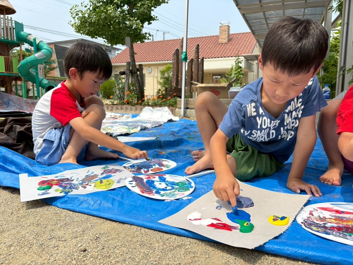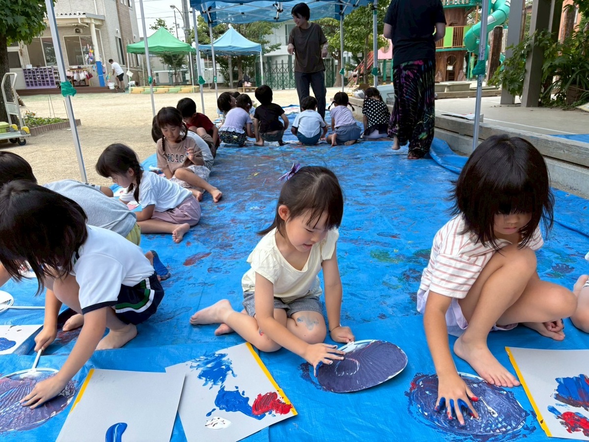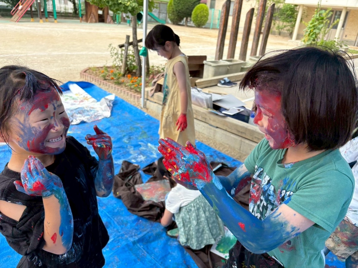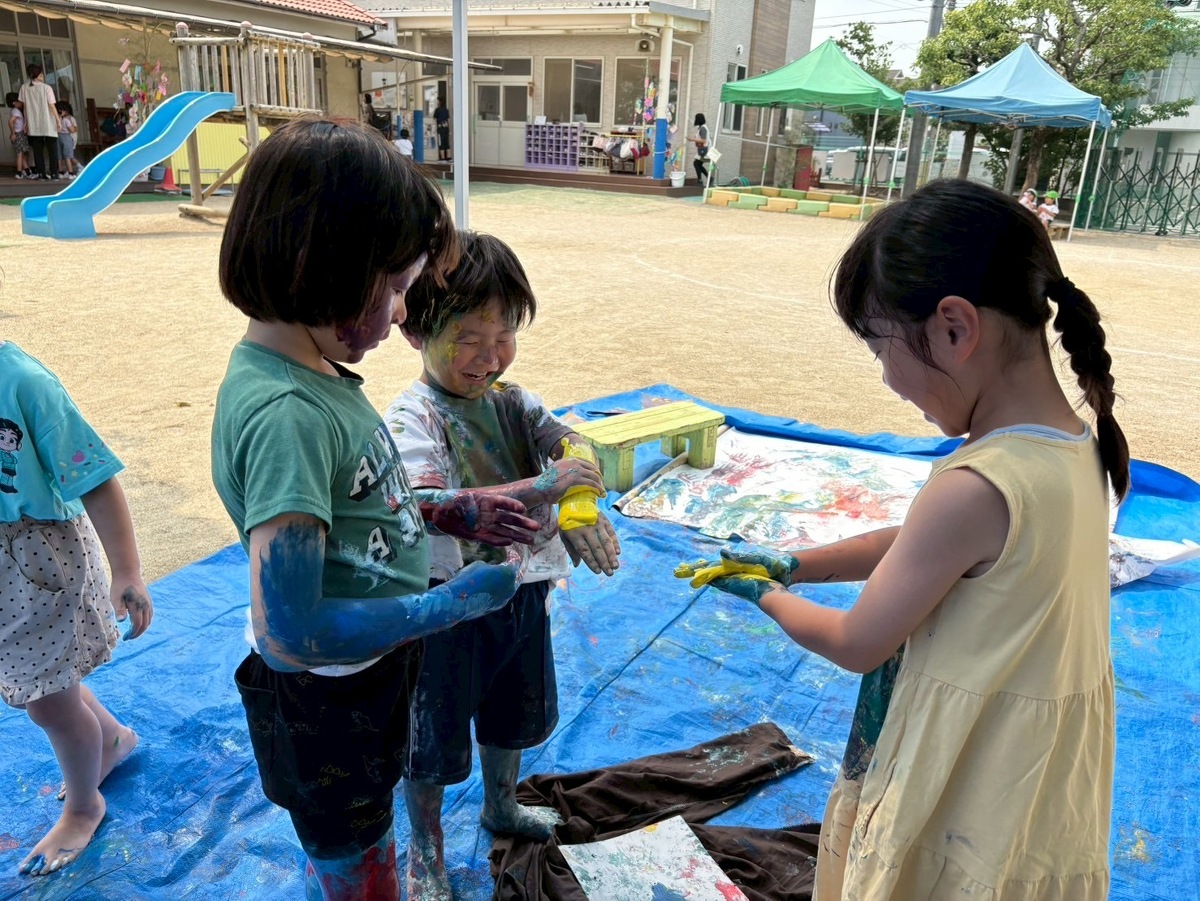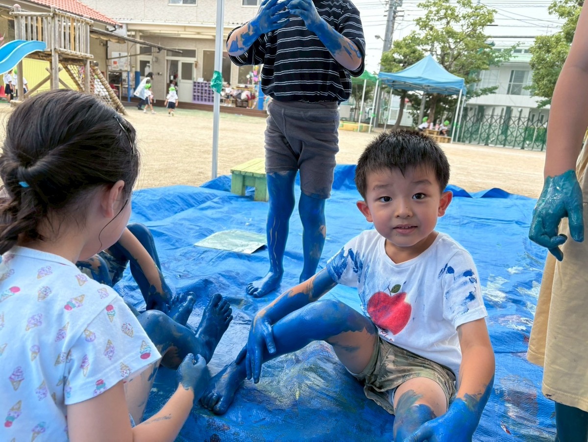 「ぬるぬるする」「気持ちいいねー」と、絵の具を身体全体で感じることができた子どもたち!