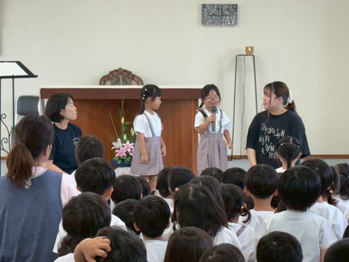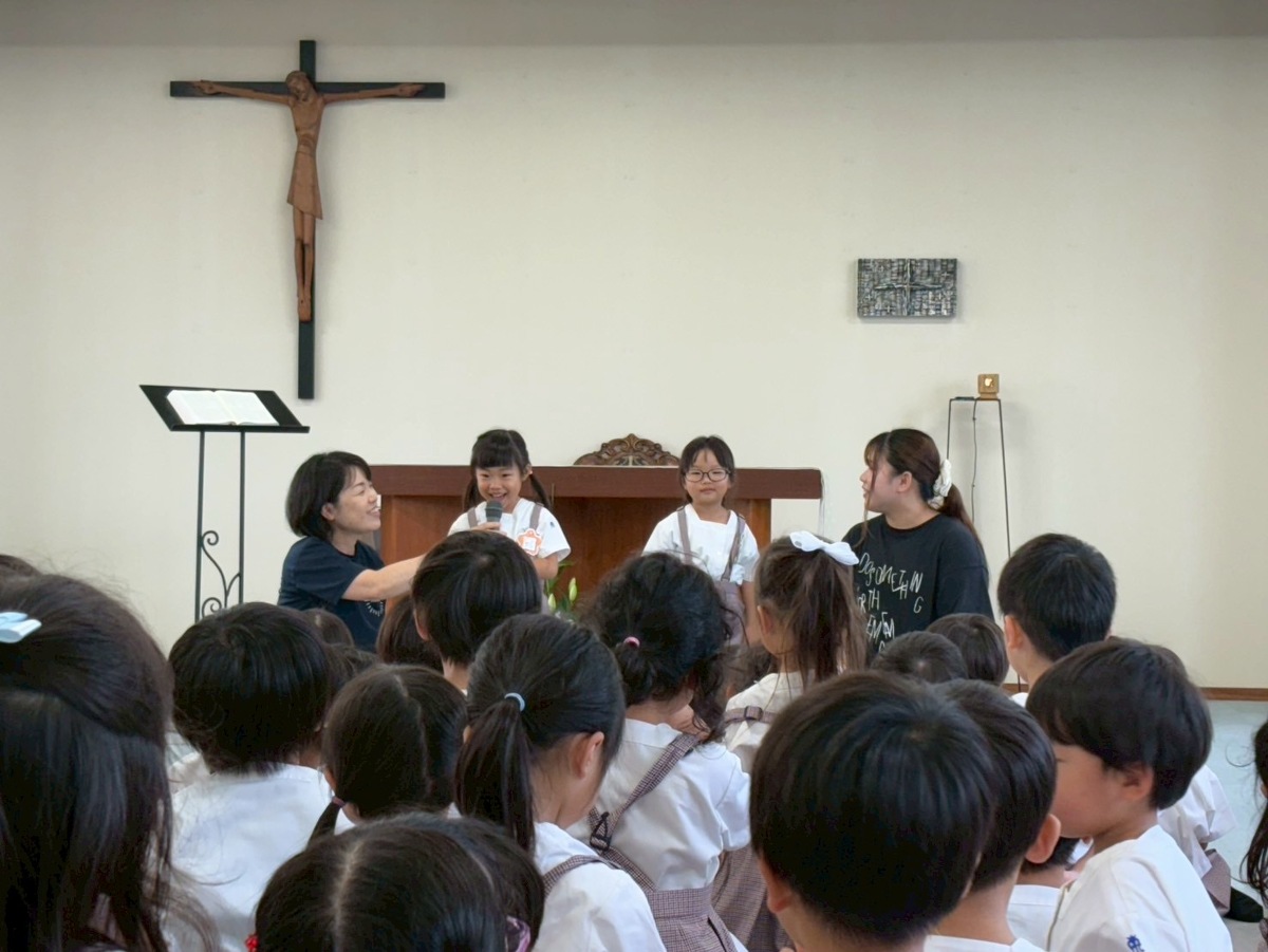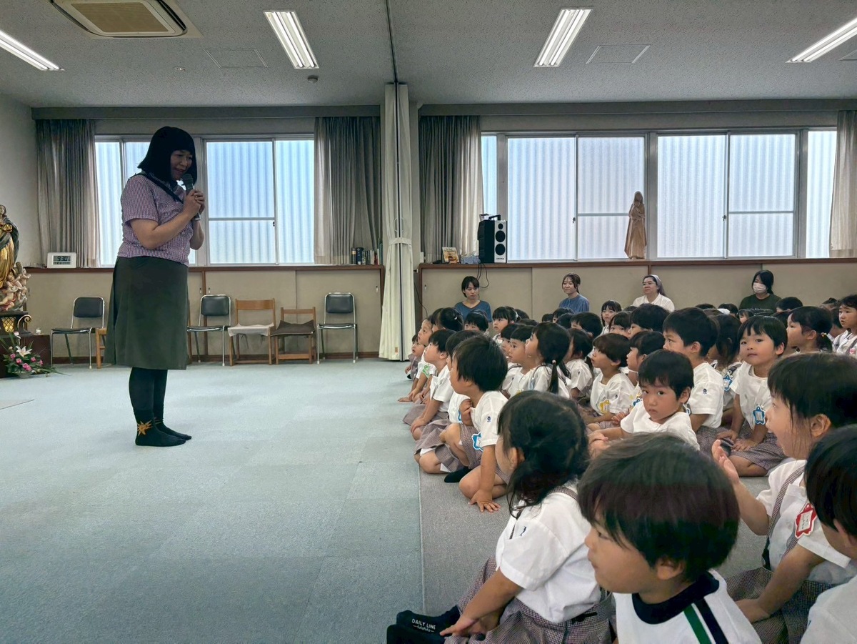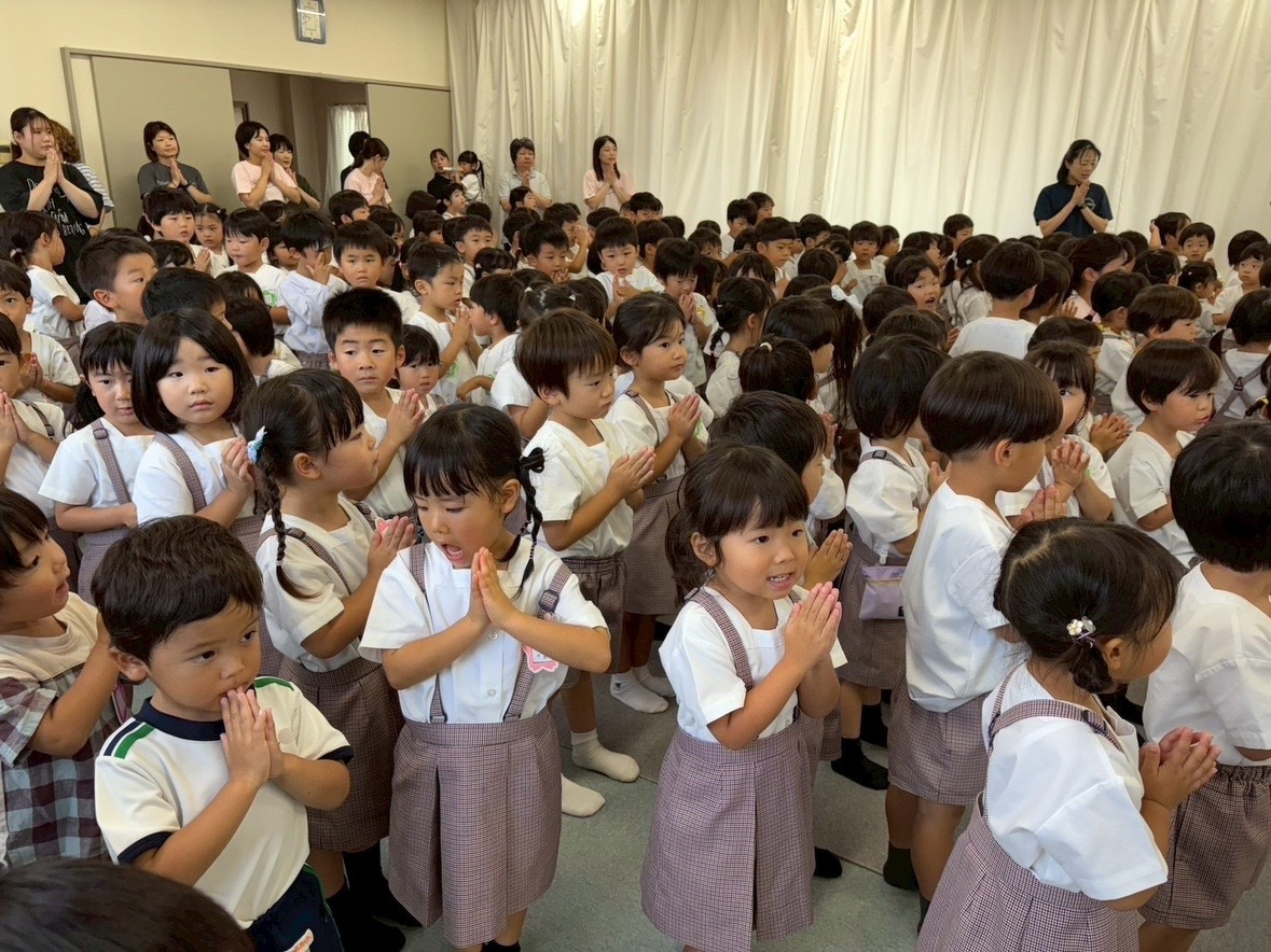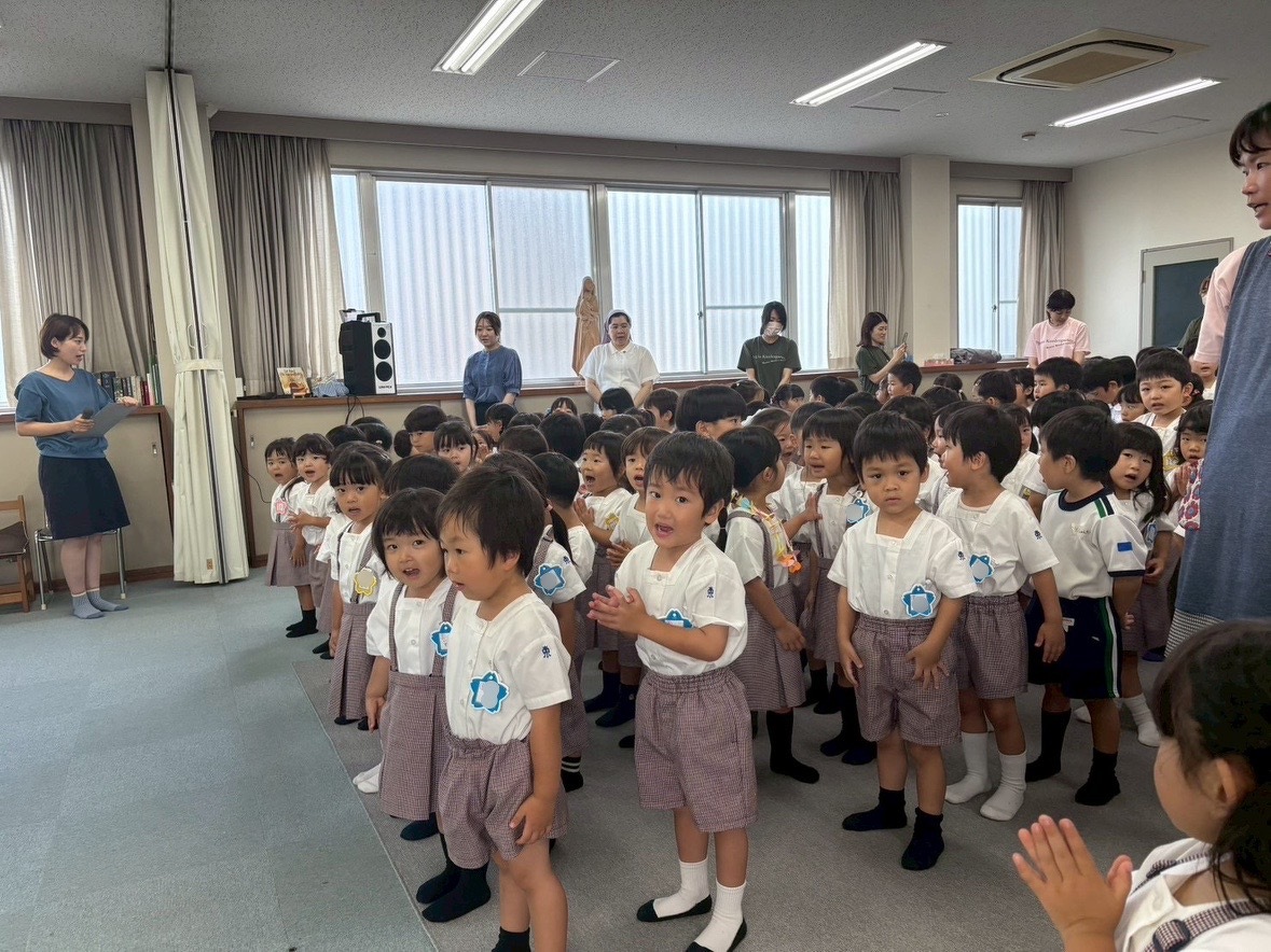 1学期の終業式を行いました 2025年08月08日(金) 1学期の終業式が行われました。 まずは園歌と聖歌を、子どもたちが心を込めて歌いました。 園長先生のお話しでは、1学期の思い出や、夏休みに向けてのお話がありました。子どもたちも園長先生のお話しにしっかり耳を傾けていました‼︎ 次に、お引越しするお友達の紹介がありました。新しい幼稚園でも元気いっぱい頑張ってね⭐︎ 新しい先生の紹介もありました!香川先生、これからよろしくお願いします☺︎‼︎ 最後はシスターと一緒にお祈りをしました。 夏休みの間もみんなが元気に、笑顔いっぱいで過ごせますように♡