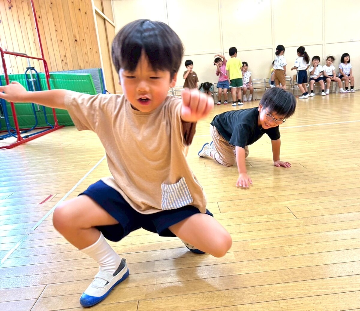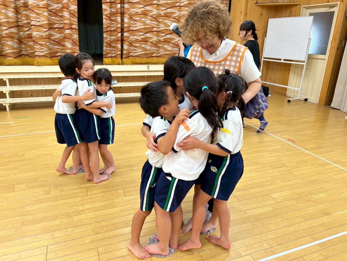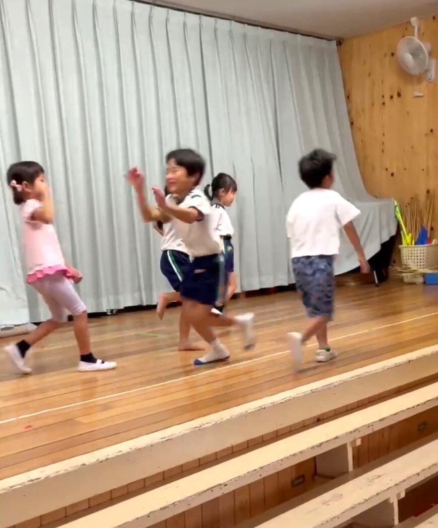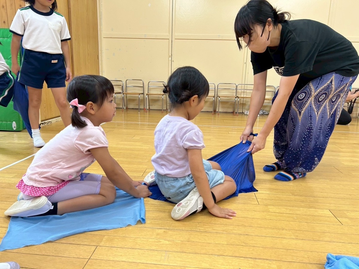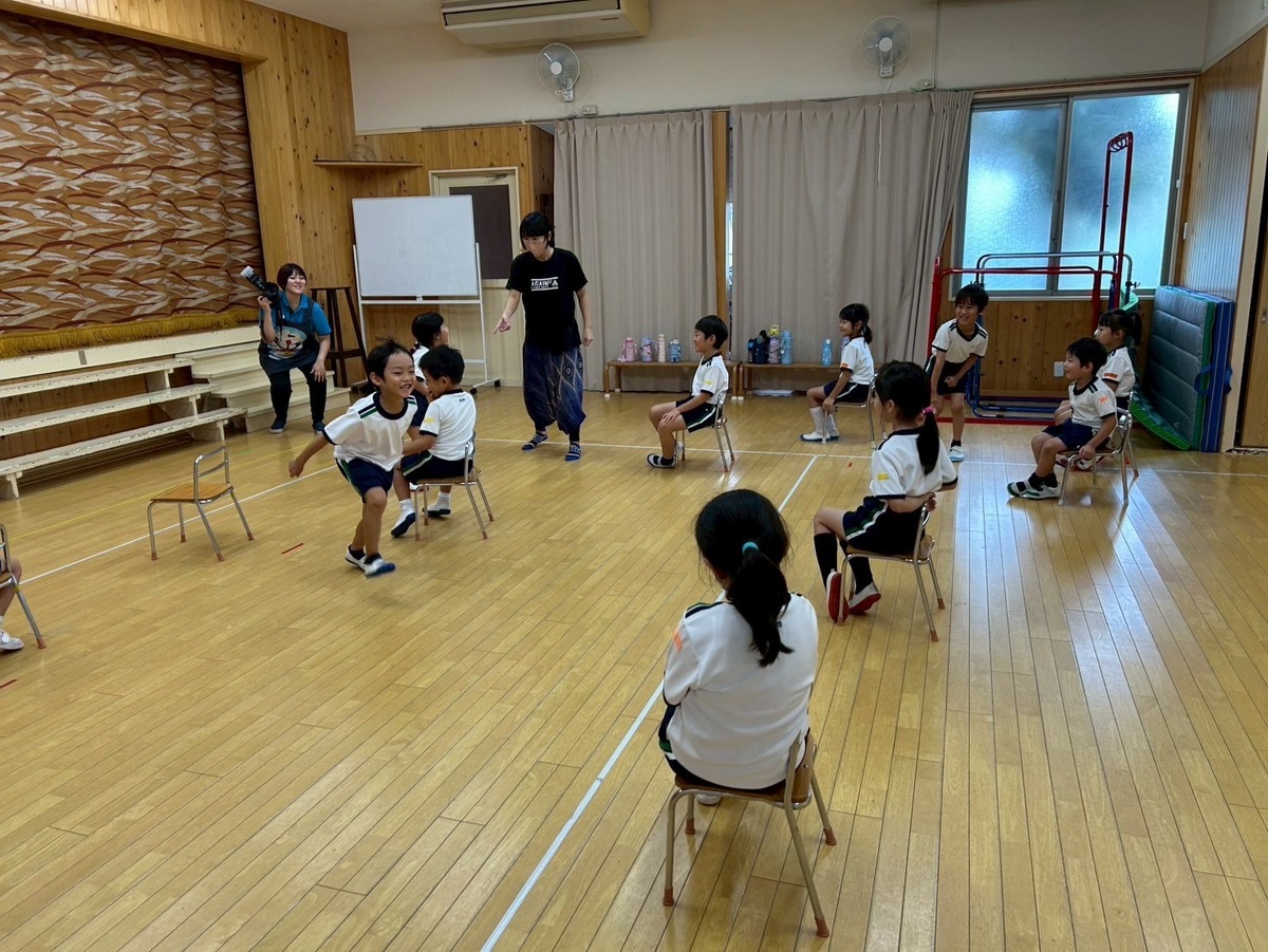 Aグループ(5歳児)のアートがありました! 2025年09月09日(火) 今回は『身体表現』です。 音を出さない合図で椅子取りゲームをしたり、ミキユキ先生の出したお題になりきってプリンで歩いたりやうどんになったり布を自由に使って、遊びました。 最後に、思い思いに演じ子どもたちの笑顔と喜びあふれる時間となりました。 自分を表現する楽しさを感じ子どもたちの心も大きく育っています。 ミキユキ先生、いつも楽しい時間をありがとうございます。