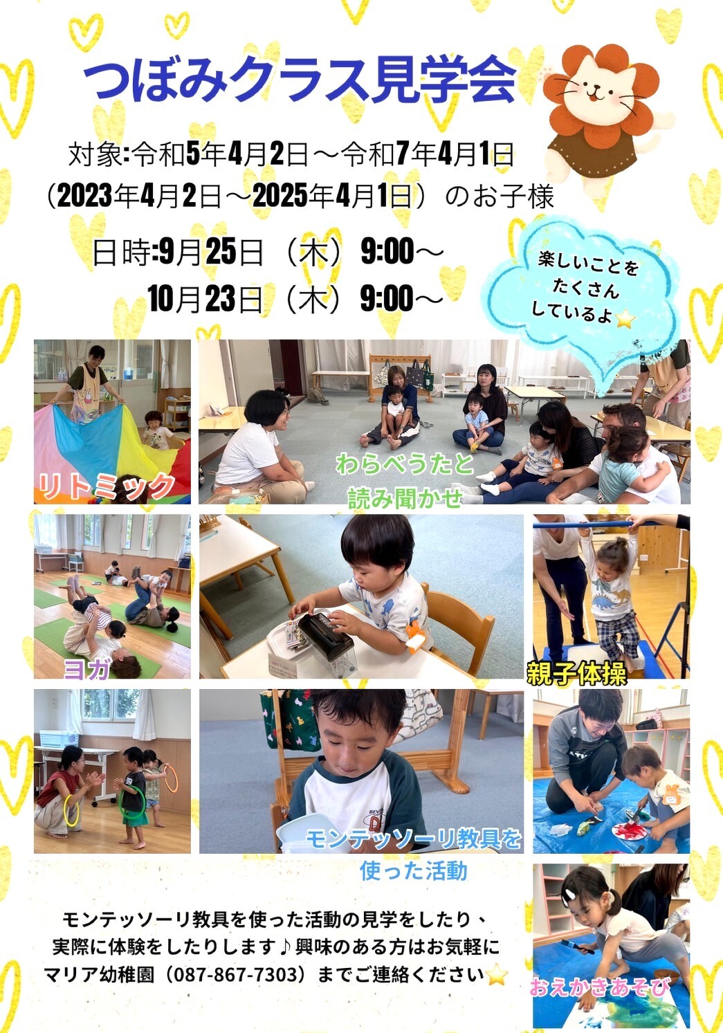 令和8年度『つぼみクラス』の見学会を行います。 2025年09月22日(月) 『子育ての毎日に、少しの安心とたくさんの笑顔を』 マリア幼稚園の子育て支援「つぼみ・プチつぼみクラス」では、お子さまの成長を一緒に喜び合い、 保護者の方もほっとできる時間を大切にしています。 あたたかな出会いと優しいつながりが、ここにはあります。 ぜひ一度、あそびに来てくださいね。